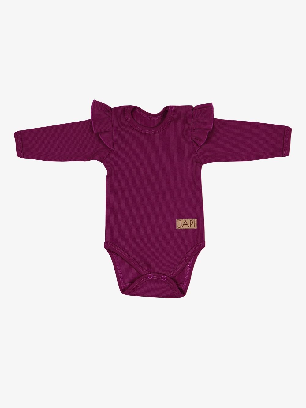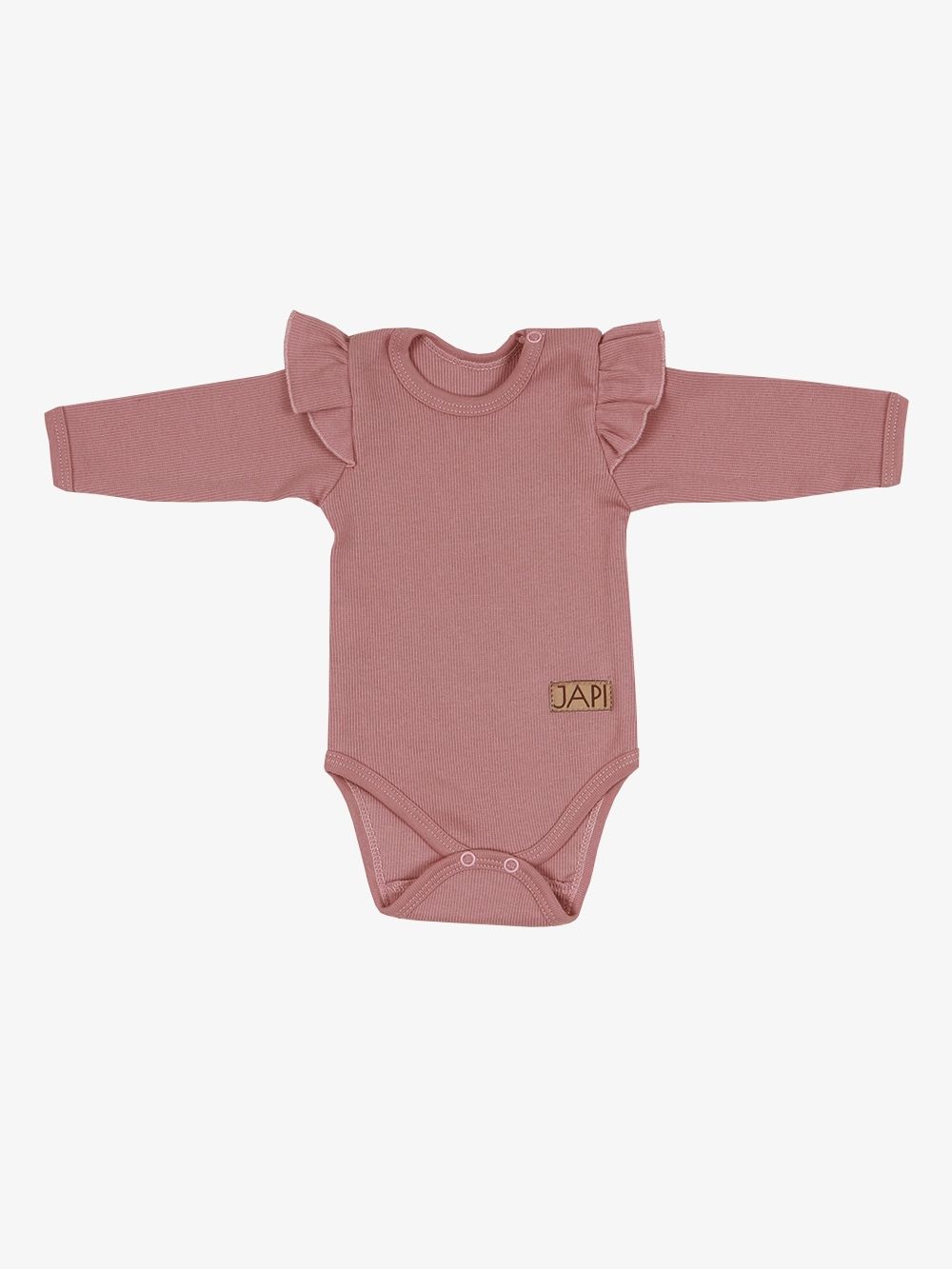 Ženski dječji bodi s dugim rukavima smo dopunili volanima na ramenima. Bodi je šivan od 100% certificiranog pamuka. Materijal je ugodno rebrasto pletivo, koje će Vam se svidjeti. Ugodan je za dječju kožu. Bodi se raskopčava između nogu pomoću metalnih gumbova za jednostavno mijenjanje pelena. Također i oko vrata ima mogućnost zakopčavanja na metalne gumbove, što osigurava da bodi ne pada.