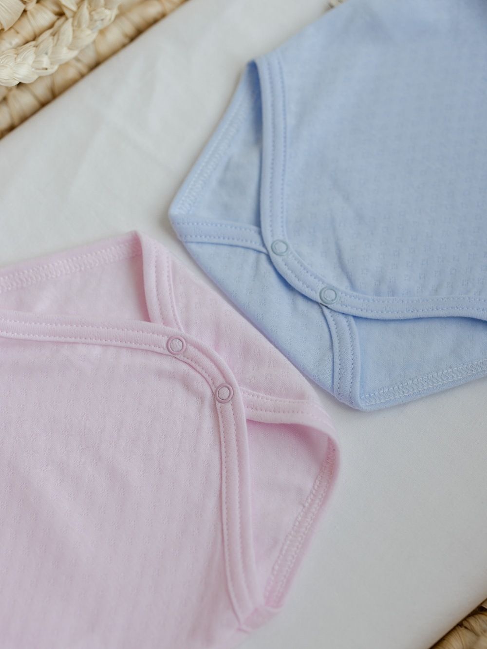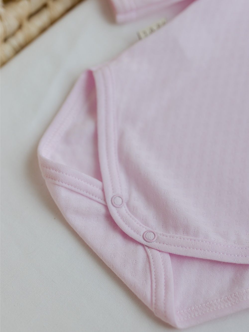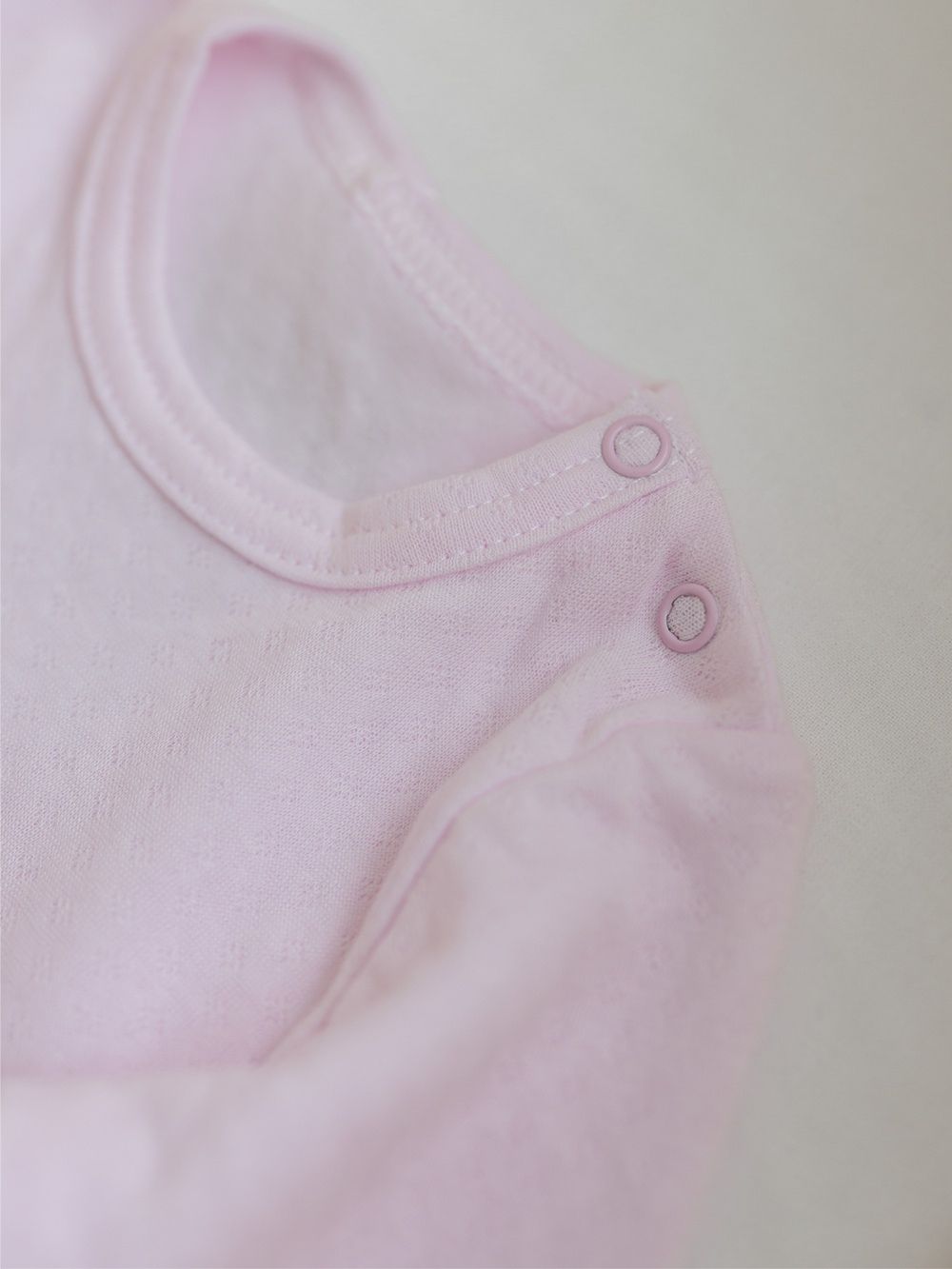 Omiljeni komad za najmlađe u klasičnoj bijeloj ili nježno ružičastoj i plavoj boji. Materijal ima fini uzorak. Bodi ima obrub oko vrata, rukava i nogavica. Otvara se kopčanjem oko vrata.