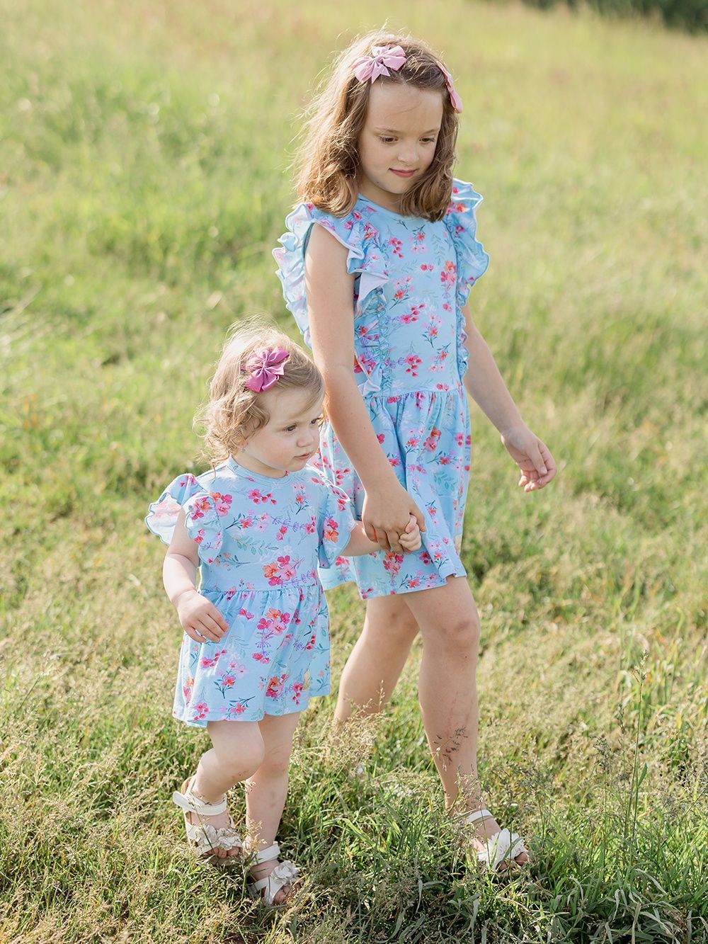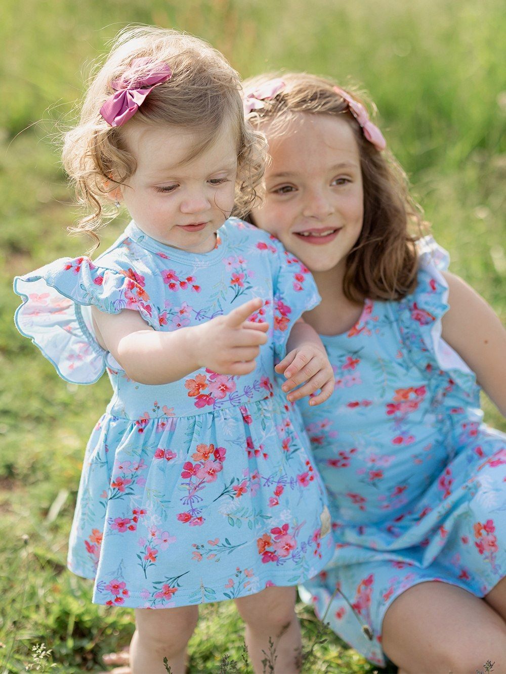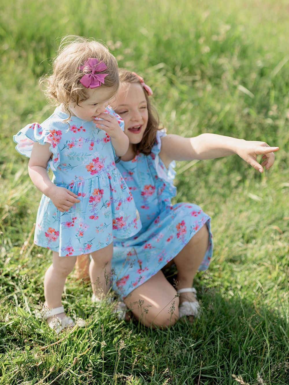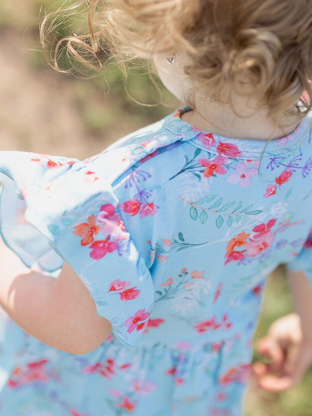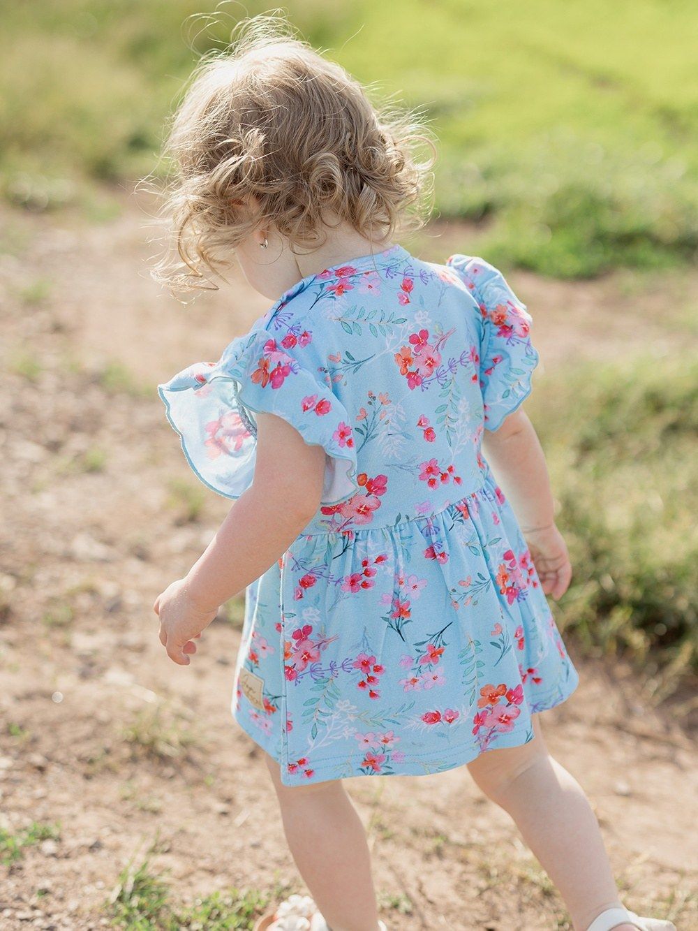 Ova dječja haljina je lijepa i praktična. Ima ušiveni donji dio tijela koji onemogućuje smotanje i drži pelenu na mjestu. Bodi haljine smo izradili od pamučne tkanine s certifikatom te su stoga primjerene i za djecu od rođenja. Na svijetloplavoj pozadini nalazi se prekrasno cvijeće koje ovu haljinu čini jedinstvenim komadom. Rukavi su izrađeni od volana koji zaokružuju cijeli look.