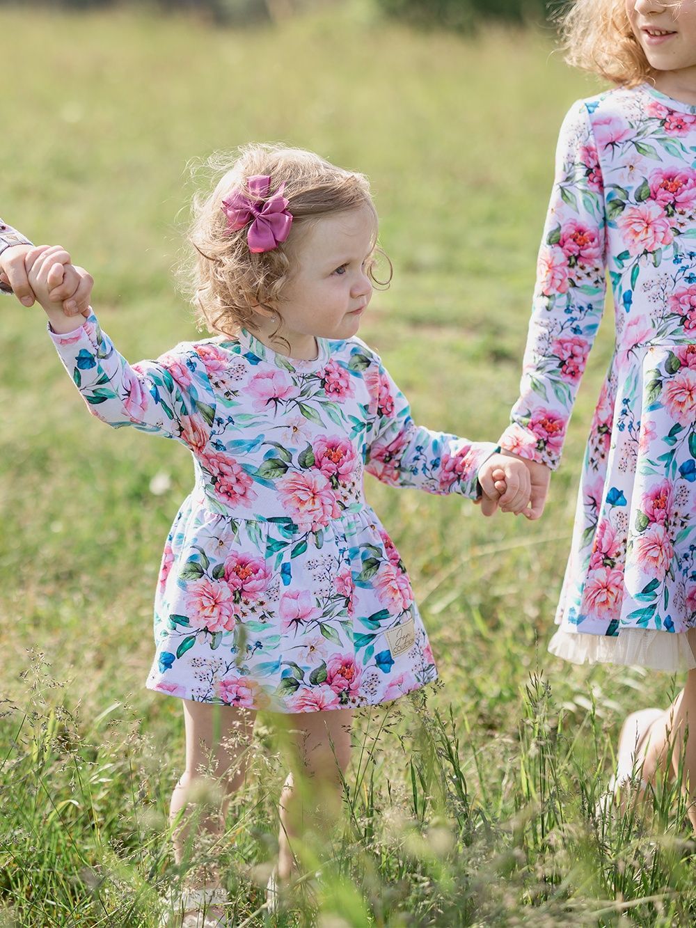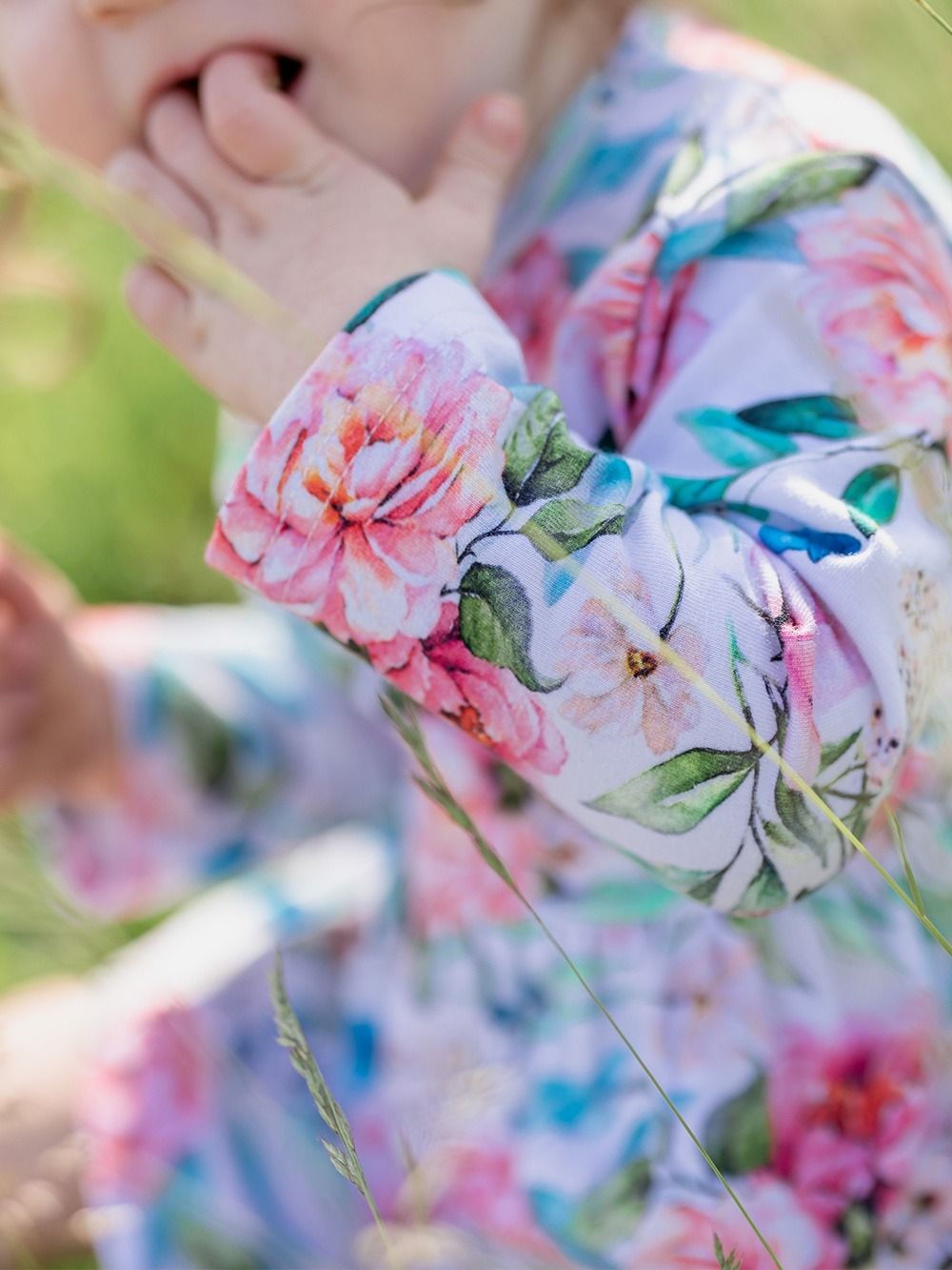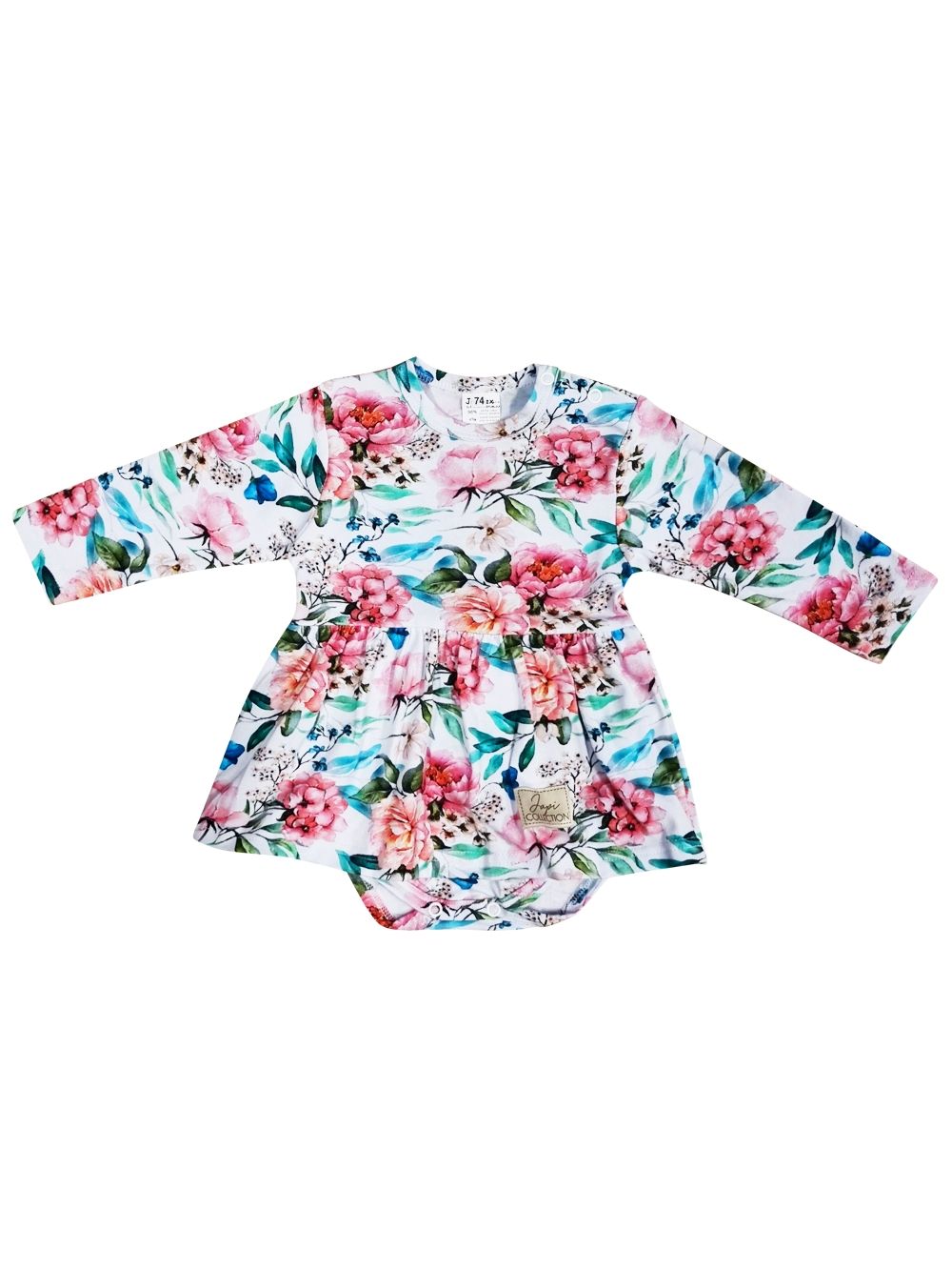 Bodi haljinice namijenjene su najmanjim djevojčicama. Izradili smo ih od pamučne tkanine s cvjetnim uzorkom. Božuri i zeleno lišće lijepo se ističu na bijeloj pozadini. Izgledaju nježno i romantično. Kroj je vrlo praktičan i udoban. Imaju kvalitetan rub, koji ne pritišće i ne grebe djecu. Ispod suknje koja je ušivena u struku nalazi se donji dio bodija. Otvaranje pomoću kopči olakšava mijenjanje pelena.