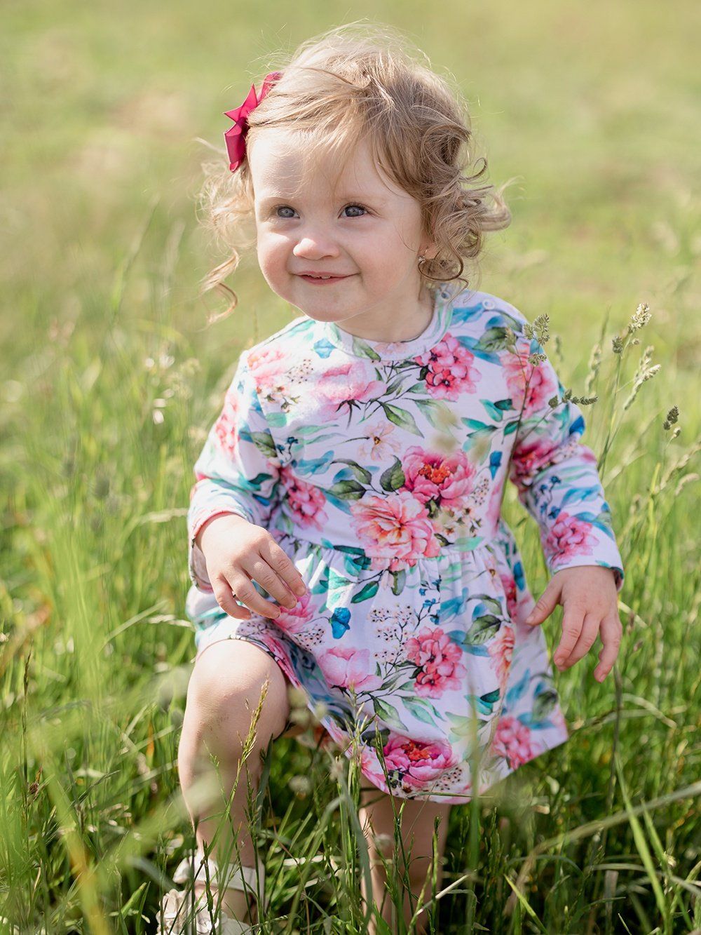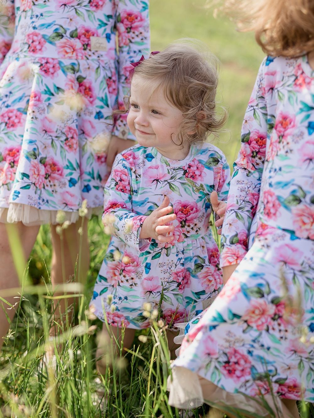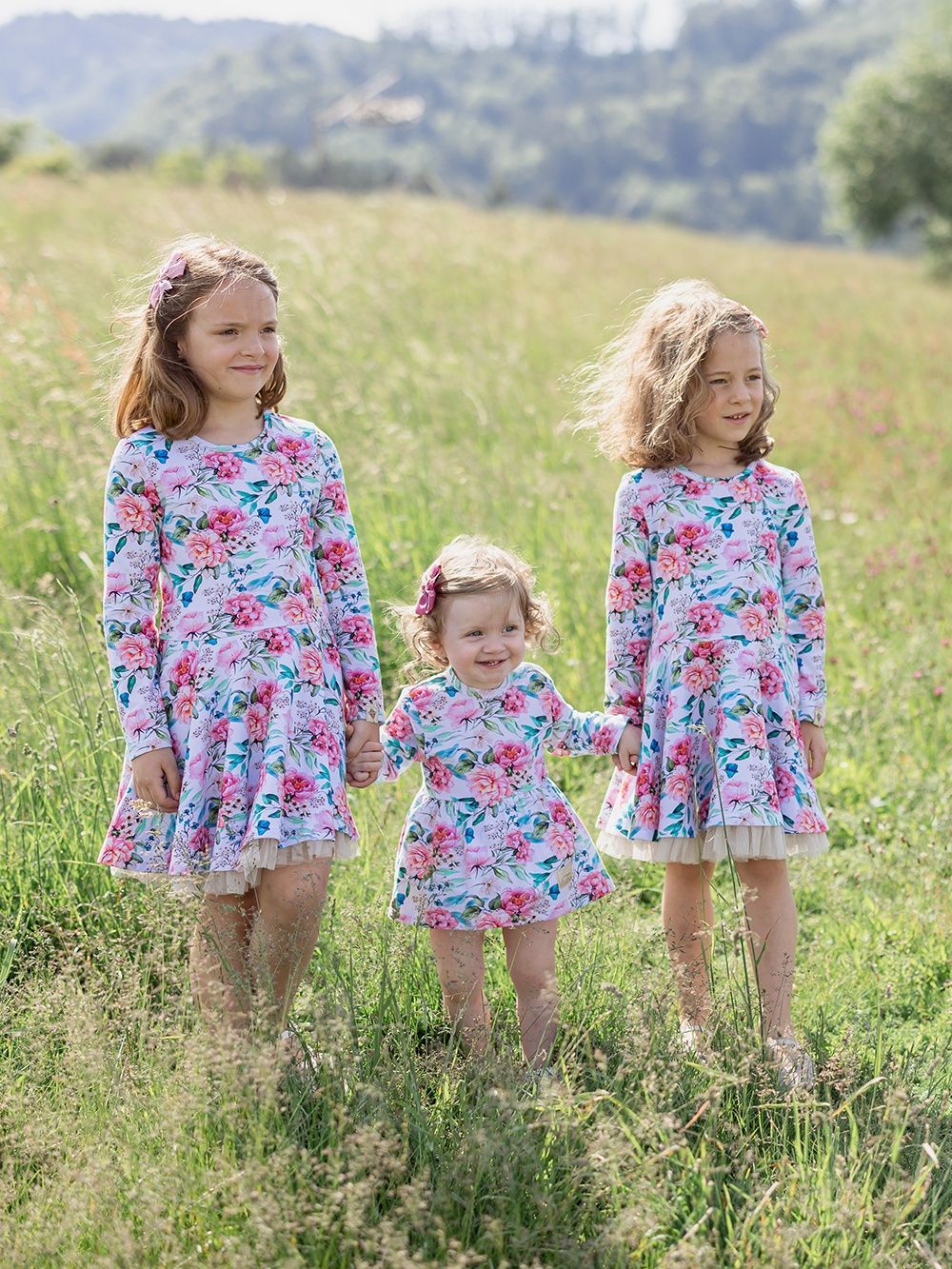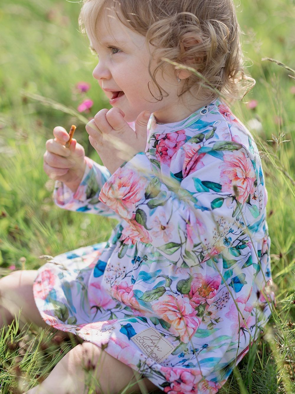 Bodi haljinice namijenjene su najmanjim djevojčicama. Izradili smo ih od pamučne tkanine s cvjetnim uzorkom. Božuri i zeleno lišće lijepo se ističu na bijeloj pozadini. Izgledaju nježno i romantično. Kroj je vrlo praktičan i udoban. Imaju kvalitetan rub, koji ne pritišće i ne grebe djecu. Ispod suknje koja je ušivena u struku nalazi se donji dio bodija. Otvaranje pomoću kopči olakšava mijenjanje pelena.