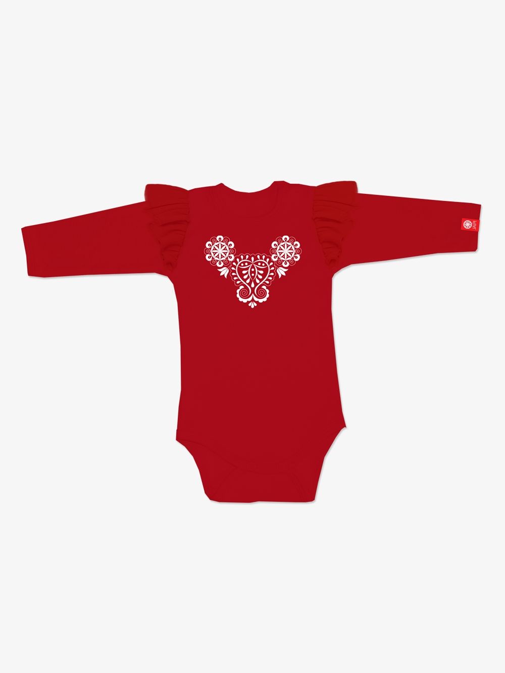 Lijepe dječje bodi sa dugim rukavima i narodnim vezom. Bodiji su izrađene od certificiranih materijala. Imaju lijepe volane na ramenima, vez na prednjoj stranii. Razvili smo simbol zaštite - Perunov cvijet i Čataj vez u obliku srca.