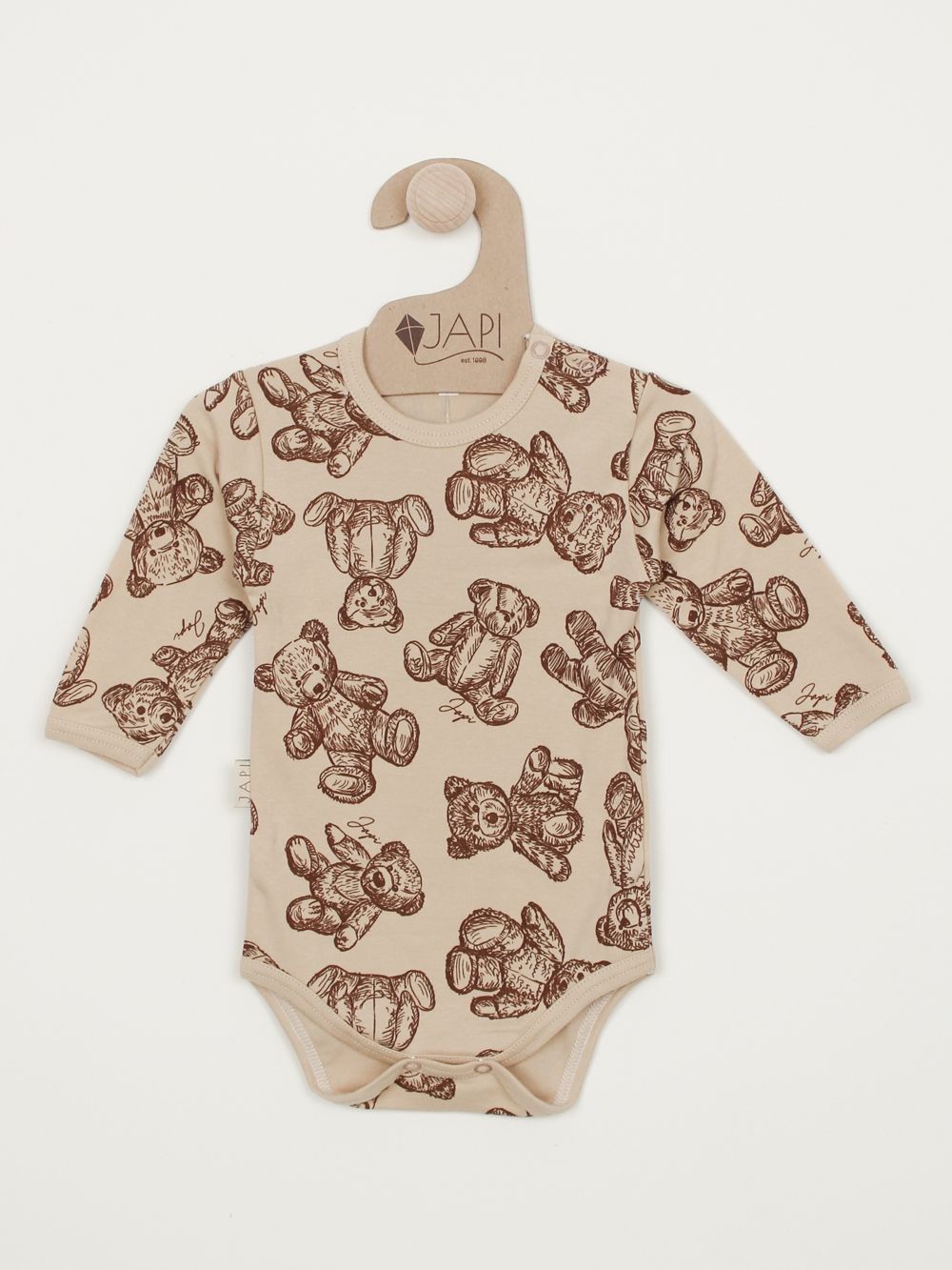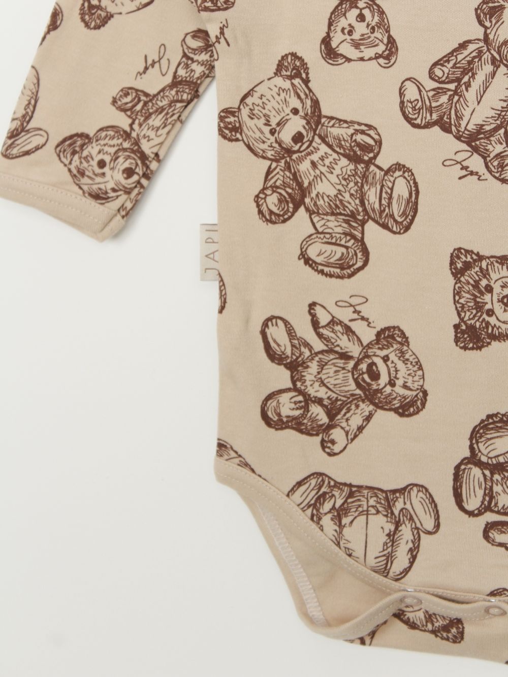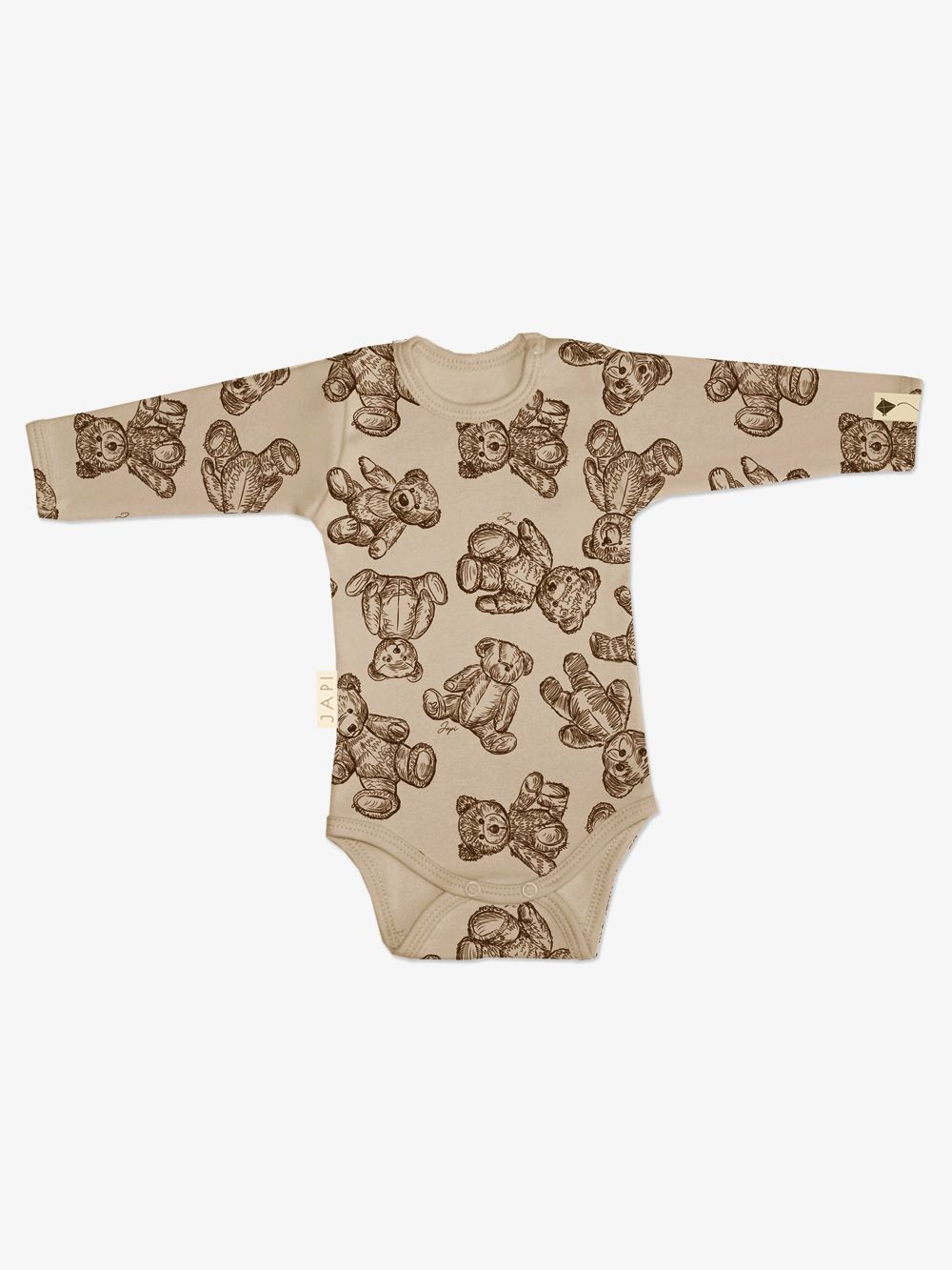Kvalitetne dječje bodove za malu djecu moraju postojati. Bodi je otisnuto našim dizajnom Teddy medvjedića. Otvara se između nogu na kopče, što olakšava oblačenje i mijenjanje pelena. Ovaj dječji bodi možete pronaći u bež, plavoj i ružičastoj boji. Za hladnije dane možete koristiti pamučne bodije dugih rukava.
