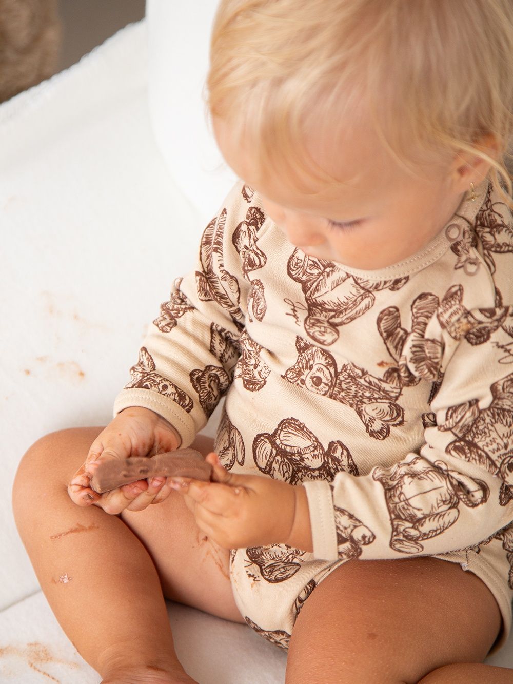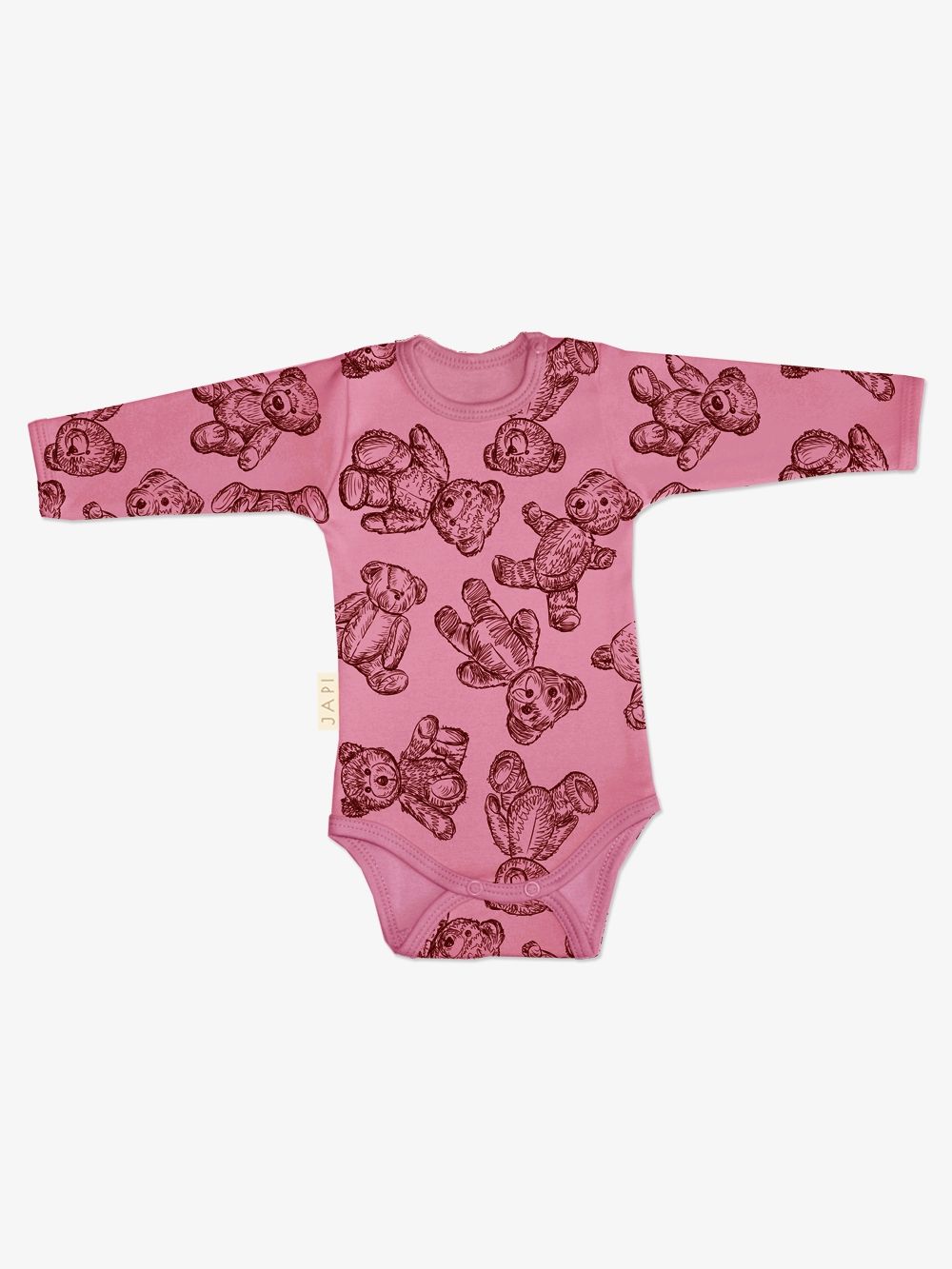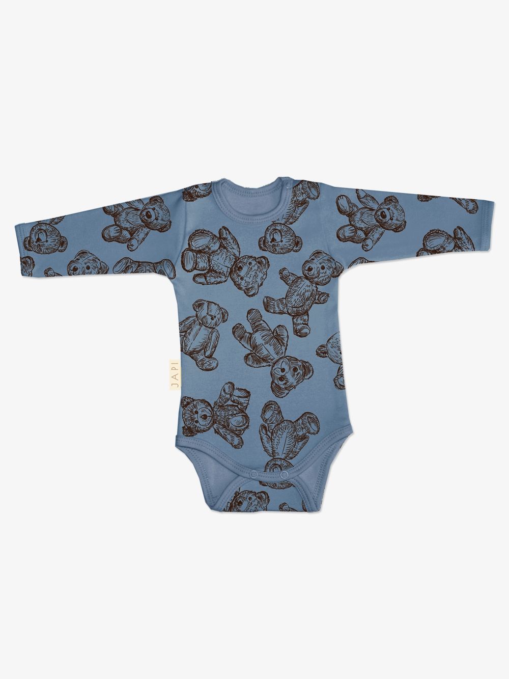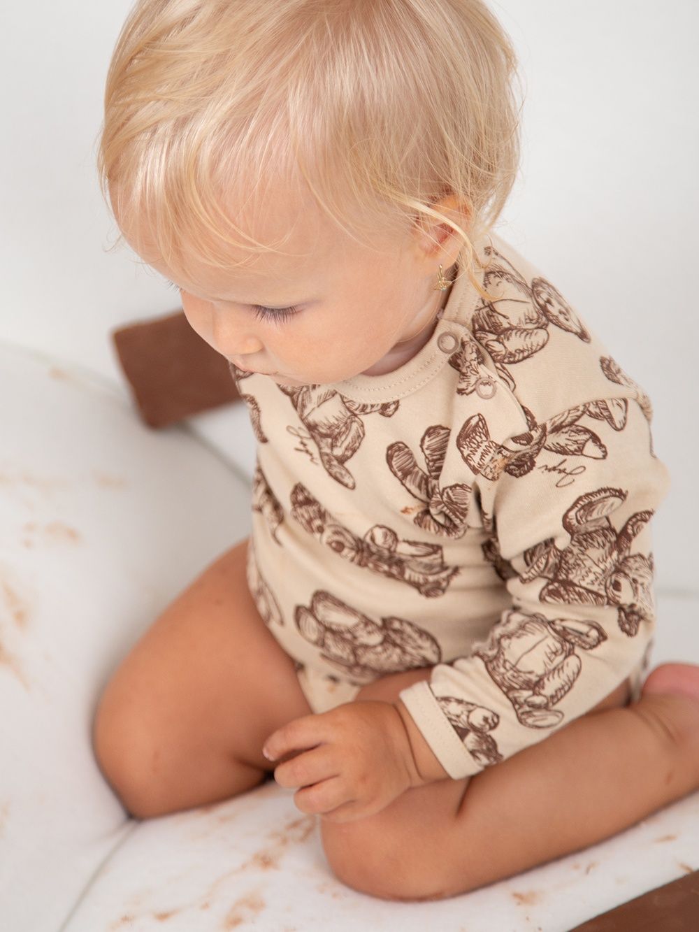 Kvalitetne dječje bodove za malu djecu moraju postojati. Bodi je otisnuto našim dizajnom Teddy medvjedića. Otvara se između nogu na kopče, što olakšava oblačenje i mijenjanje pelena. Ovaj dječji bodi možete pronaći u bež, plavoj i ružičastoj boji. Za hladnije dane možete koristiti pamučne bodije dugih rukava.