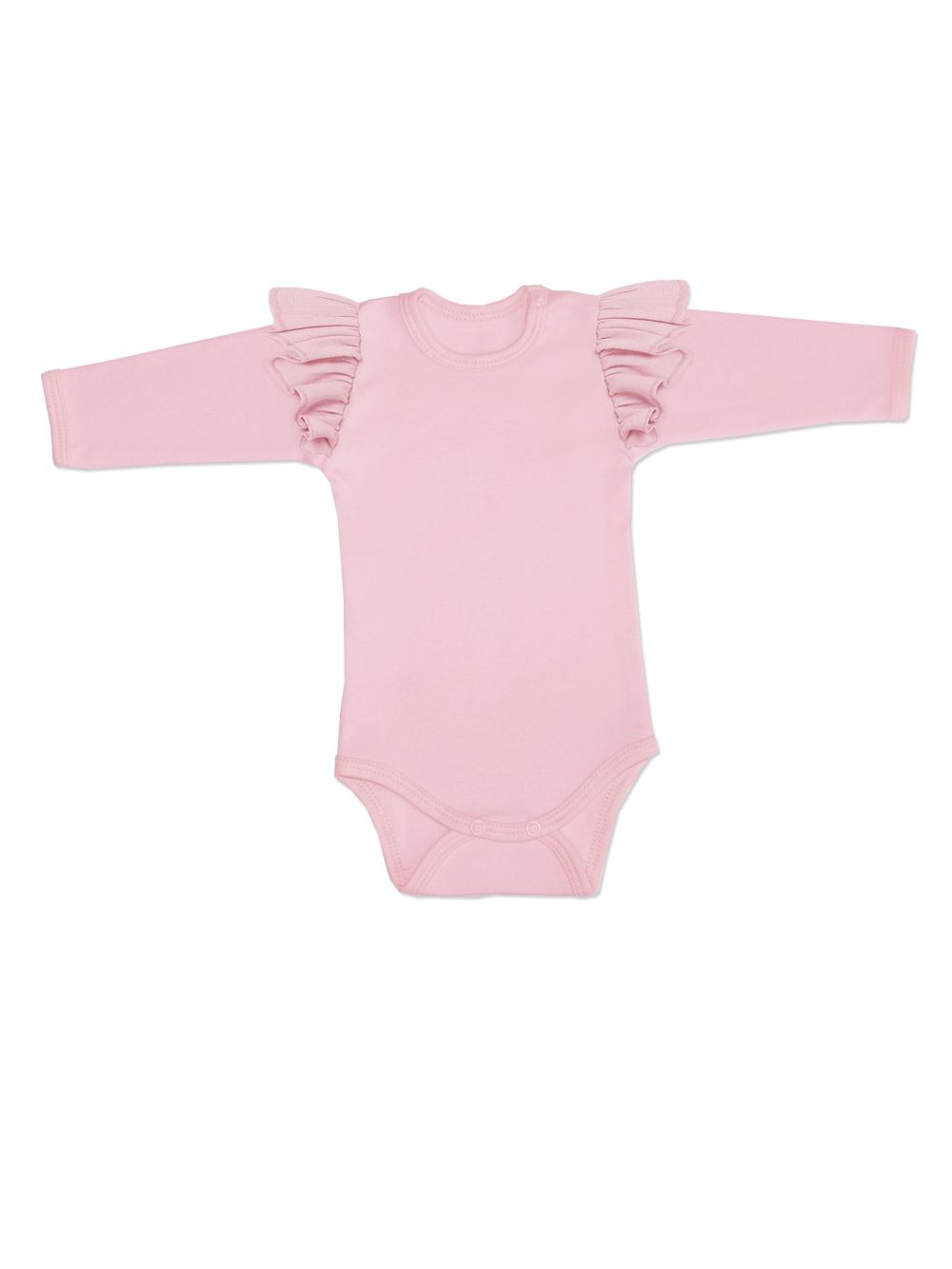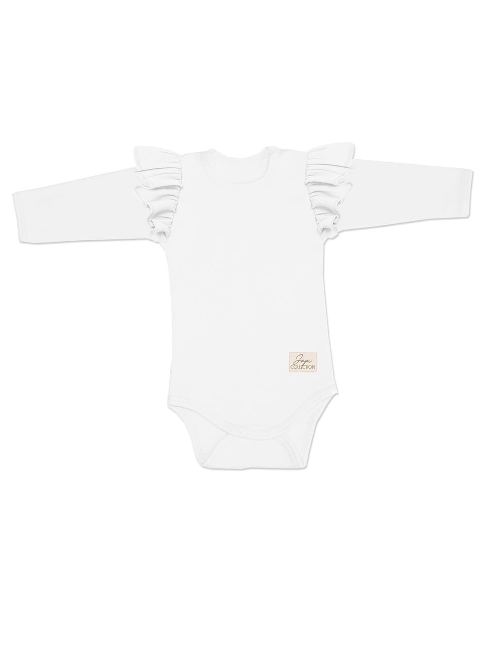 Bodi, koji je osnova dječje garderobe. Sašili smo bijele ili puter bodije dugih rukava od 100% pamučne tkanine sa certifikatom. Stoga je pogodan za djecu od rođenja. Bodiji imaju ukrasne volane na ramenima. Kopčaju se kopčama između nogu, što je zgodno prilikom mijenjanja pelena bebi. Bodi ima kvalitetan rub koji ne grebe i ne gura bebu.