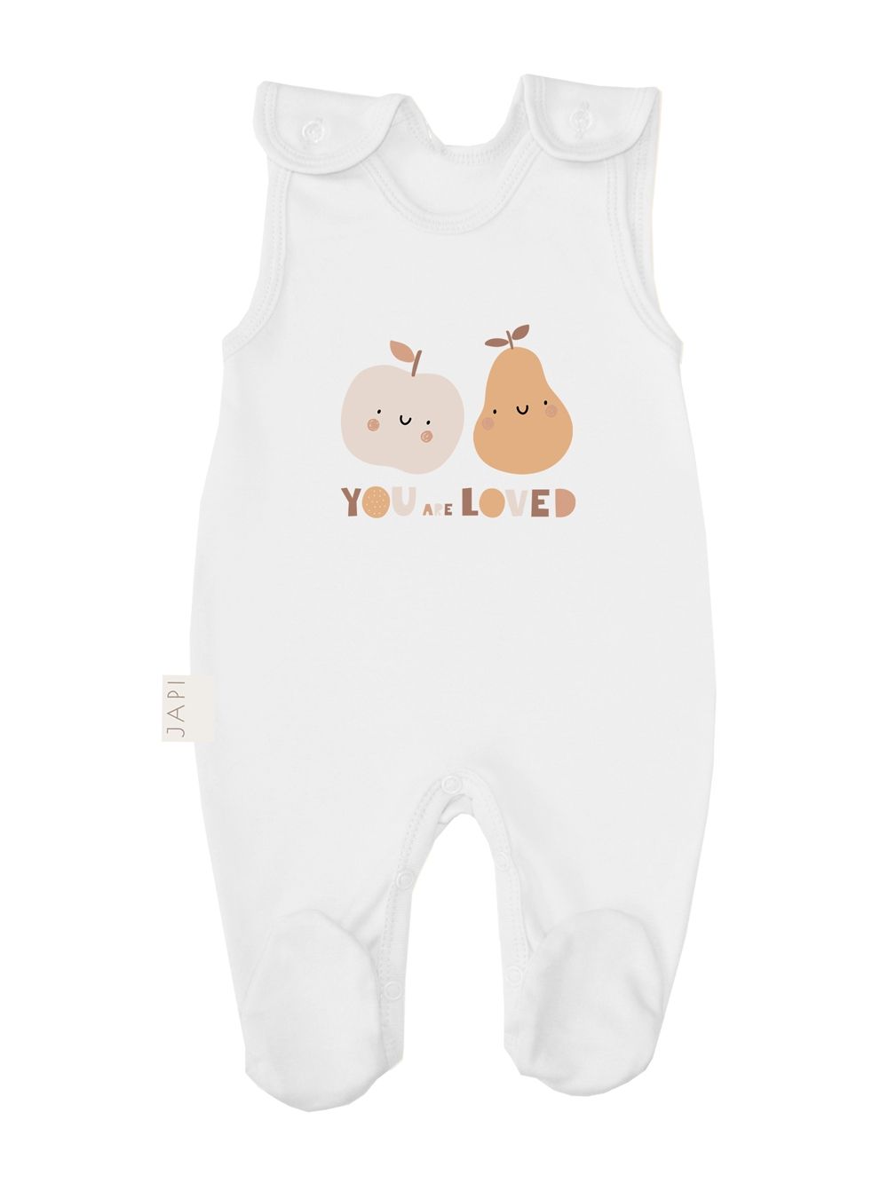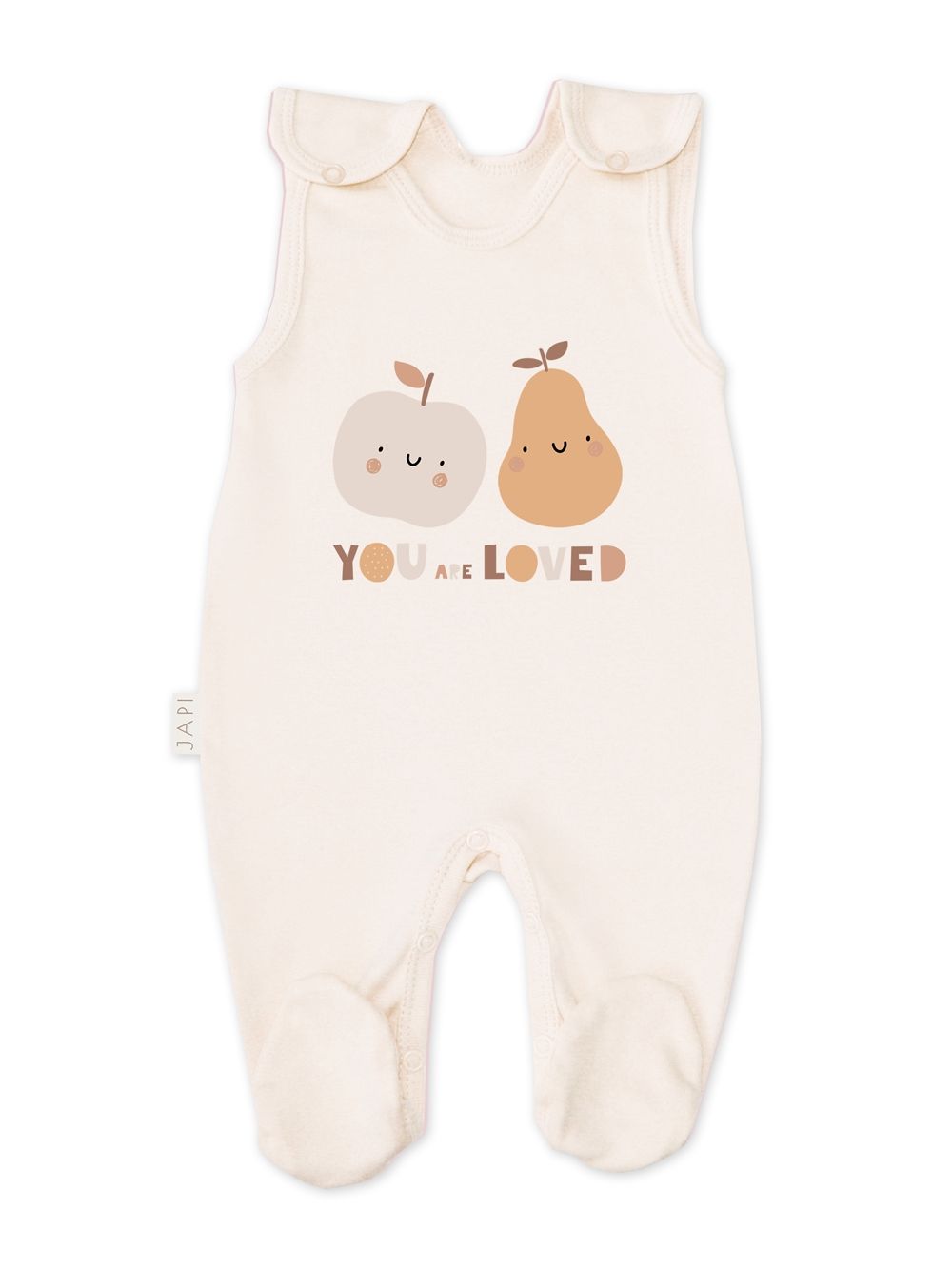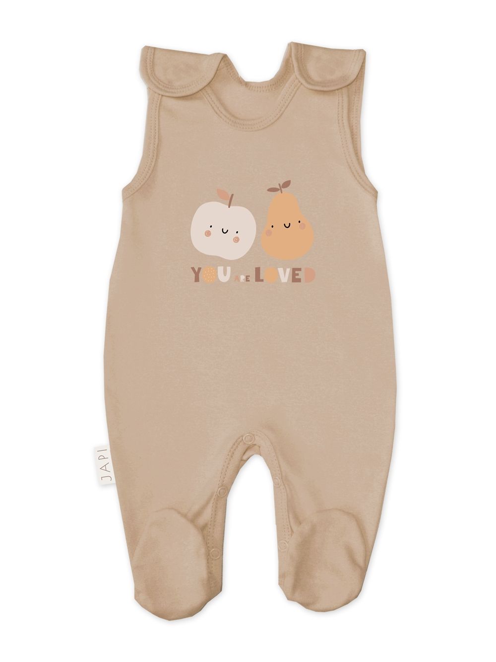 Ovaj pamučni bebi odijelo iz kolekcije FRUITS izrađen je od visokokvalitetnog, mekog pamuka, pružajući maksimalnu udobnost bebi. Široke naramenice i praktično kopčanje između nogu olakšavaju oblačenje. Odijelo je ukrašeno slatkim voćnim motivom i natpisom "YOU ARE LOVED", što izražava ljubav i brigu. Idealno za svakodnevno nošenje.
