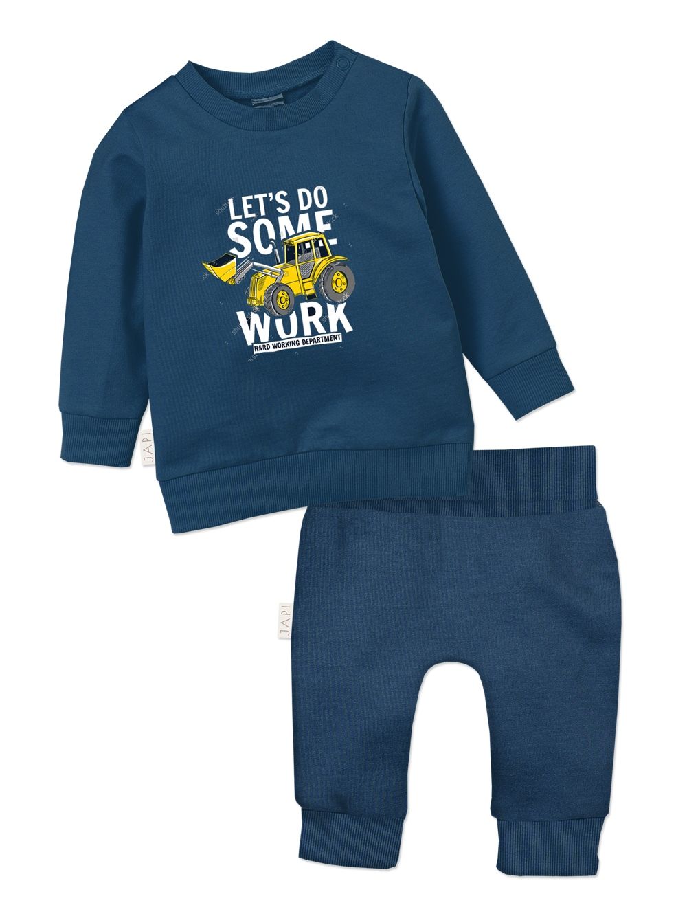 Ovaj dječji set WORK predstavlja praktično i udobno rješenje za aktivnu djecu. Sastoji se od mekanog pulovera s printom građevinskog vozila i natpisom koji će osvojiti svakog malog graditelja. Elastični manžete na rukavima i hlačama osiguravaju udobnost i dobro prianjanje. Hlače imaju elastični pojas, što olakšava oblačenje i osigurava dobar kroj.
