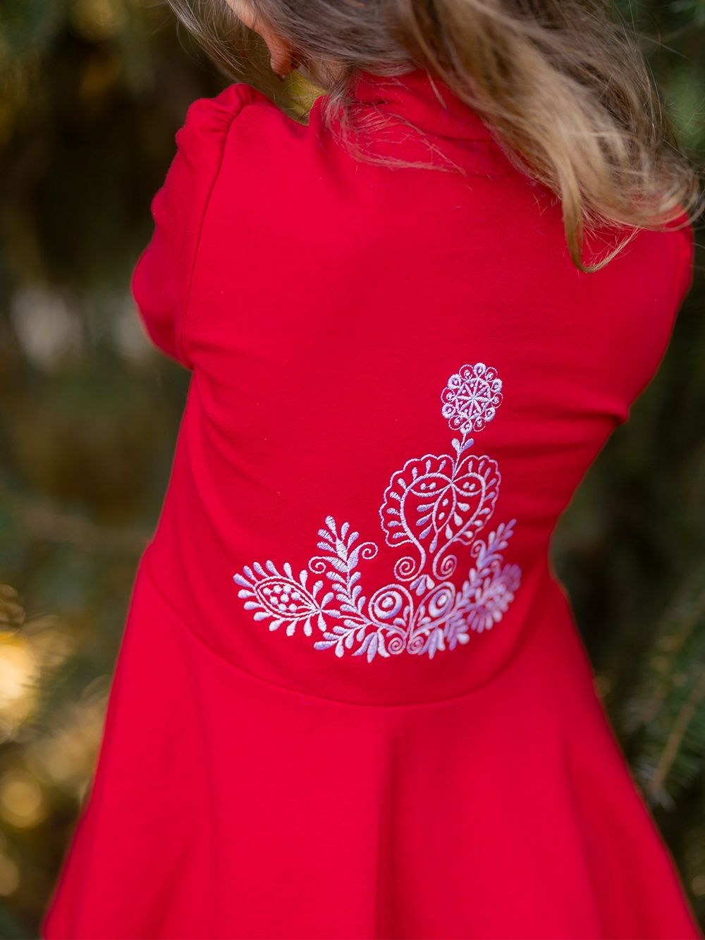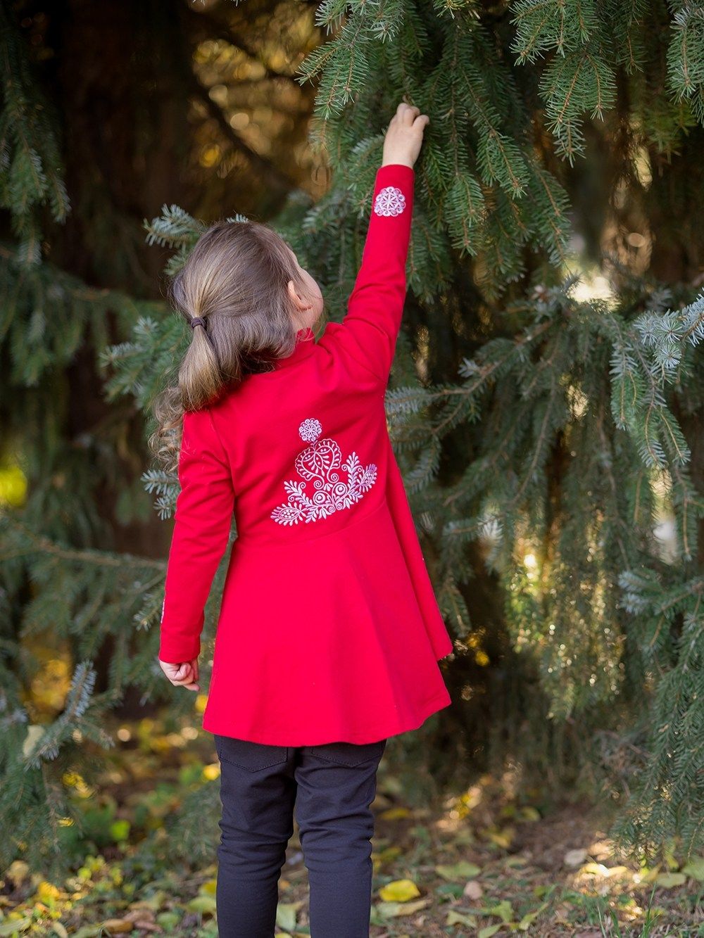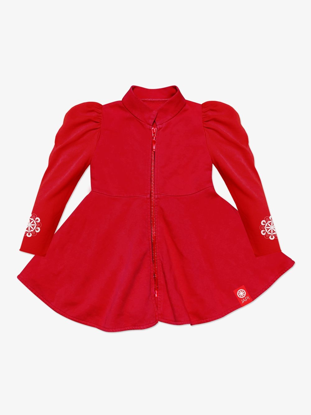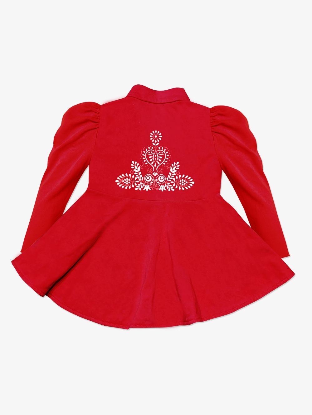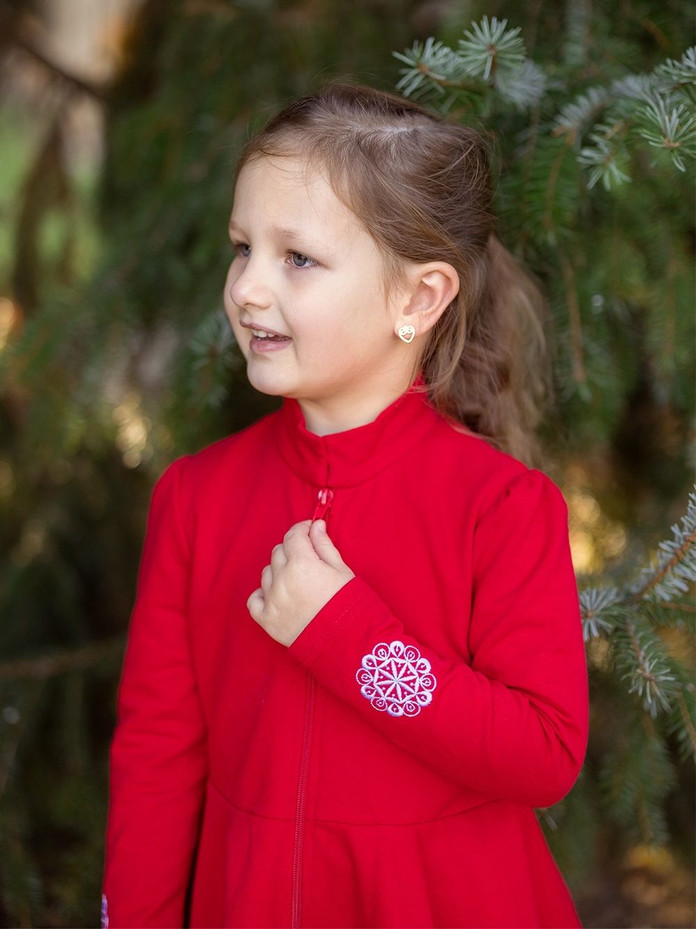 Lijepa djevojačka dukserica skupljenih rukava, produženog kroja i stojećeg ovratnika. Komad koji je prikladni za svečano fotografiranje ili božićno vrijeme. Dopunjena je obrađenim vezom. Ima perunski cvijet i komad Čataj veza. Vez je na oba rukava i na leđima.