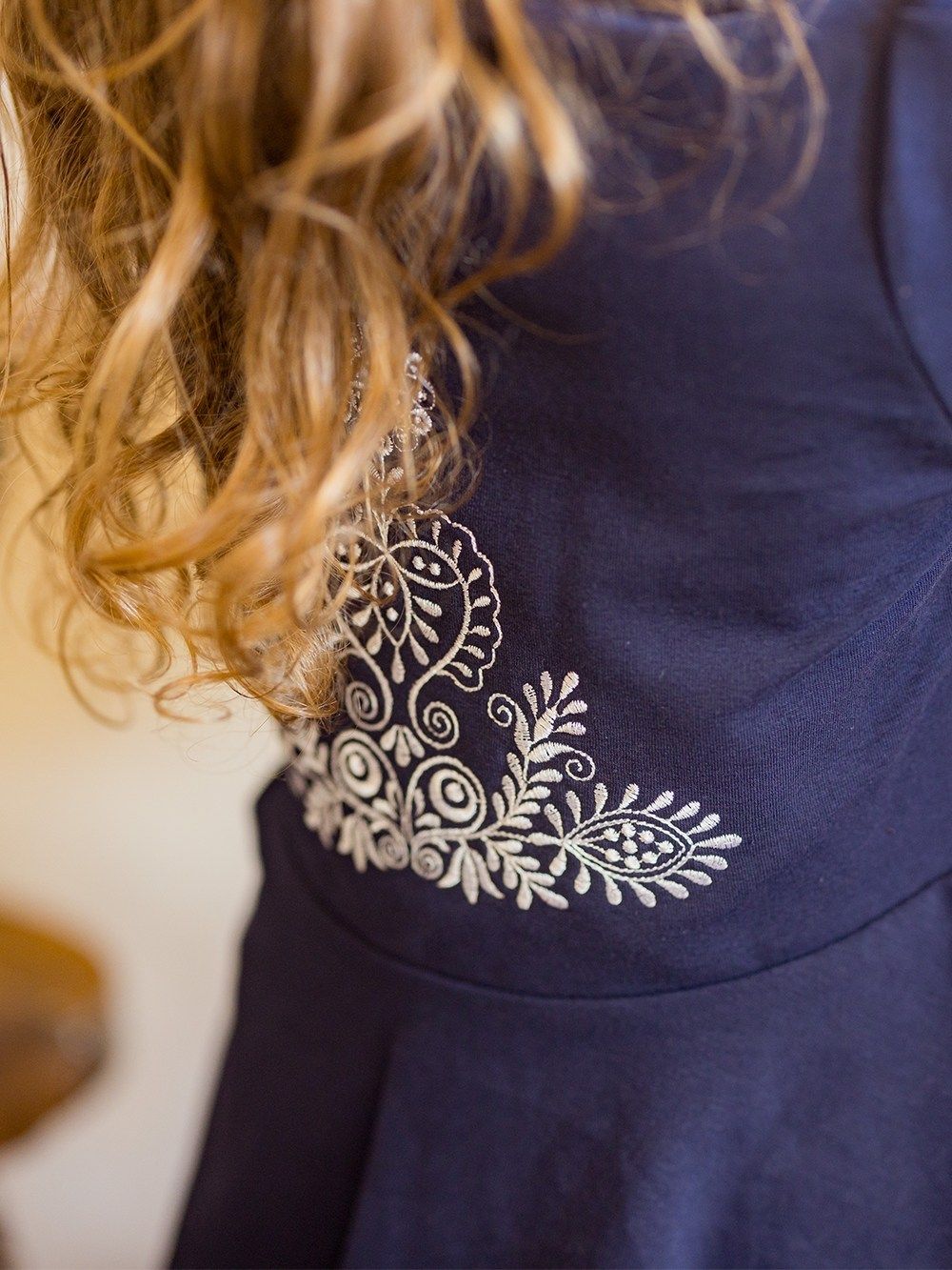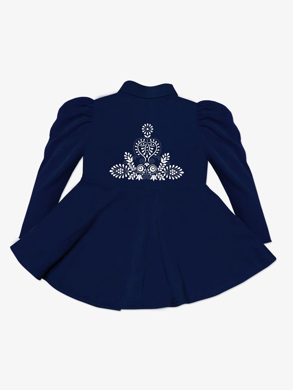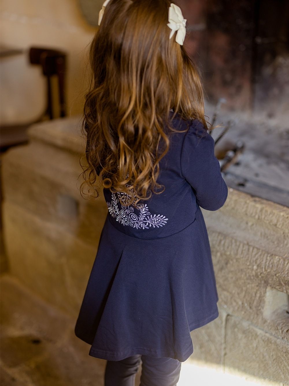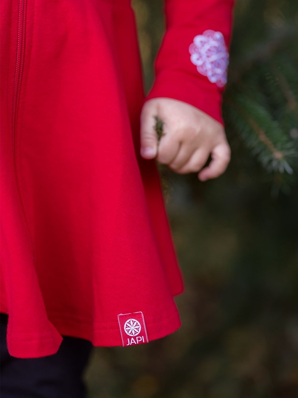 Lijepa djevojačka dukserica skupljenih rukava, produženog kroja i stojećeg ovratnika. Komad koji je prikladni za svečano fotografiranje ili božićno vrijeme. Dopunjena je obrađenim vezom. Ima perunski cvijet i komad Čataj veza. Vez je na oba rukava i na leđima.
