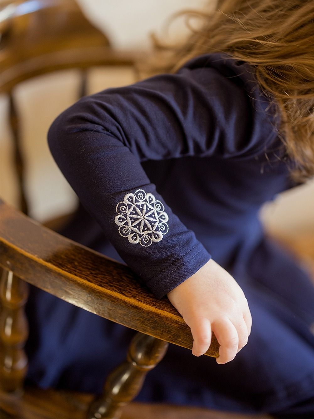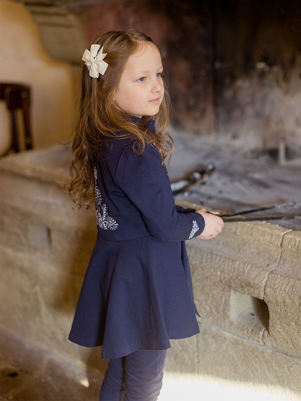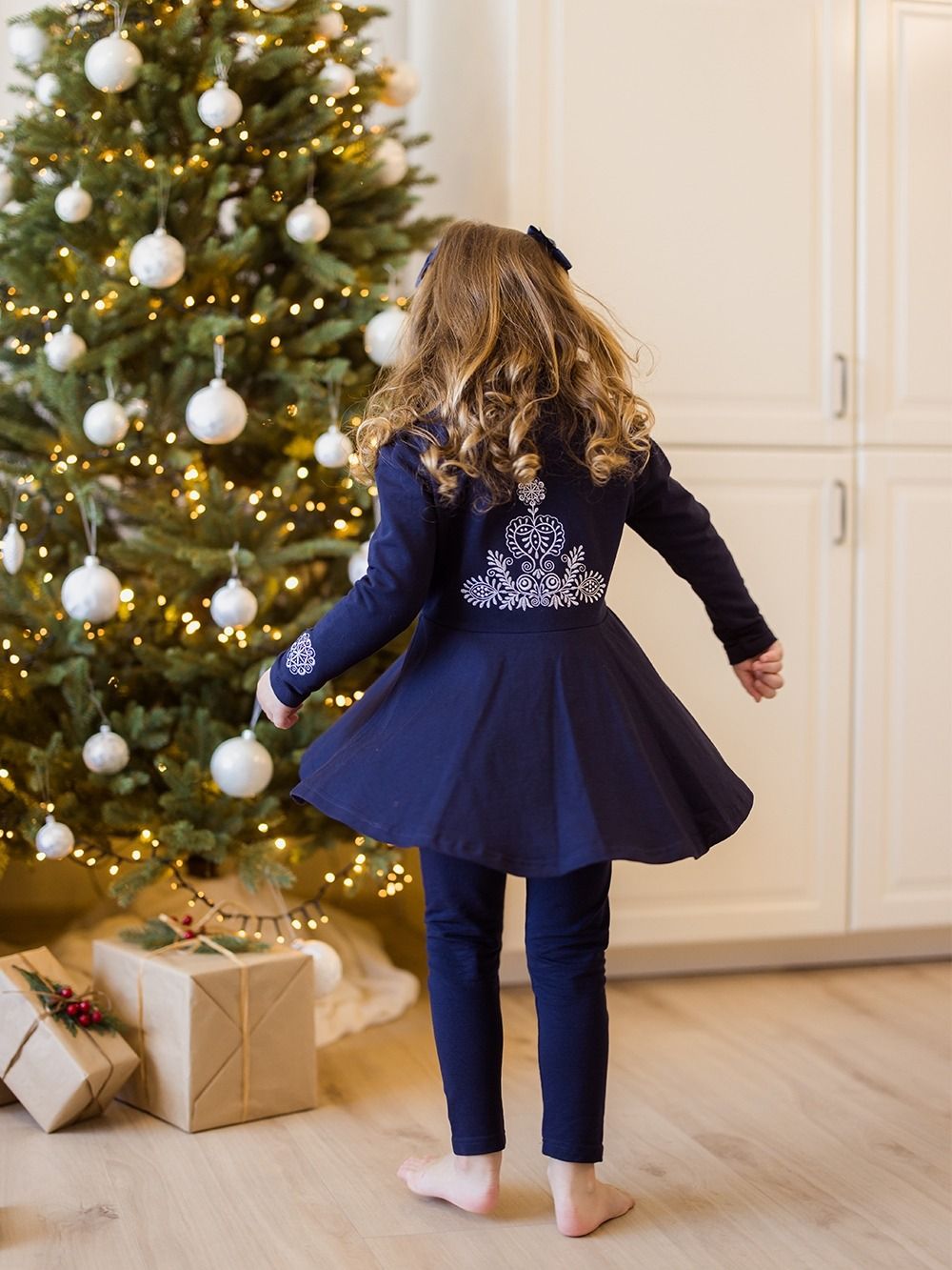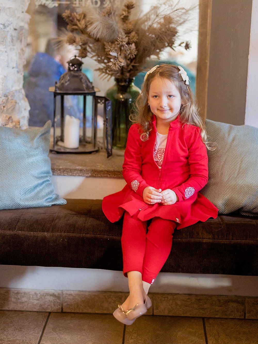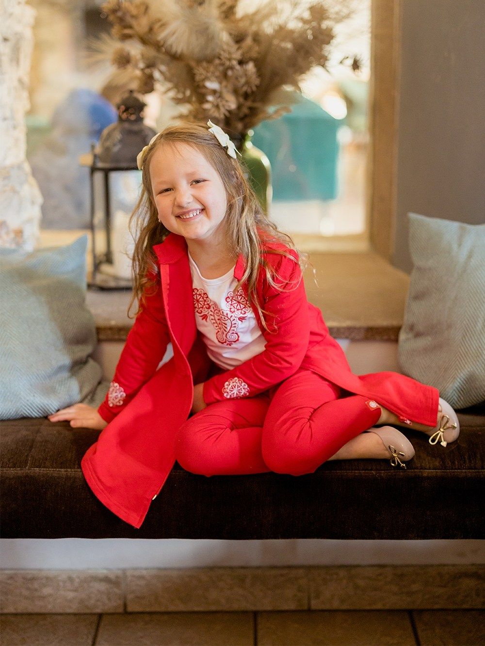 Lijepa djevojačka dukserica skupljenih rukava, produženog kroja i stojećeg ovratnika. Komad koji je prikladni za svečano fotografiranje ili božićno vrijeme. Dopunjena je obrađenim vezom. Ima perunski cvijet i komad Čataj veza. Vez je na oba rukava i na leđima.