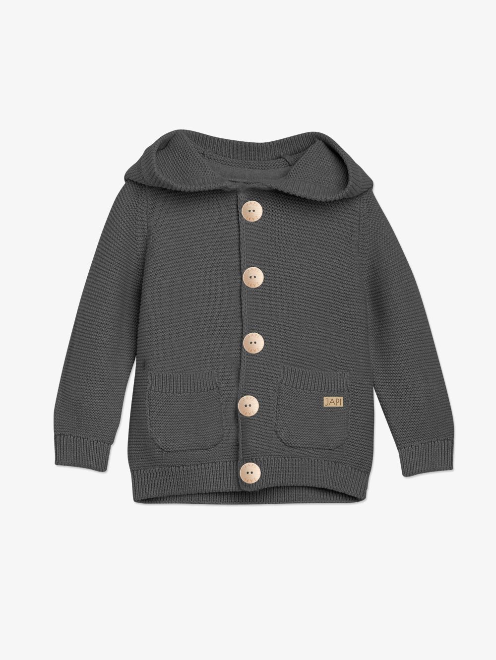 Džemper za dječake s kapuljačom i džepovima. Udoban komad za hladnije dane. Drveni gumbi čine ga posebnim komadom.