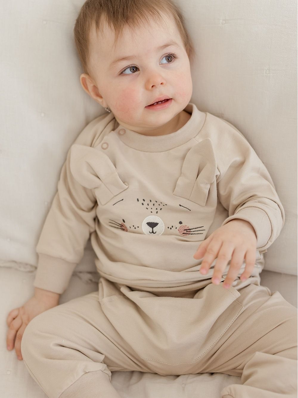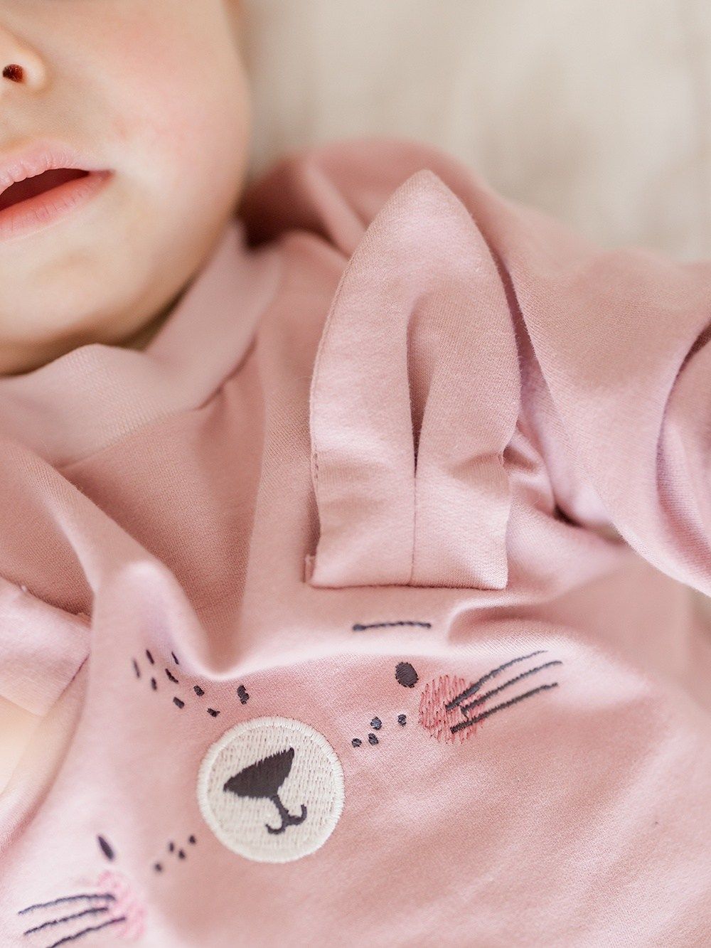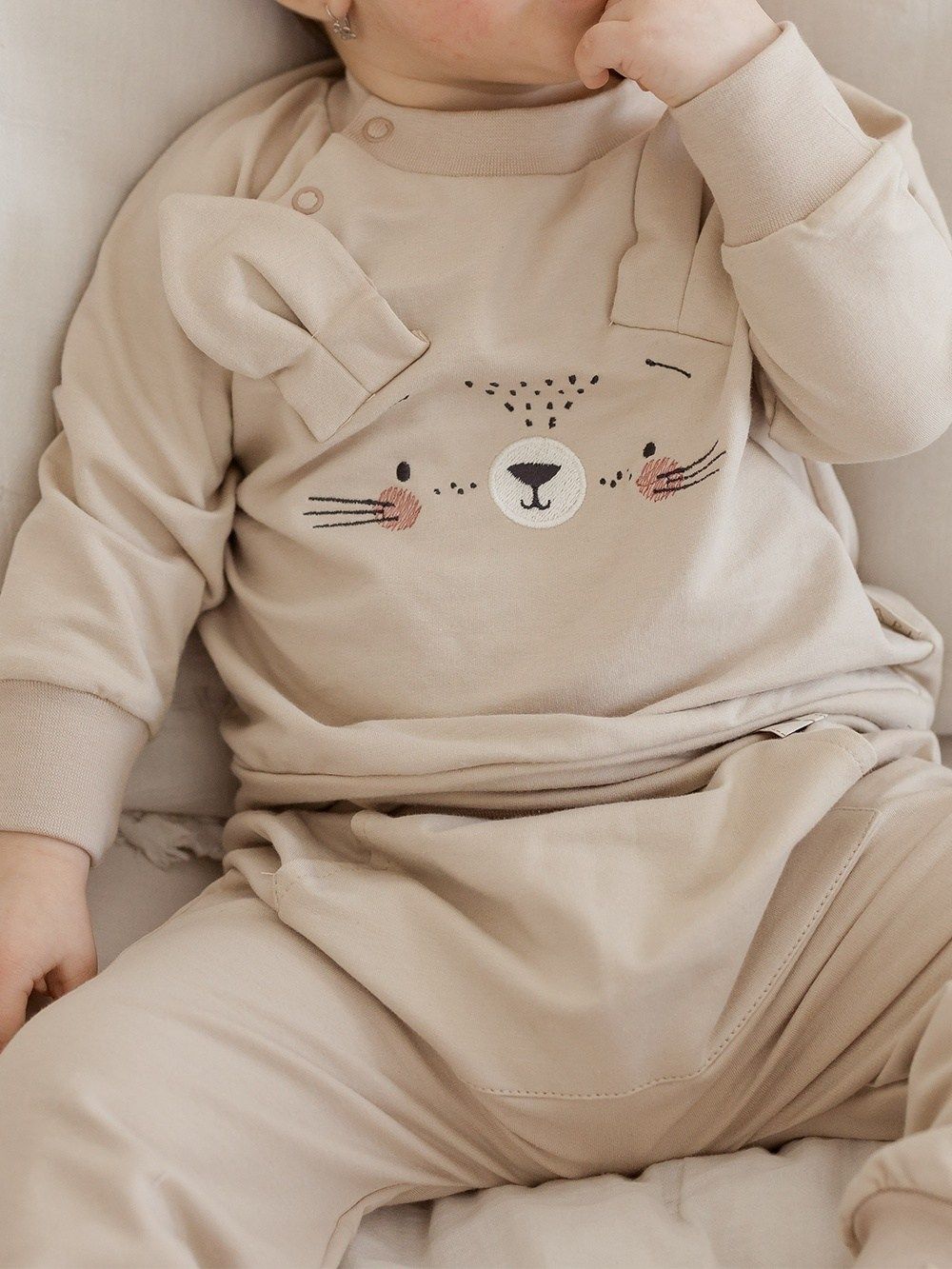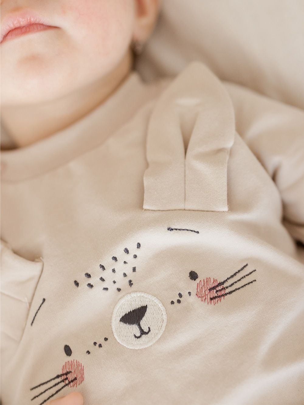 Ugodan pamučni materijal ima atest pa je namijenjen i najmanjoj djeci. Dukserica je upotpunjena našivenim ušima i likom zečića. Kopča se kopčom oko vrata što olakšava odijevanje bebe.