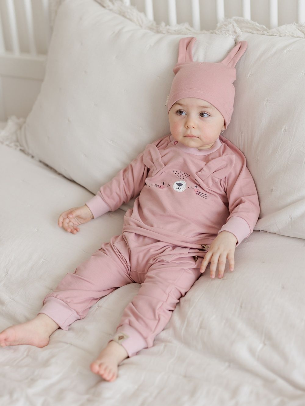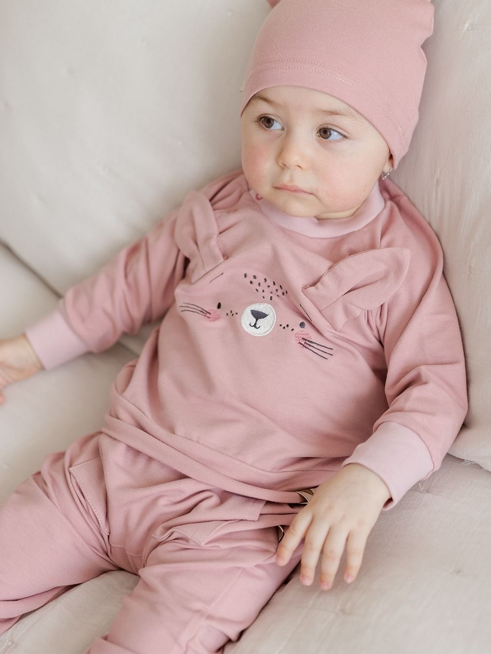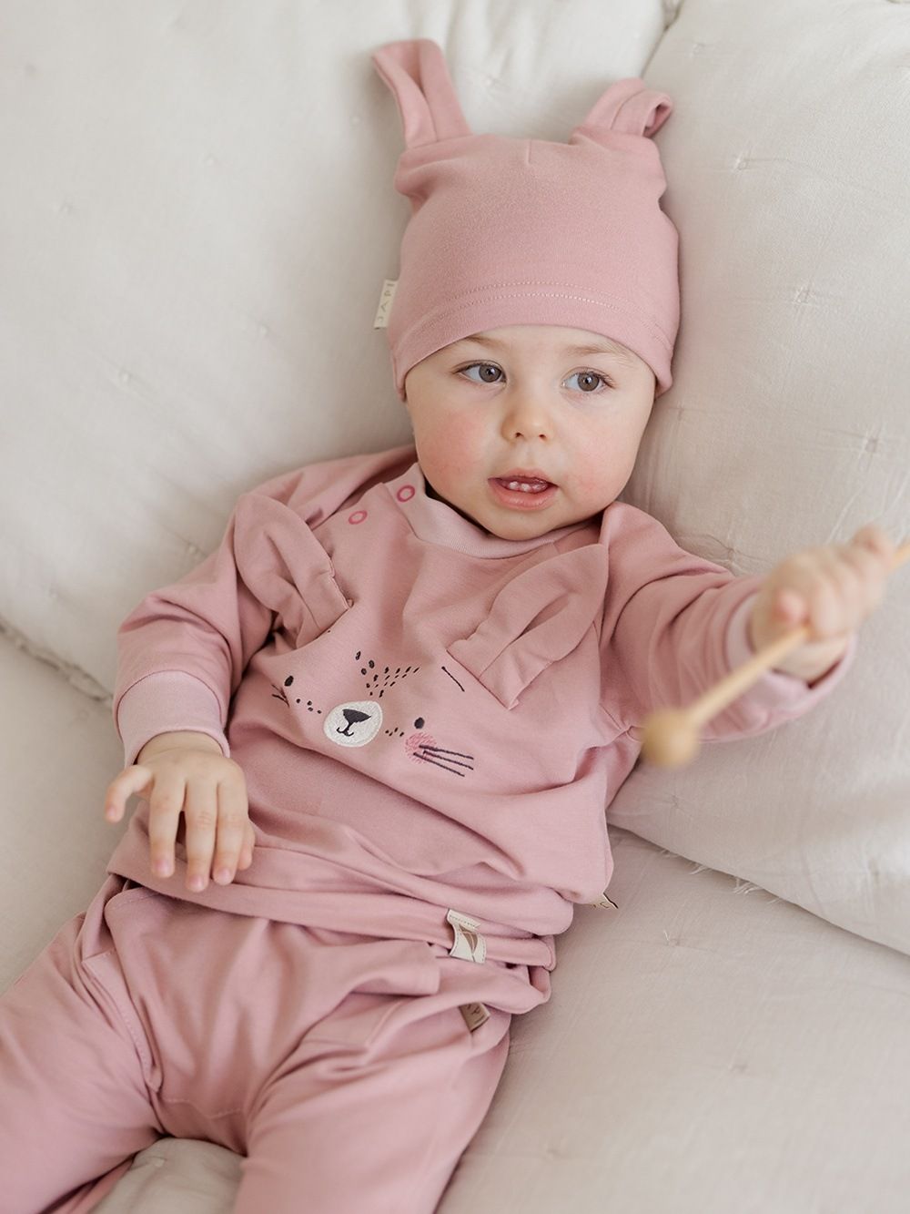 Ugodan pamučni materijal ima atest pa je namijenjen i najmanjoj djeci. Dukserica je upotpunjena našivenim ušima i likom zečića. Kopča se kopčom oko vrata što olakšava odijevanje bebe.