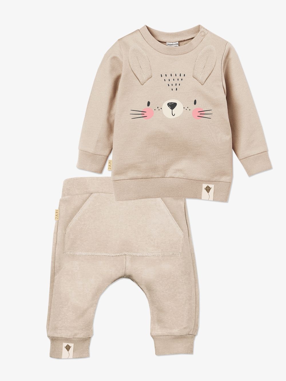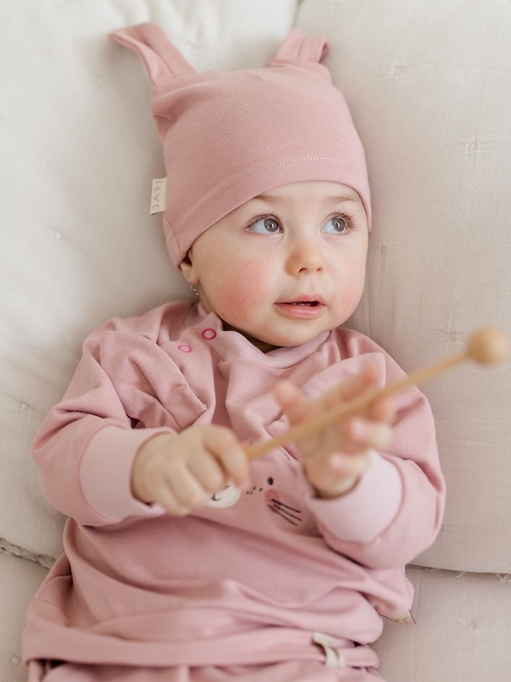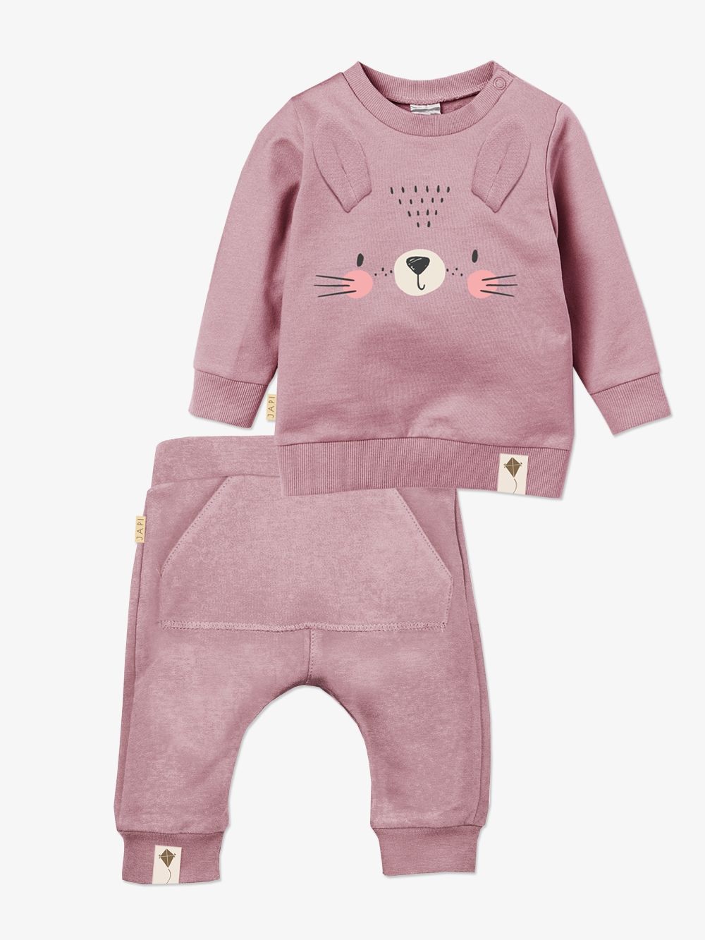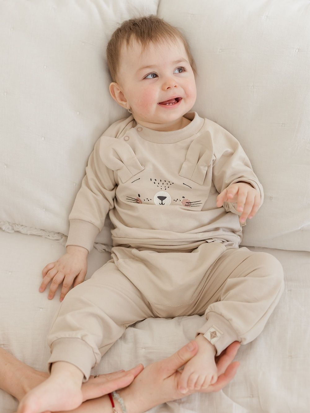 Ugodan pamučni materijal ima atest pa je namijenjen i najmanjoj djeci. Dukserica je upotpunjena našivenim ušima i likom zečića. Kopča se kopčom oko vrata što olakšava odijevanje bebe.