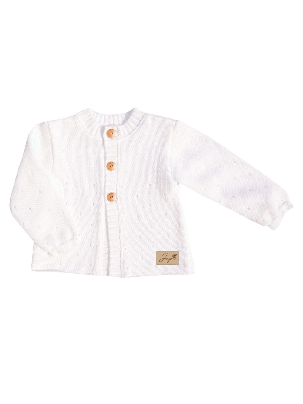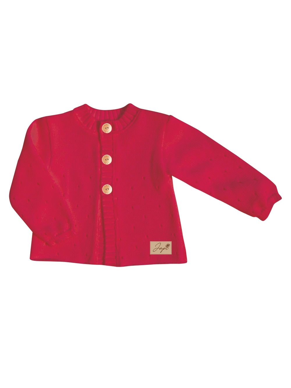 Fino je pleten te ima lijepe detalje. Male okice i drveni gumbovi. Džemperić je kod nas dostupan u veličinama od 62 do 86. Lijepo će dodati živost odjeći a još ljepše se uklapa s višnjama iz kolekcije. Pogodan za hladnije dane i proslavne prigode.