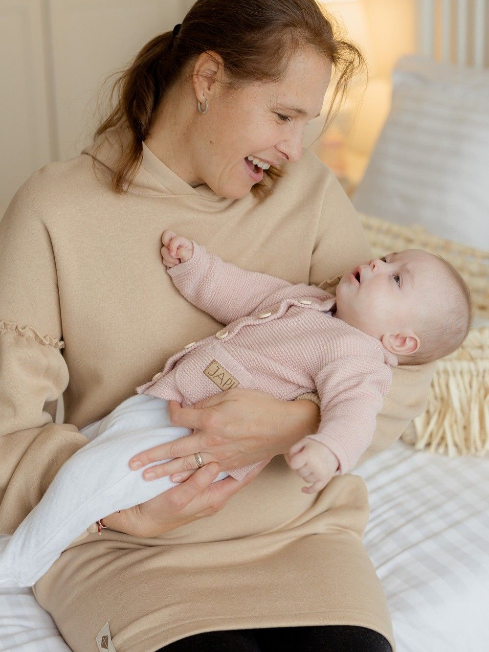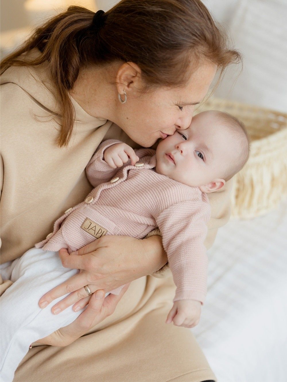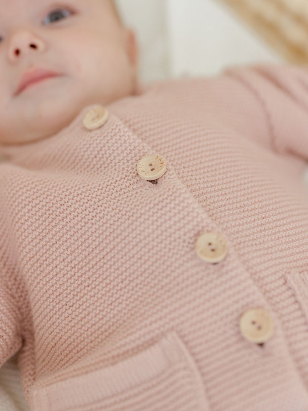 Dječji džemper za dojenčad u ovoj kolekciji možete pronaći u tri osnovne boje. Neutralno krem, roza i svijetlo plava. Džemper ima mekani uniformni uzorak i džepove. Kopča se cijelom dužinom drvenim gumbima.