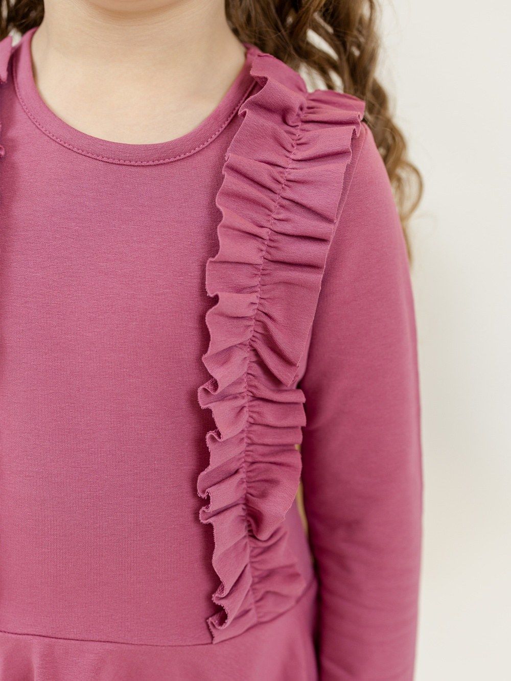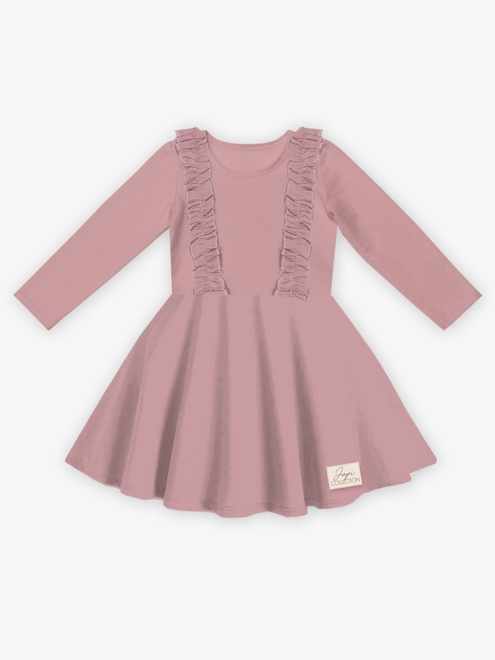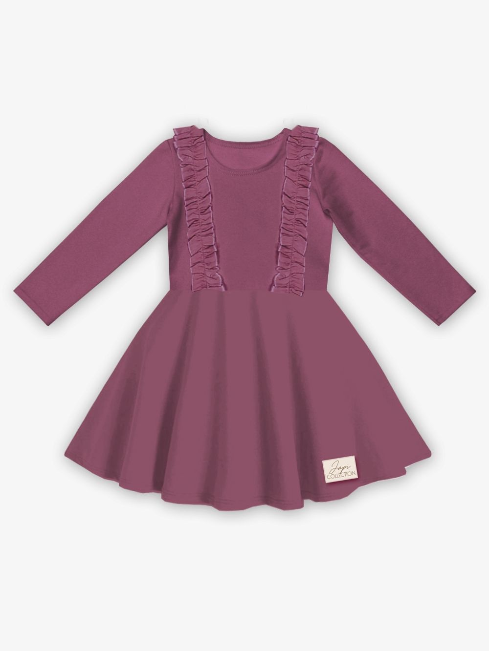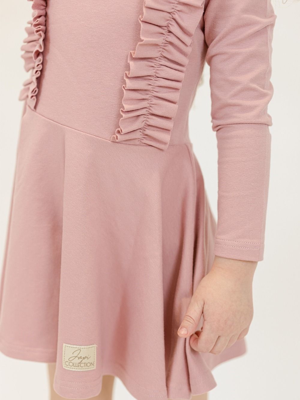 Pamučna haljina puderasto ružičaste ili ljubičaste boje nadopunjena je volanima na prednjem gornjem dijelu. Haljina je udobnog kroja i prikladna je za svečane prilike kao i za školsko ili vrtićko slikanje. Praktične su i elegantne u isto vrijeme. Rezane su u struku i imaju suknju koja se lijepo okreće.
