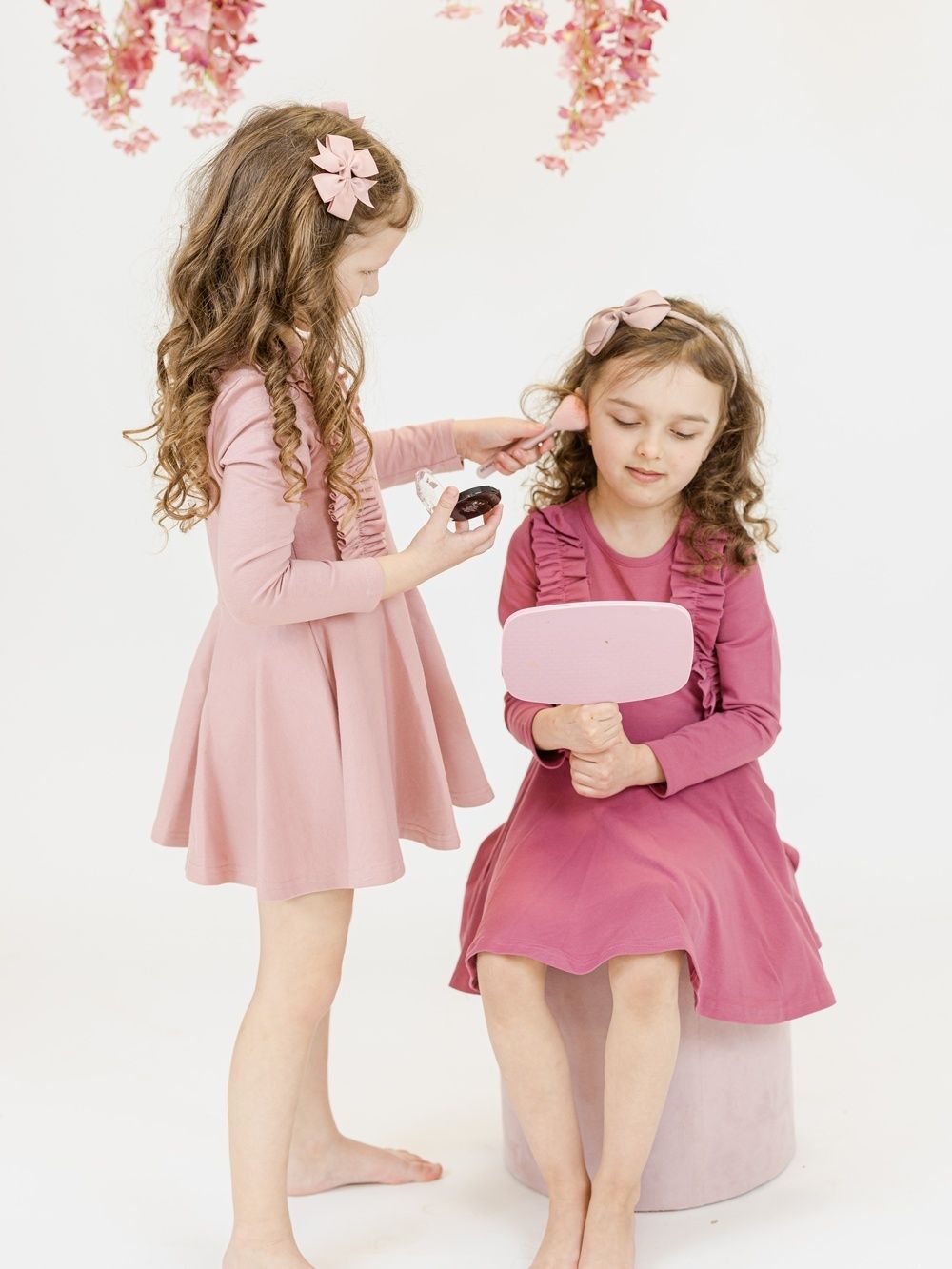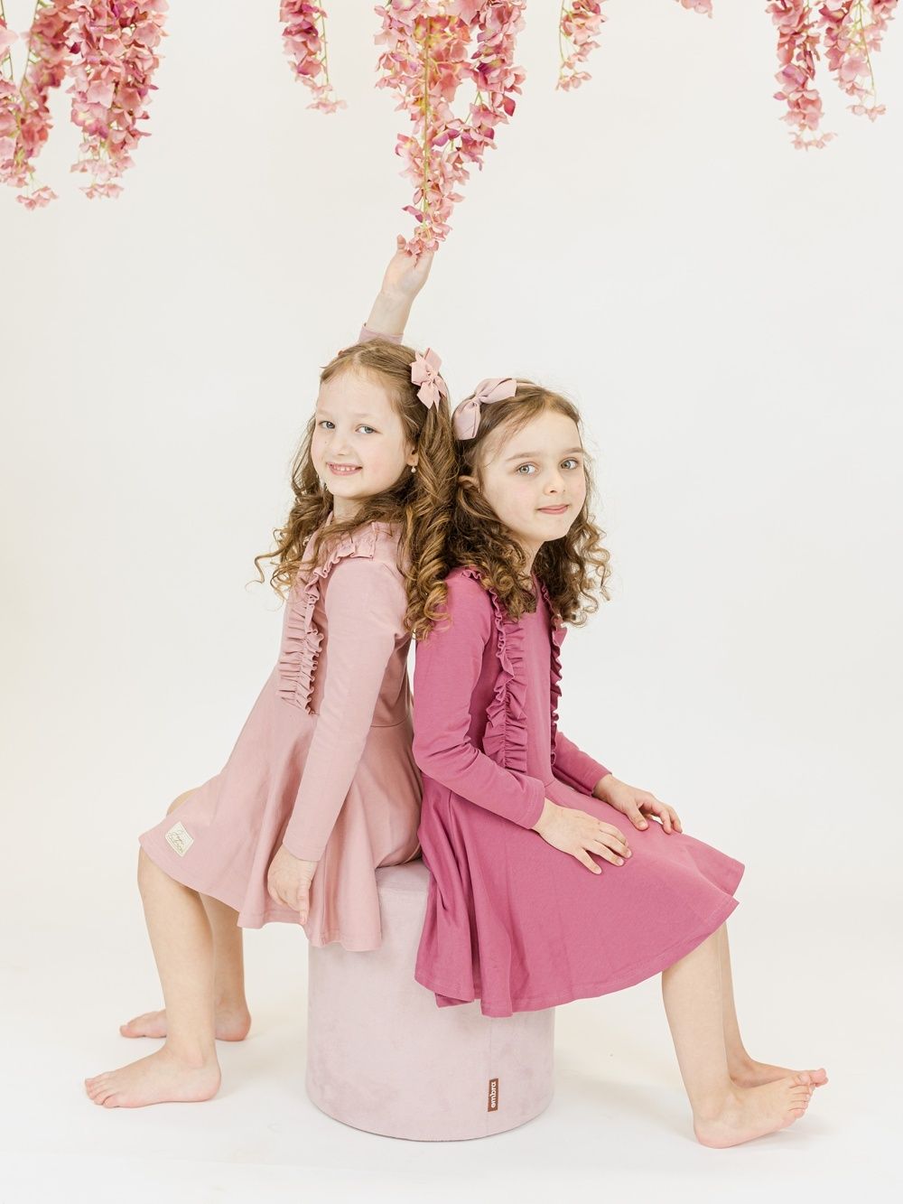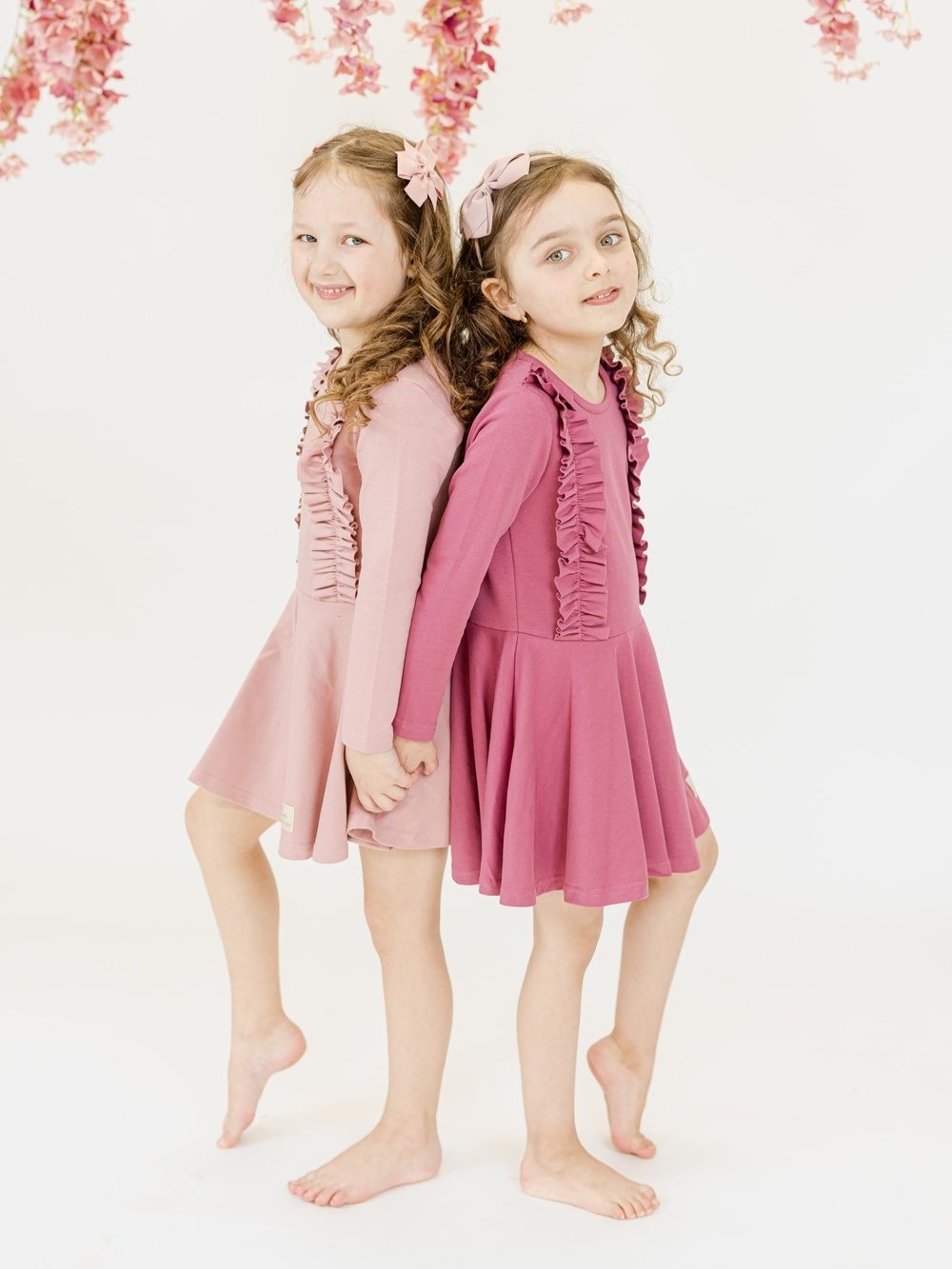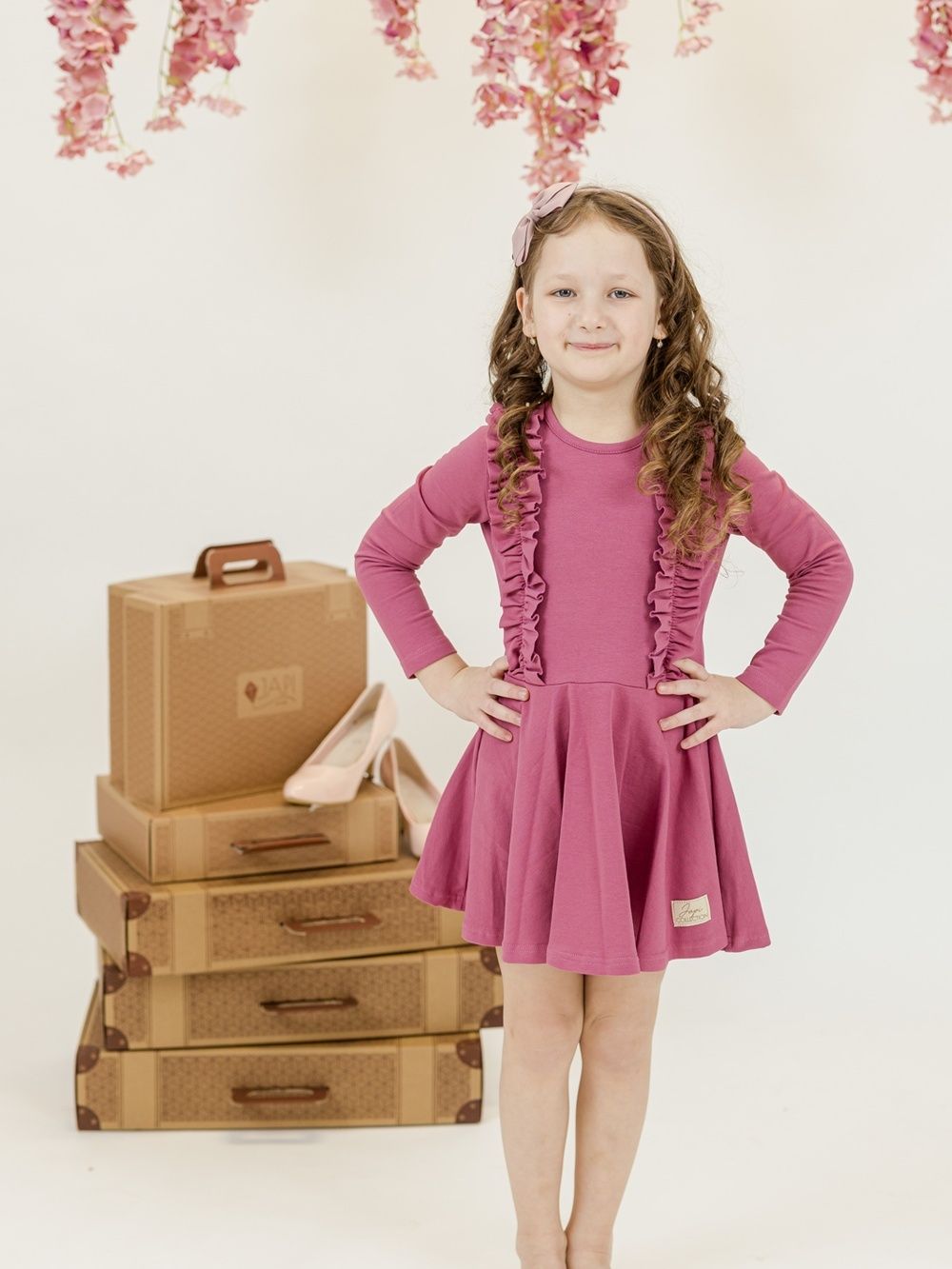 Pamučna haljina puderasto ružičaste ili ljubičaste boje nadopunjena je volanima na prednjem gornjem dijelu. Haljina je udobnog kroja i prikladna je za svečane prilike kao i za školsko ili vrtićko slikanje. Praktične su i elegantne u isto vrijeme. Rezane su u struku i imaju suknju koja se lijepo okreće.