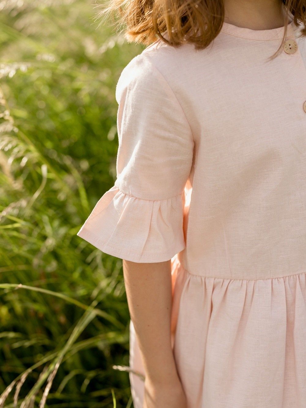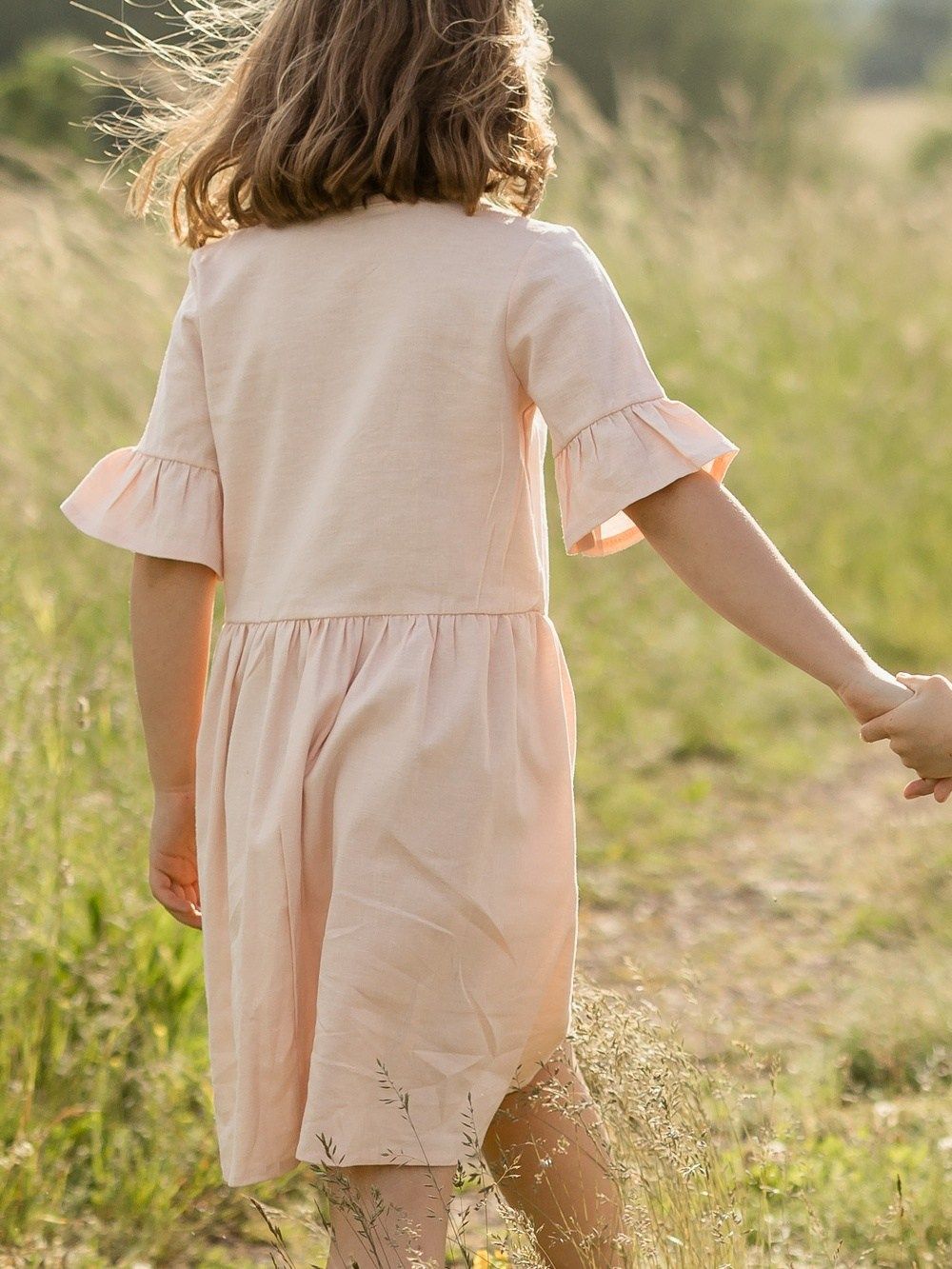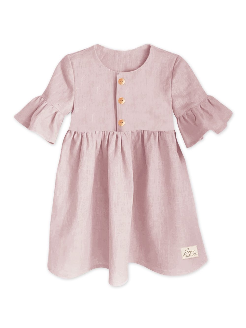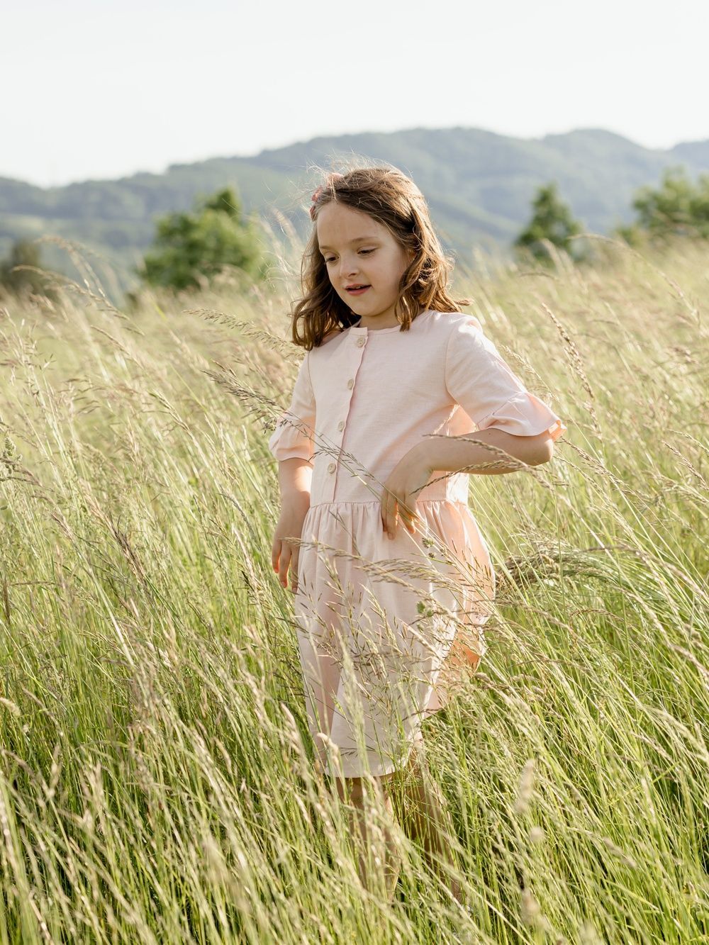 Ova haljina ima nježan djevojački kroj. U boji maslaca i puder roze, izgledaju vrlo nježno. Rukavi su na kraju skupljeni u volan. Haljina je rezana u struku, a gornji dio je upotpunjen funkcionalnim drvenim gumbima. Haljina se lijepo okreće zahvaljujući suknji koja je nježno nabrana u struku.