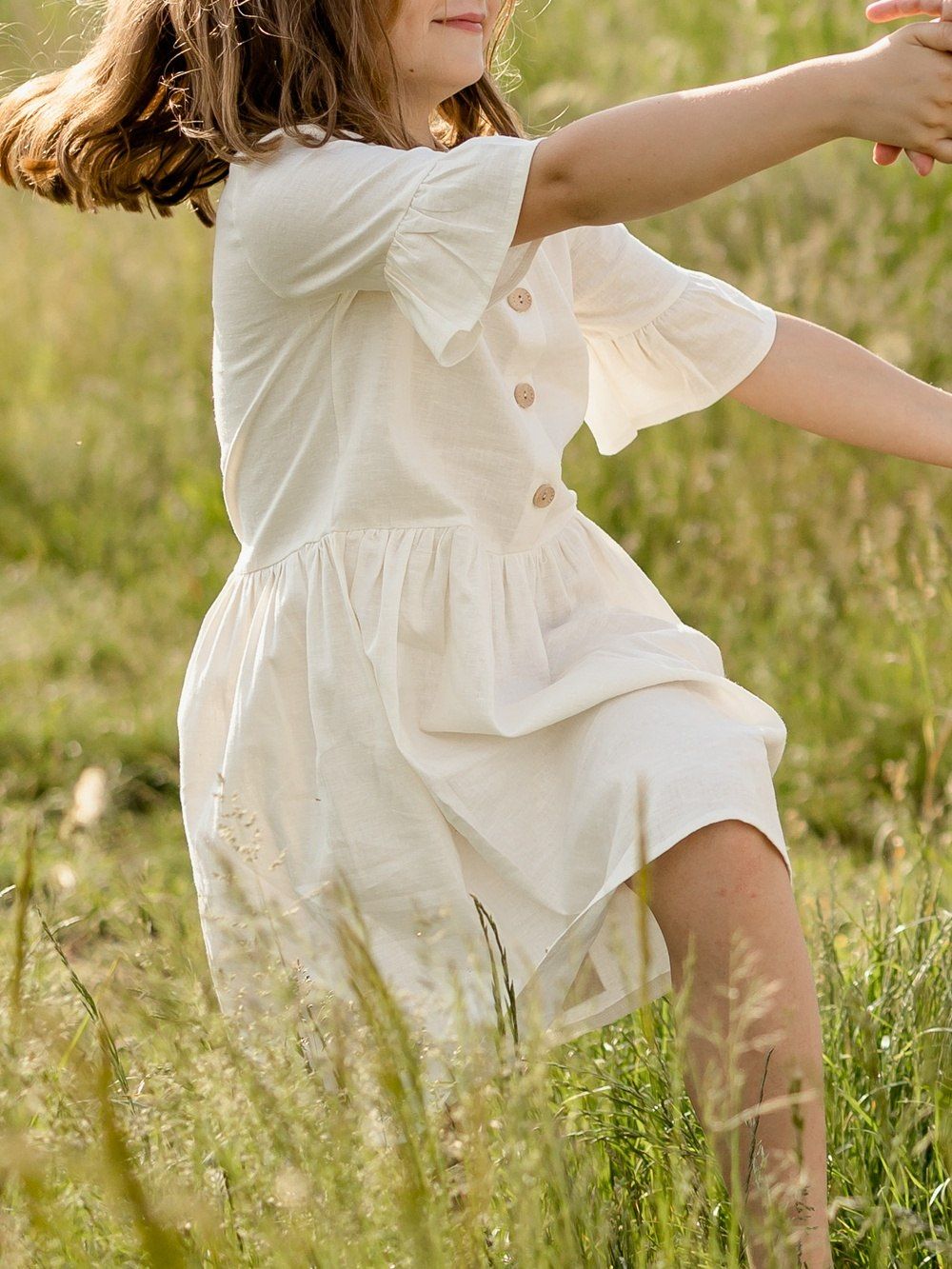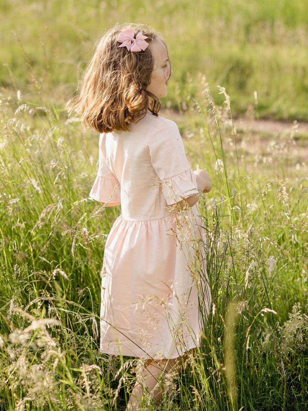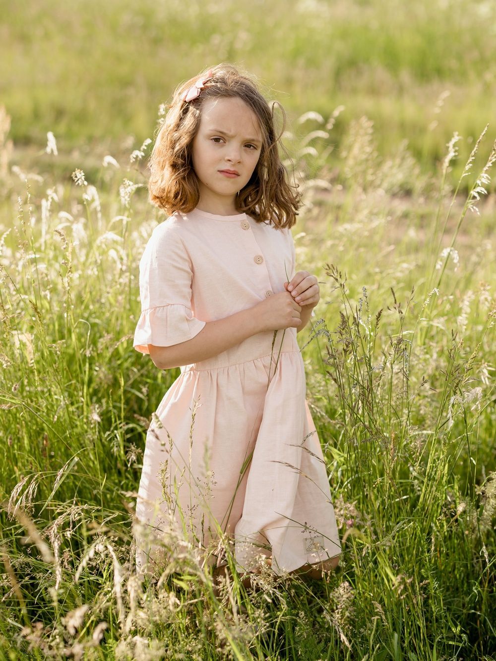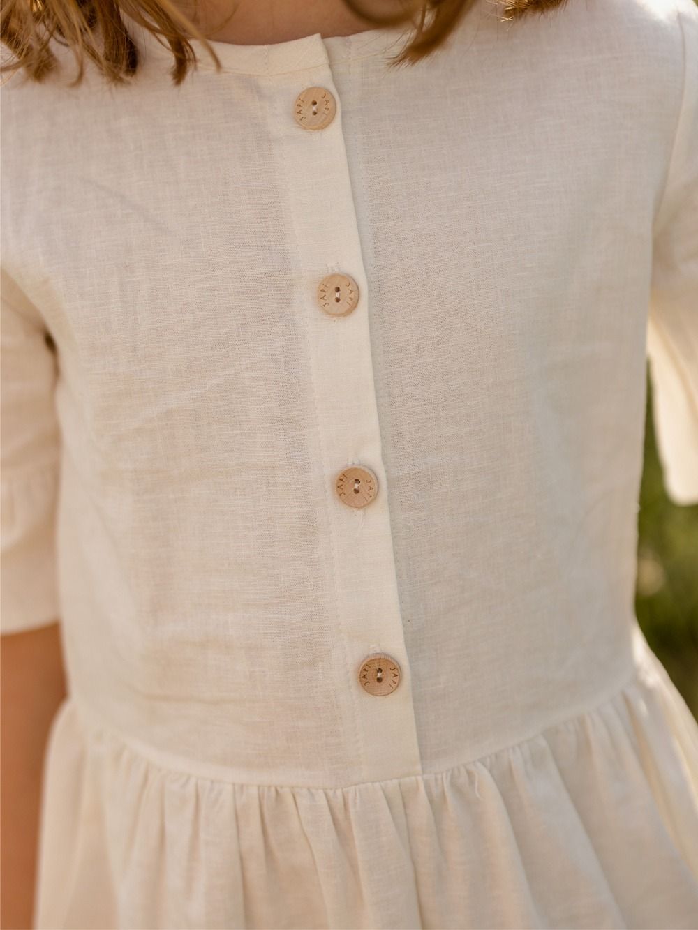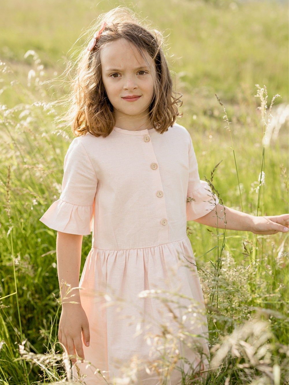 Ova haljina ima nježan djevojački kroj. U boji maslaca i puder roze, izgledaju vrlo nježno. Rukavi su na kraju skupljeni u volan. Haljina je rezana u struku, a gornji dio je upotpunjen funkcionalnim drvenim gumbima. Haljina se lijepo okreće zahvaljujući suknji koja je nježno nabrana u struku.