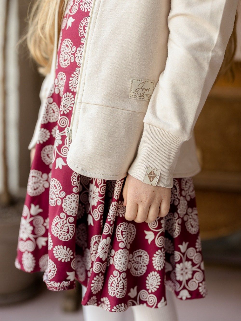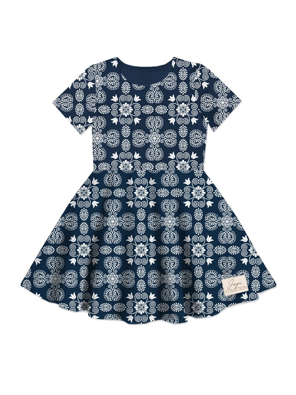 Haljina je ugodnog, udobnog kroja i rotirajuće suknje. Ugodan zaobljeni dekolt i kratki rukavi. Izrađena je od pamučne tkanine na koju smo otisnuli vlastiti uzorak. Uzorak je obrađen na temelju narodnog veza.