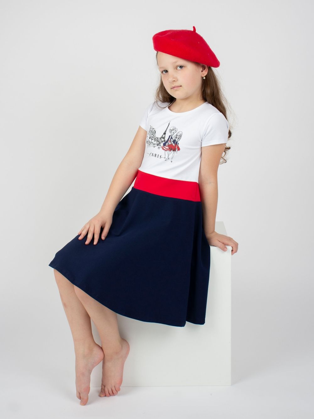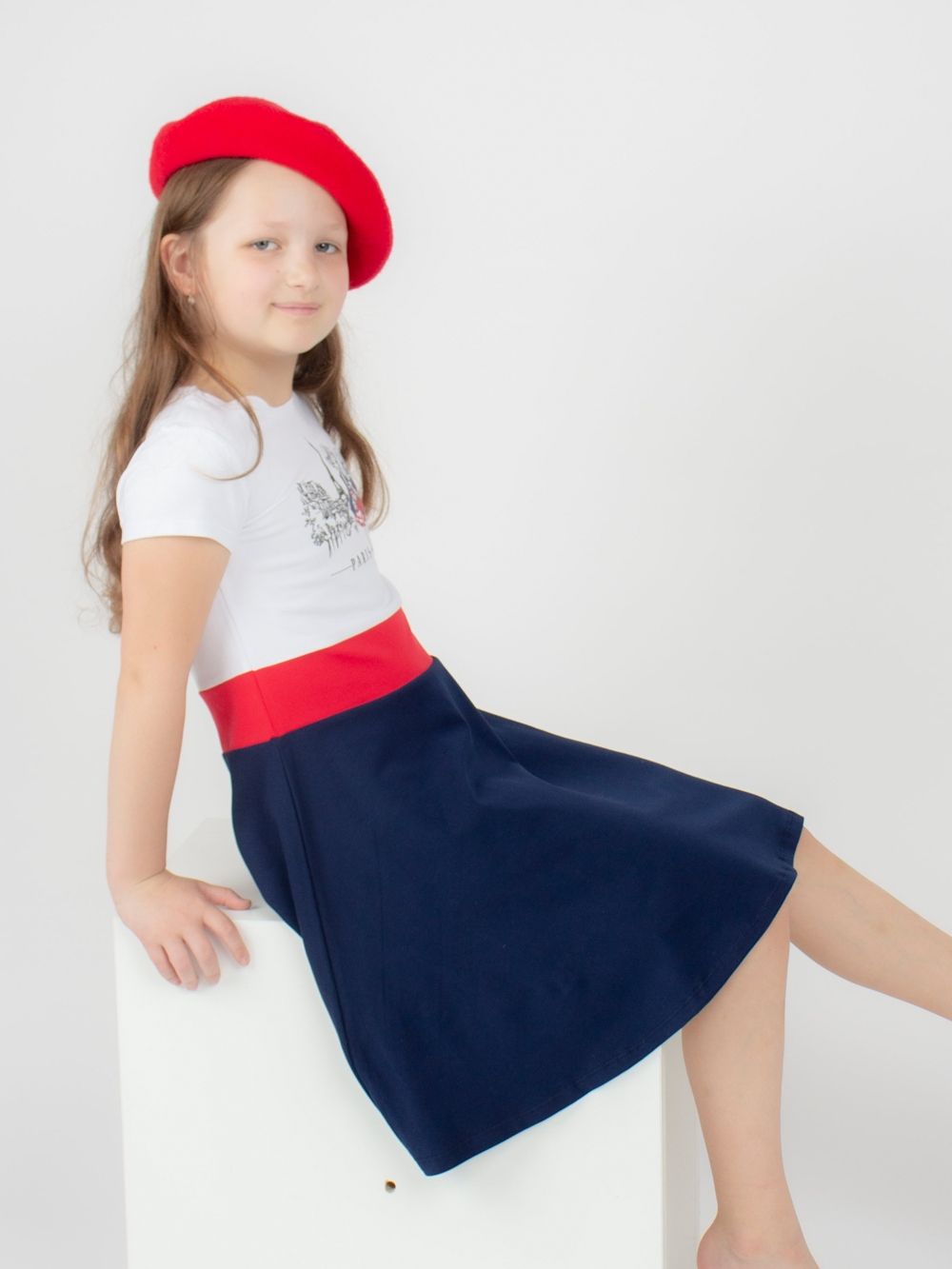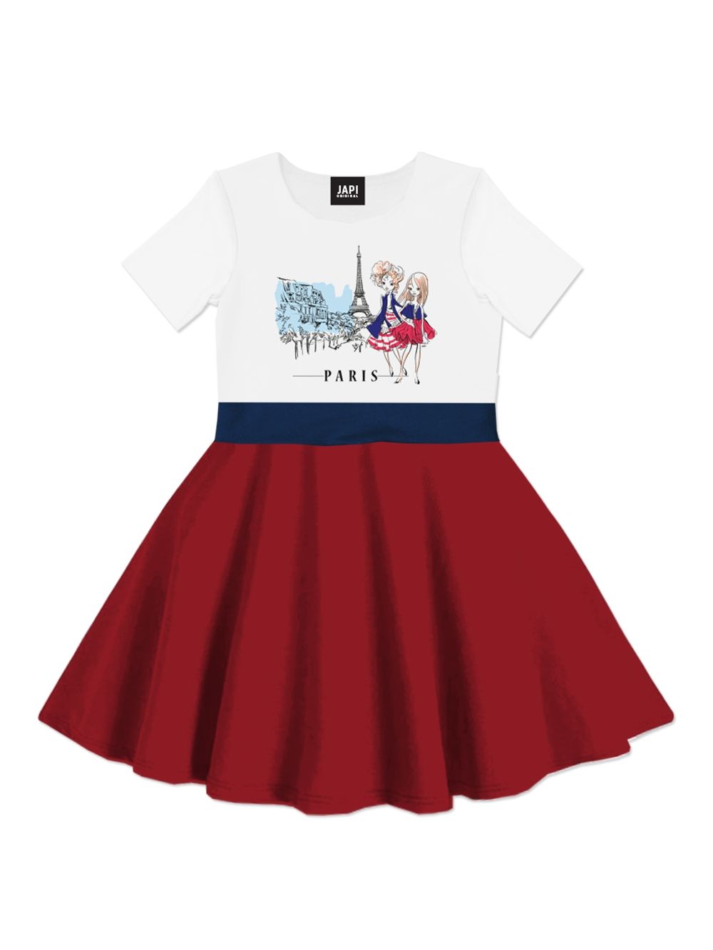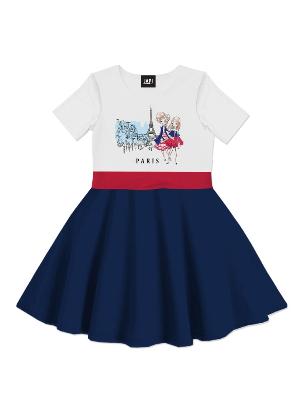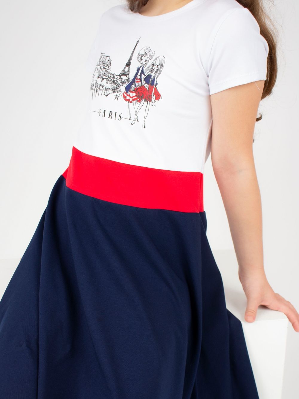 Elegantna haljina za djevojčice PARIS s kratkim rukavima savršen je izbor za male dame koje vole eleganciju. Nježan pariški uzorak s modnim likovima daje haljini romantičan izgled. Kombinacija bijelog gornjeg dijela i suknje u boji stvara skladan kontrast i ističe njezin jedinstveni dizajn. Raskošna suknja omogućuje slobodno kretanje i cjelodnevnu udobnost. Mekan pamučni materijal nježan je prema dječjoj koži i osigurava ugodno nošenje. Dostupna u dvije boje – tamno plava s crvenim pojasom i crvena s tamno plavim pojasom.