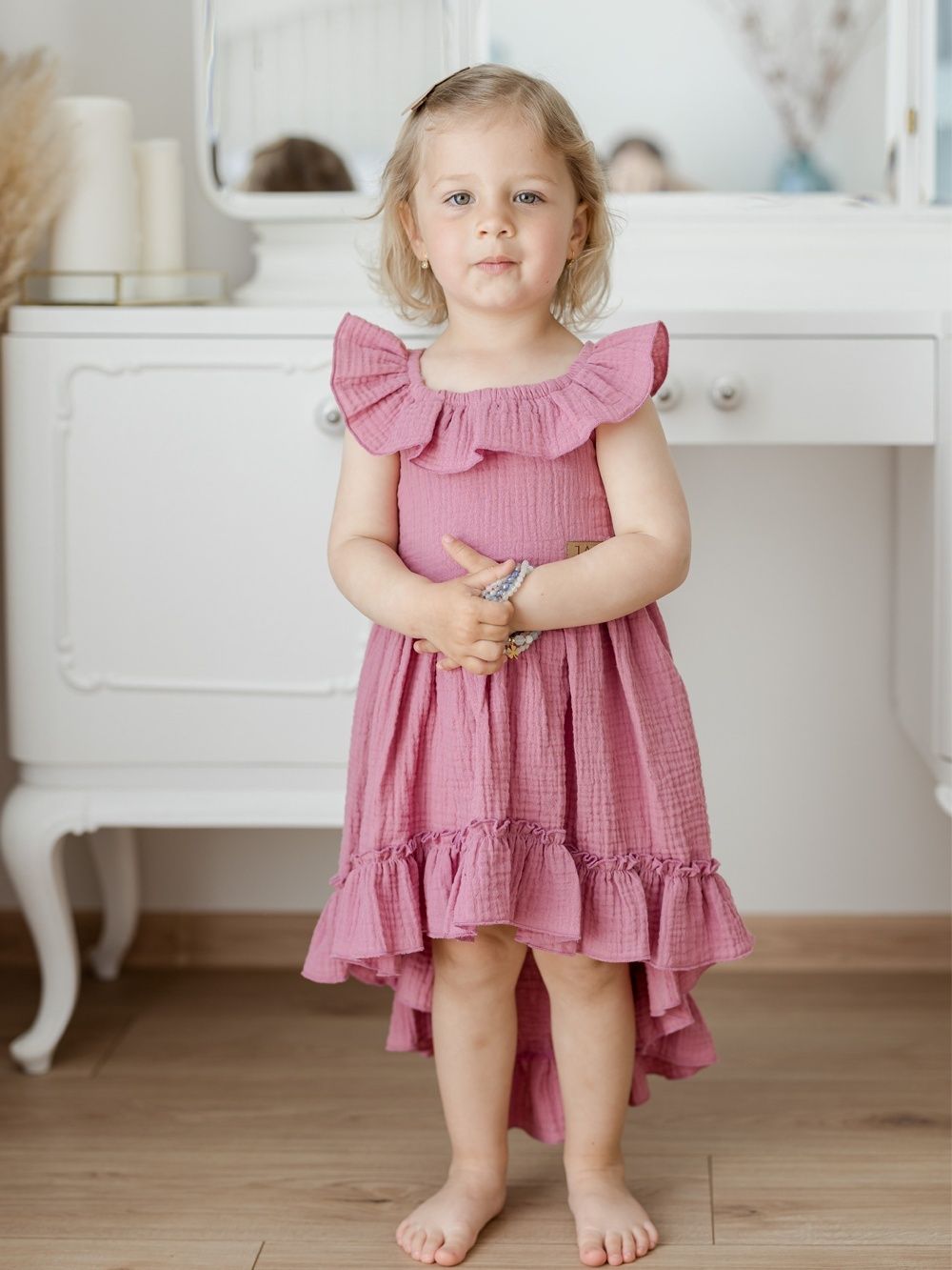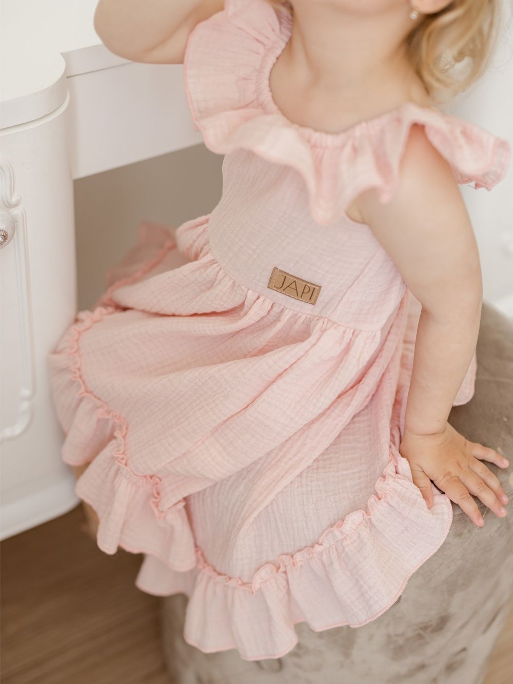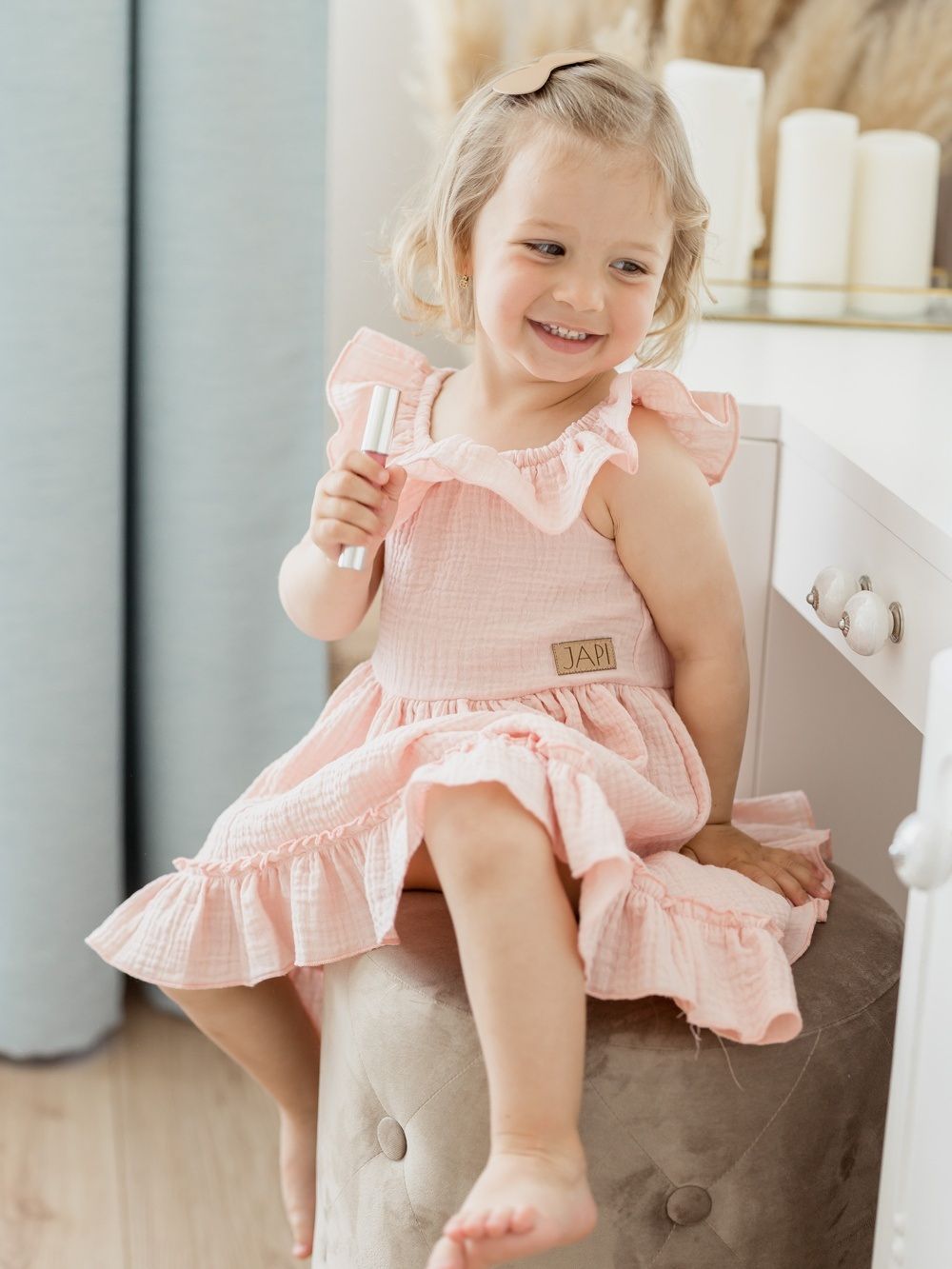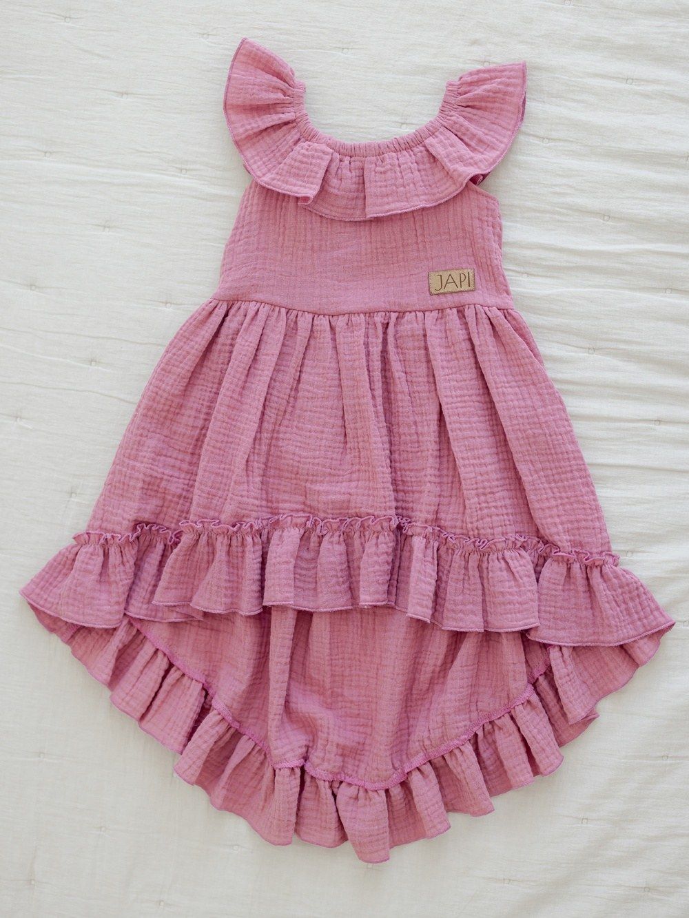 Lagani muslin je pogodan za ljeto a djevojčicama će na povjetarcu lijepo lepršati. Na izbor imate dvije krasne boje. Dostupna u veličinama od 92 do 140. Ova haljina je pogodna za bilo kakvu ljetnu proslavu ali i svadbu ili neku drugu obiteljsku proslavu. Djevojčice će jamačno u njima zajsati i na godišnjem odmoru, gdje će ih moći potpuno koristiti.