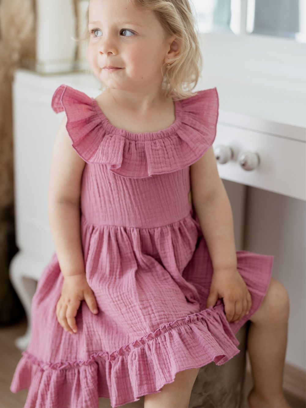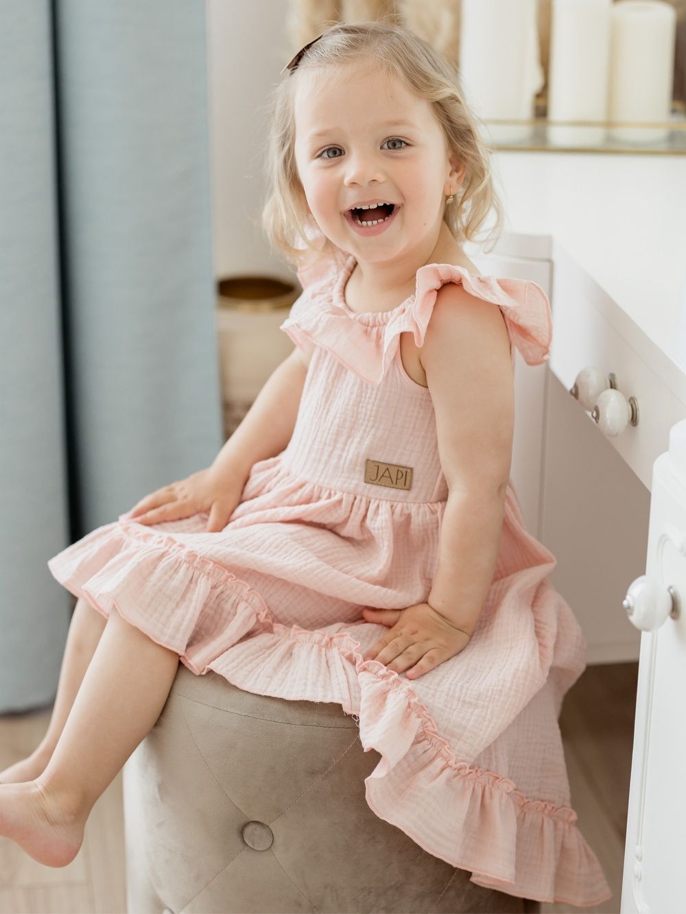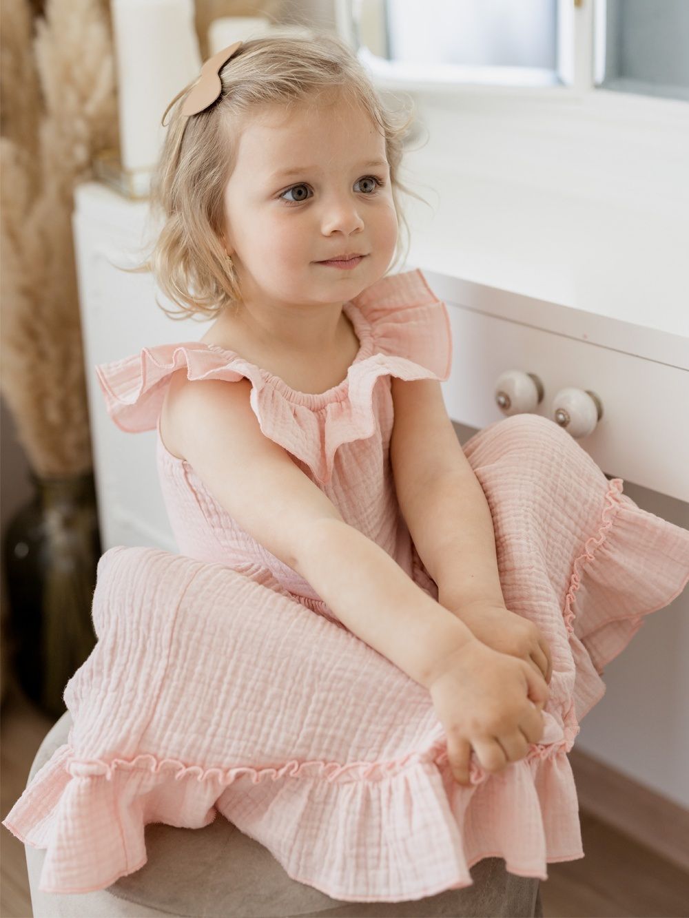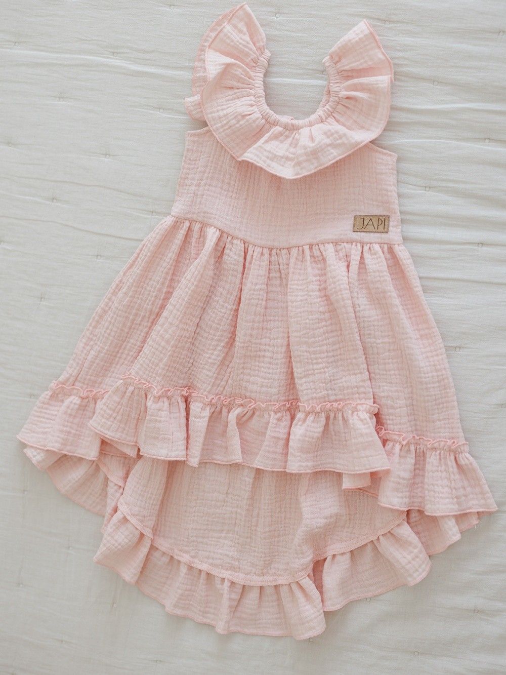 Lagani muslin je pogodan za ljeto a djevojčicama će na povjetarcu lijepo lepršati. Na izbor imate dvije krasne boje. Dostupna u veličinama od 92 do 140. Ova haljina je pogodna za bilo kakvu ljetnu proslavu ali i svadbu ili neku drugu obiteljsku proslavu. Djevojčice će jamačno u njima zajsati i na godišnjem odmoru, gdje će ih moći potpuno koristiti.