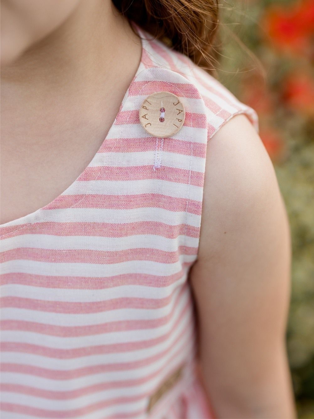 Suknja haljina se kopča drvenim gumbima na gornjem dijelu. Ima blago proširenu suknju, koja je skupljena u struku (zahvaljujući tome lijepo se okreće).