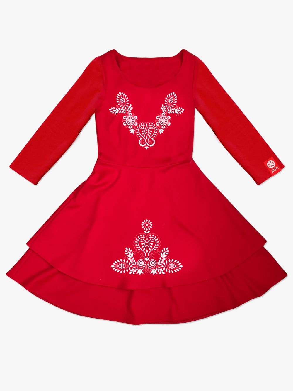 Prelijepa i svečana djevojačka haljina dugih rukava. Izrađena od certificiranih materijala upotpunjenih vezom bijelim koncem. Vez nosi simbol zaštite - Perunov cvijet i dio Čataj veza - srce.