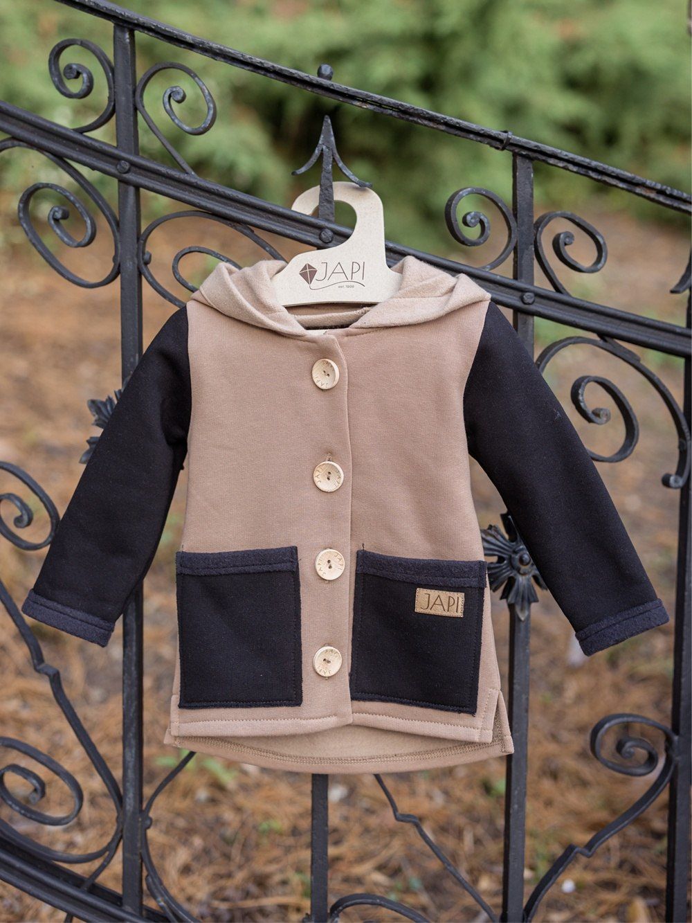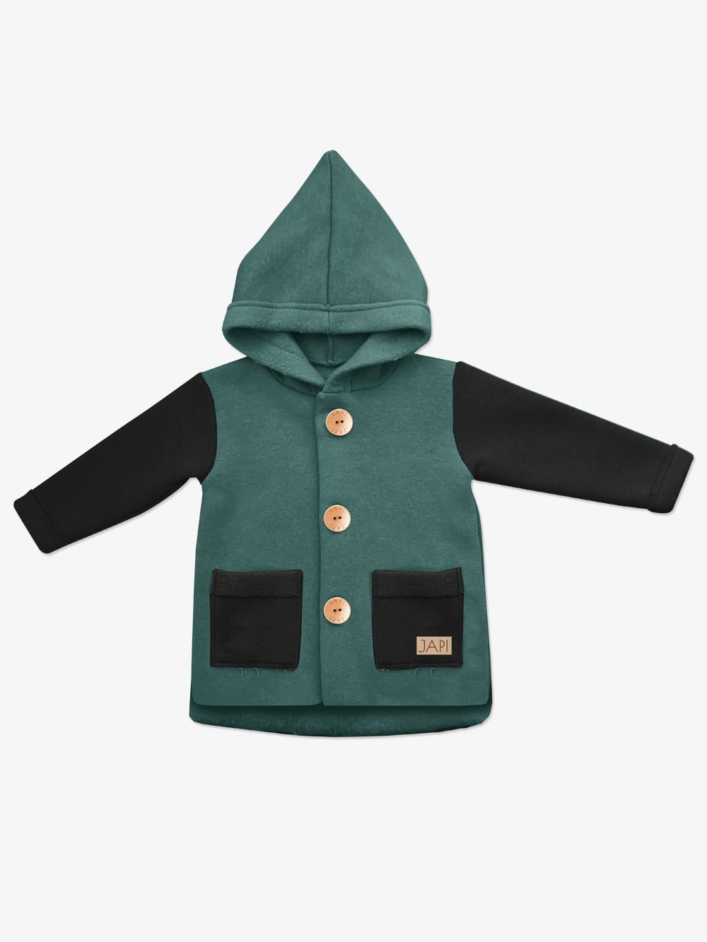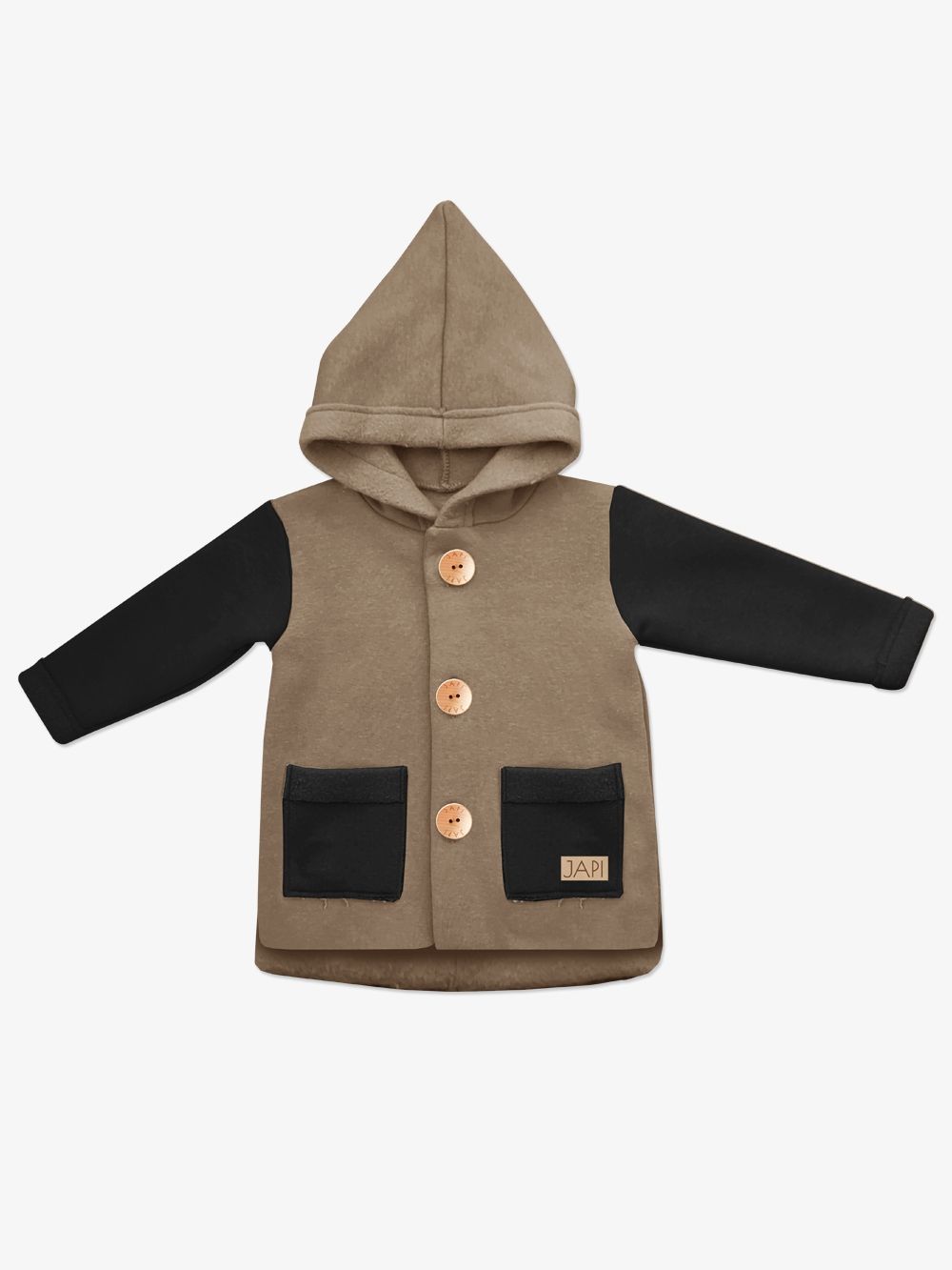 Muška dječja topla bundica s kapuljačom pogodna je za hladnije dane. Bundica je šivena od 100% pamučne deblje tkanine. Kombinacija boja smeđe i zelene s crnom djeluje moderno. Prednji džepovi, drveni gumbovi i kapuljača u stilu patuljka su jamstvo uspjeha.