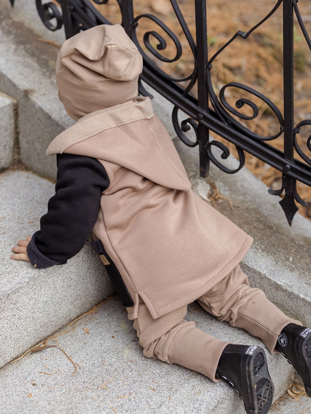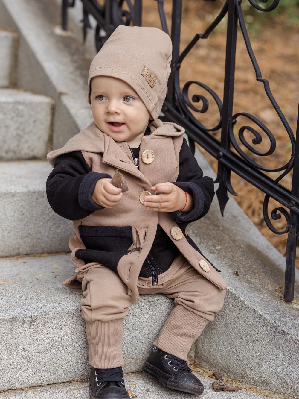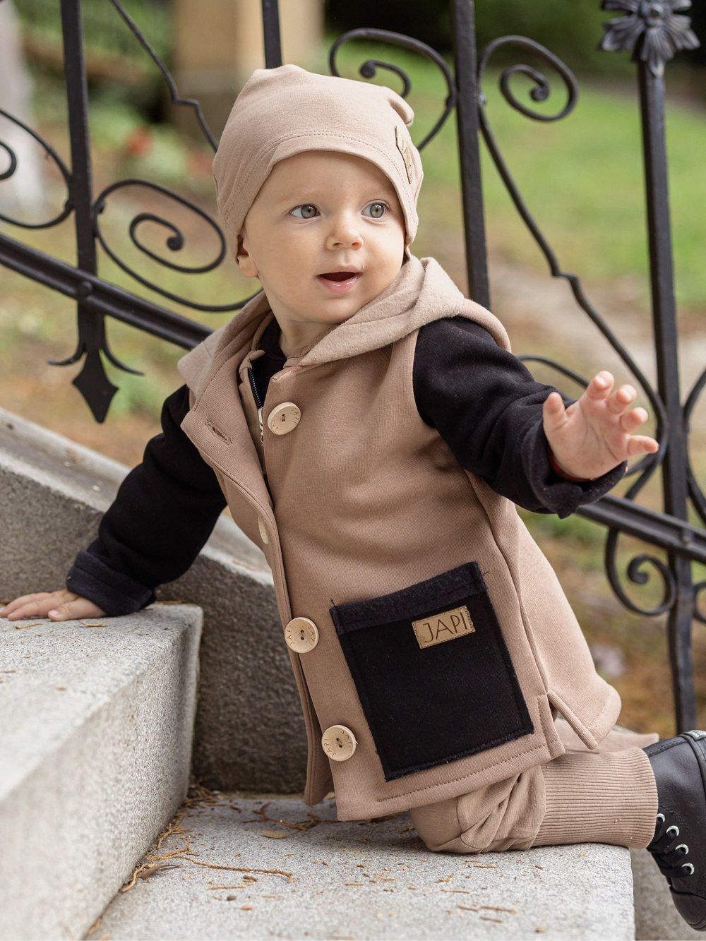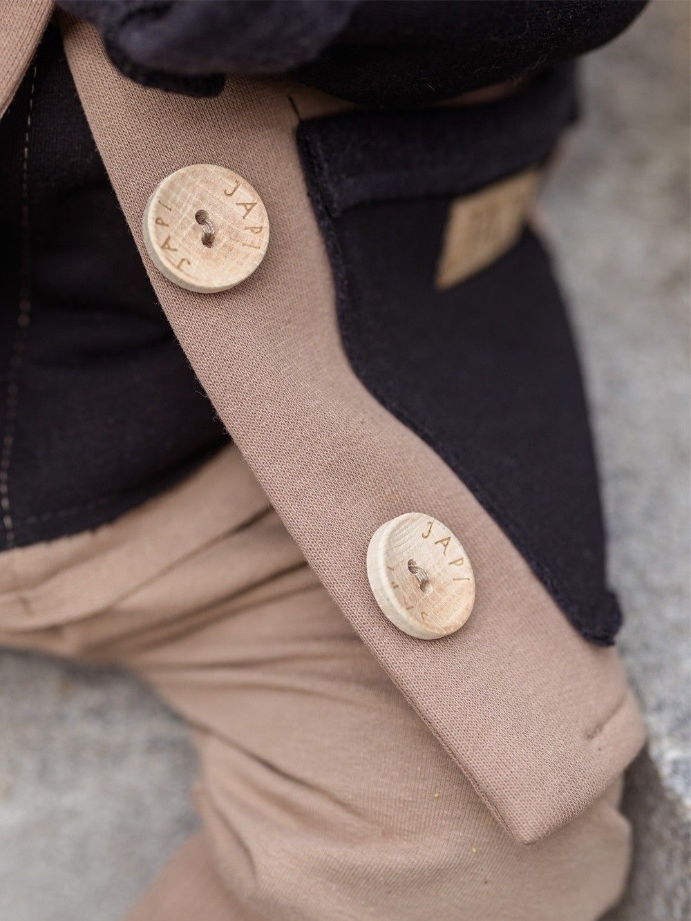 Muška dječja topla bundica s kapuljačom pogodna je za hladnije dane. Bundica je šivena od 100% pamučne deblje tkanine. Kombinacija boja smeđe i zelene s crnom djeluje moderno. Prednji džepovi, drveni gumbovi i kapuljača u stilu patuljka su jamstvo uspjeha.