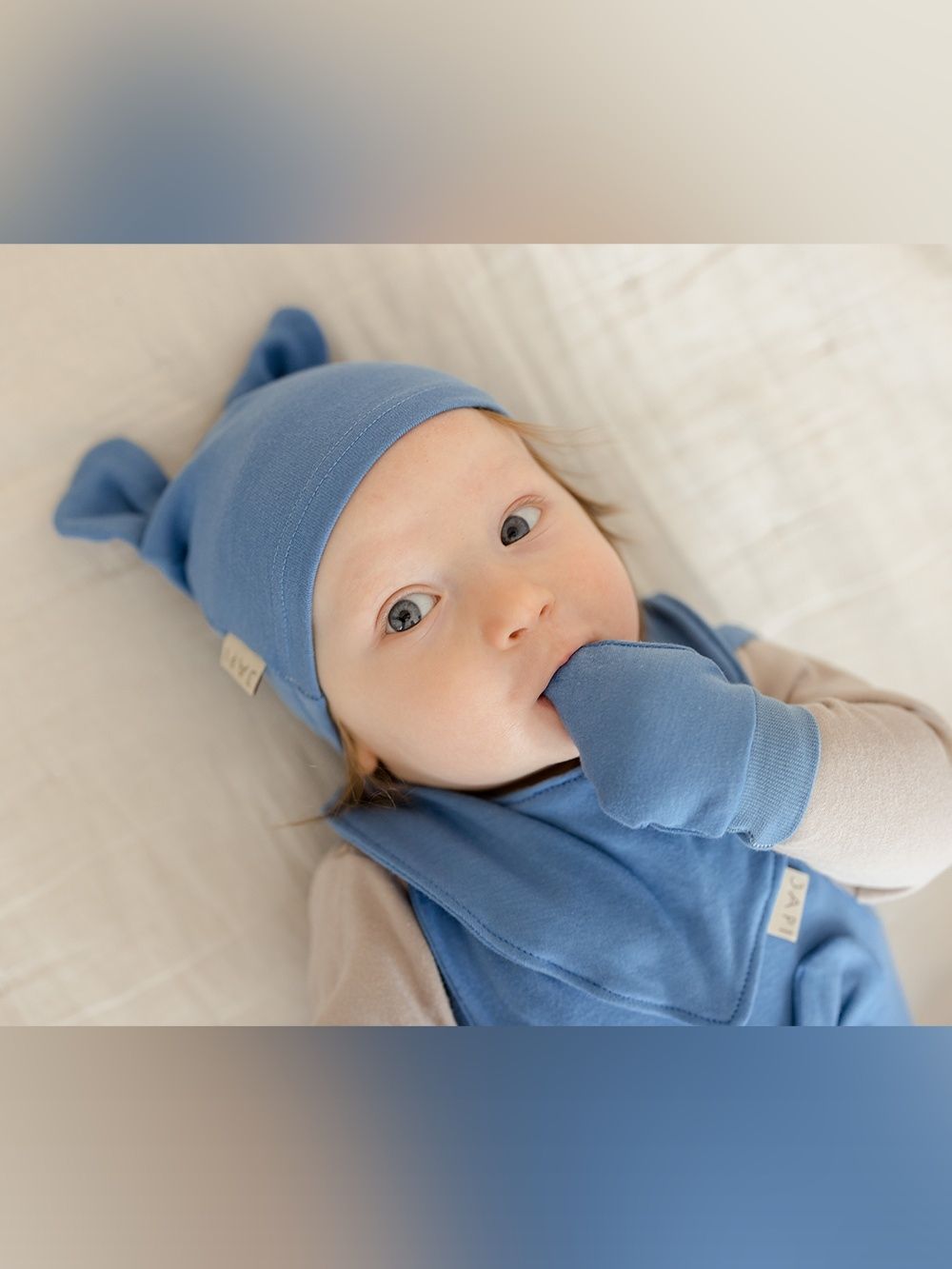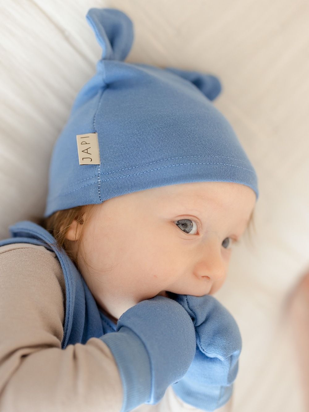 Kapa pokriva glavu i uši i tako štiti bebu od hladnoće i vjetra. Zajedno s rukavicama i slinčekom možete stvoriti usklađen set.