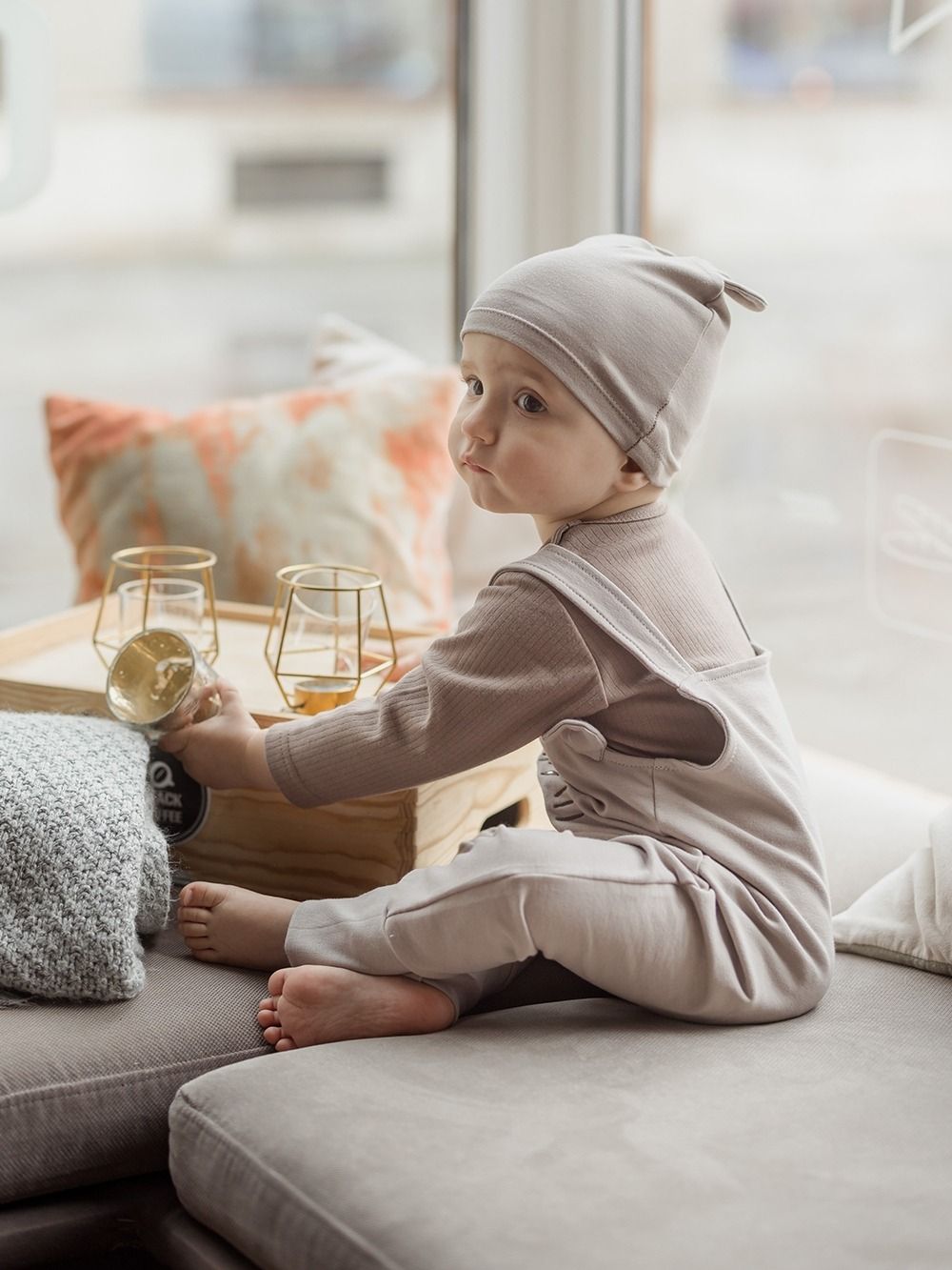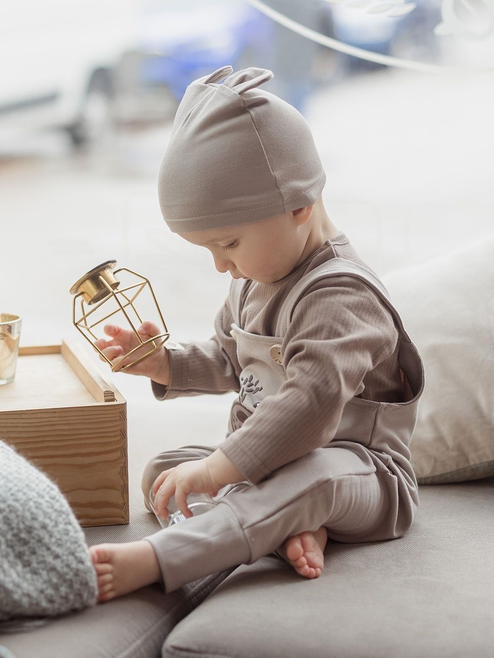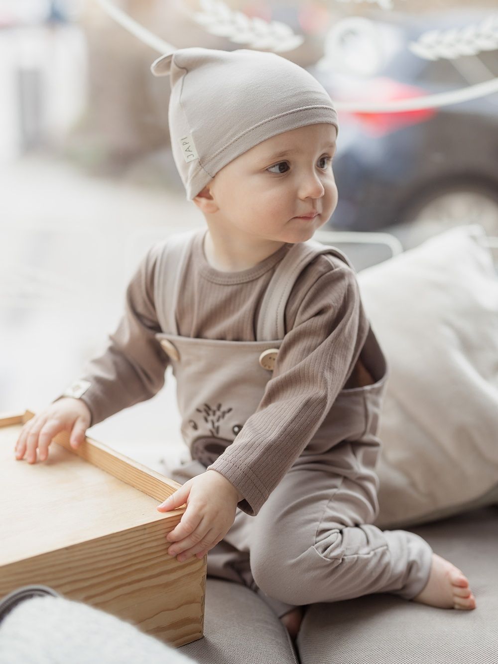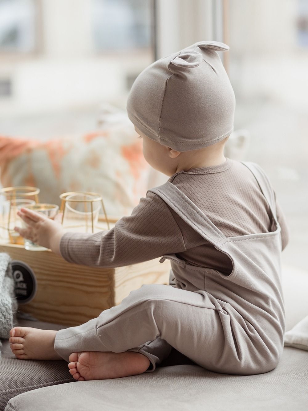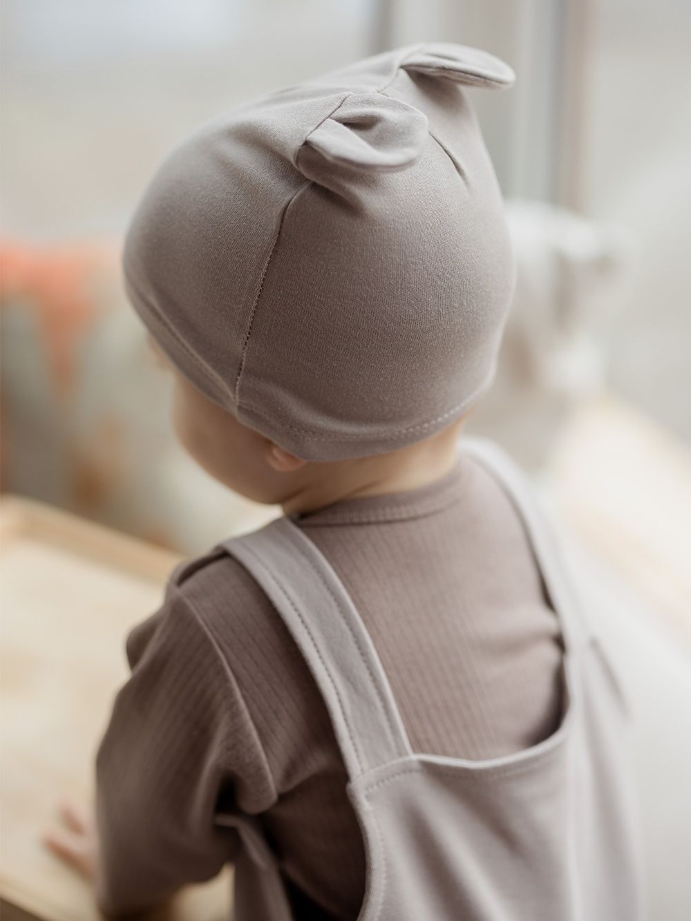 Pamučna kapa za bebe Kapa za bebe s ukusnim ušima. Udoban kroj, 100% pamuk. Nježno zaobilazi glavu i ne tiska. U dvije zemljane boje.