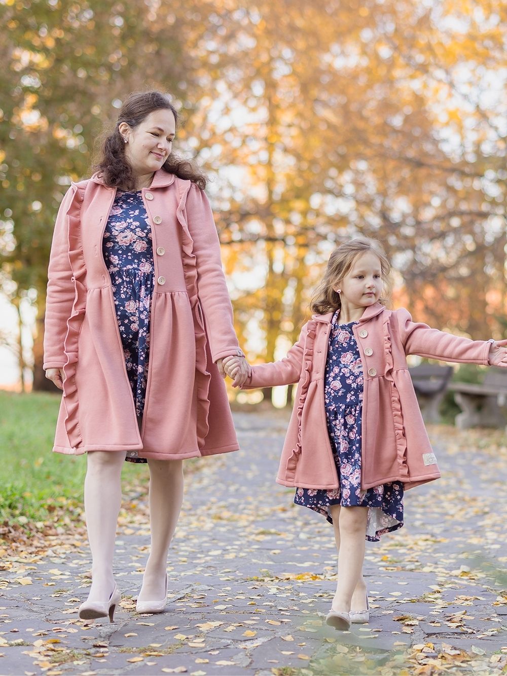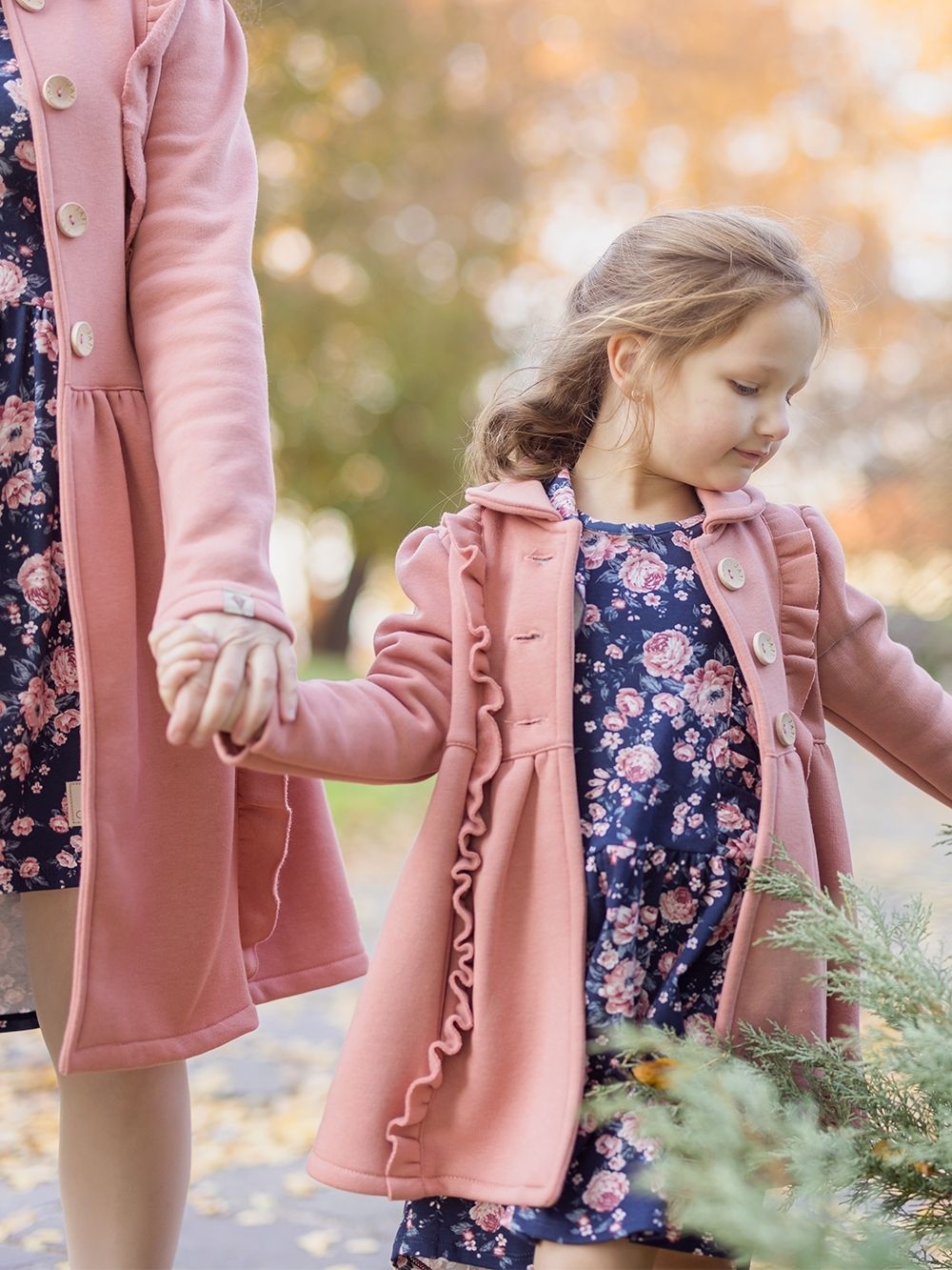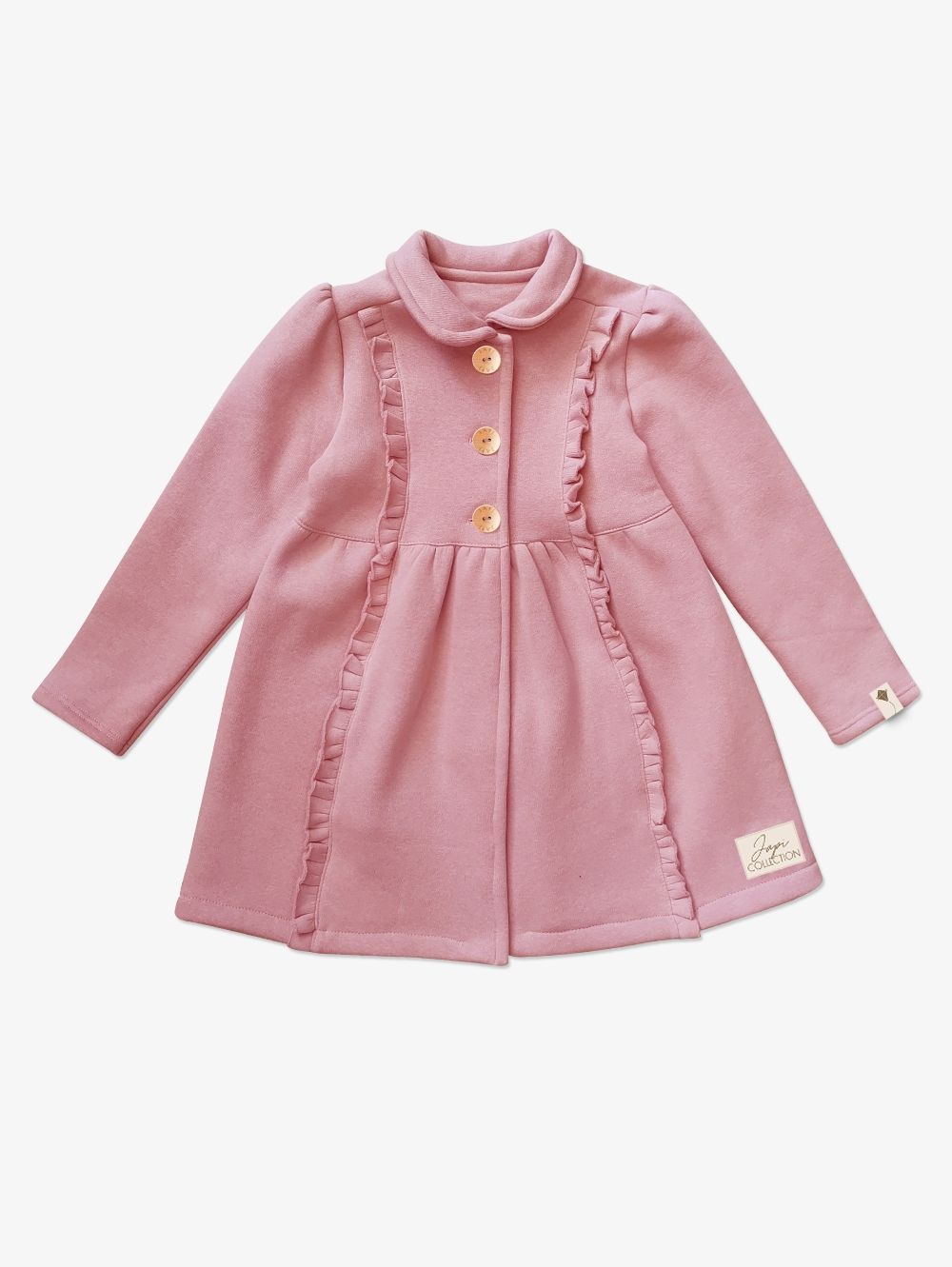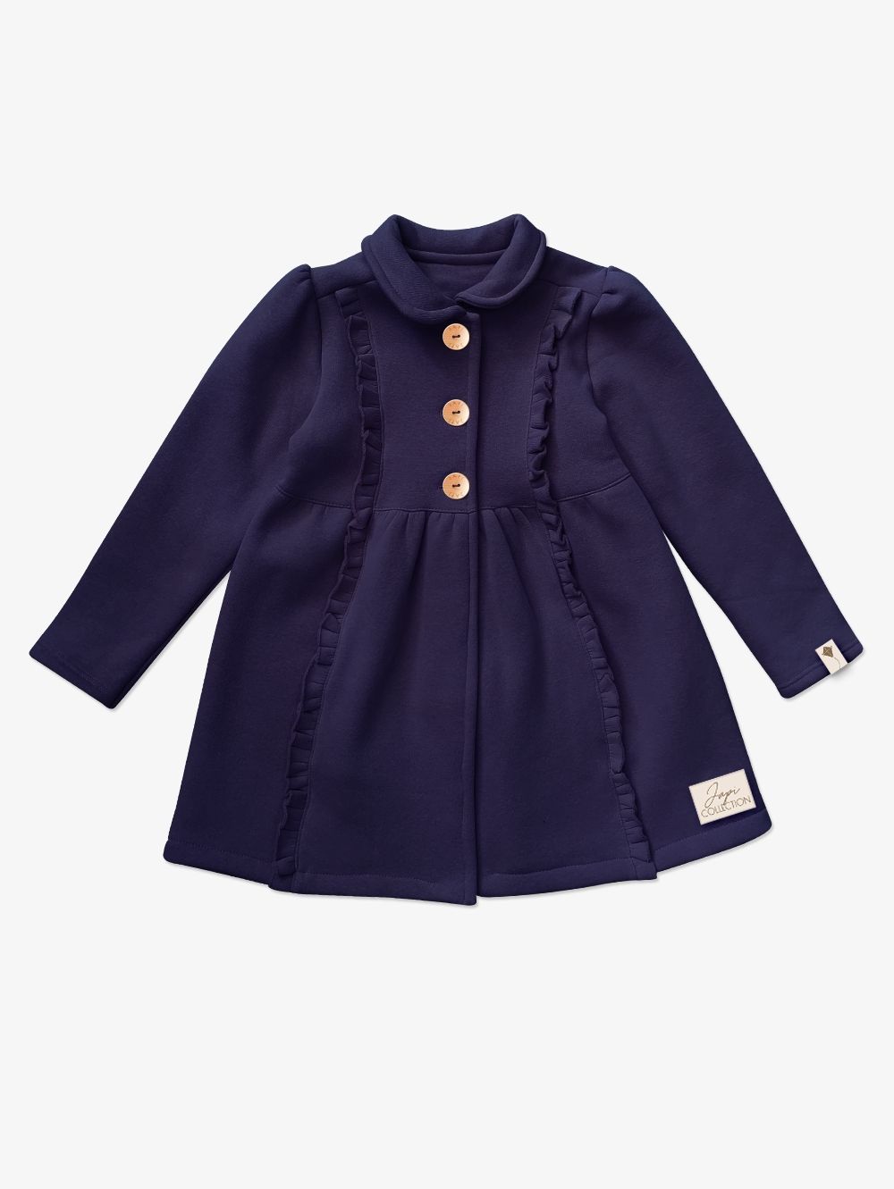 Djevojački kaput u jednoj boji Kaput za djevojke u dvije boje. Lijepa ružičasta ili tamnoplava. Koristit ćete ga u proljeće i jesen. Kaput je lijepog modernog kroja upotpunjenog volanima s prednje strane. Izrezan u struku i proširen prema dolje. Veliki drveni gumbi. Možete se uskladiti sa svojom kćeri, u ponudi nudimo i ženski kaput.