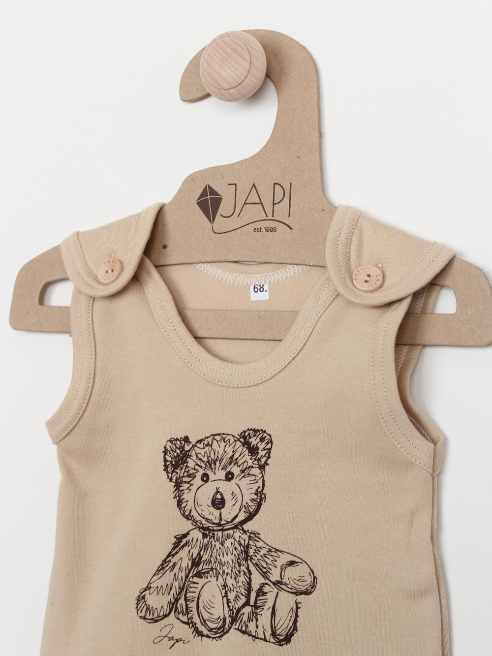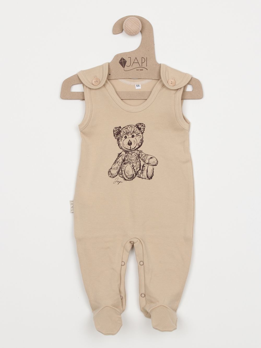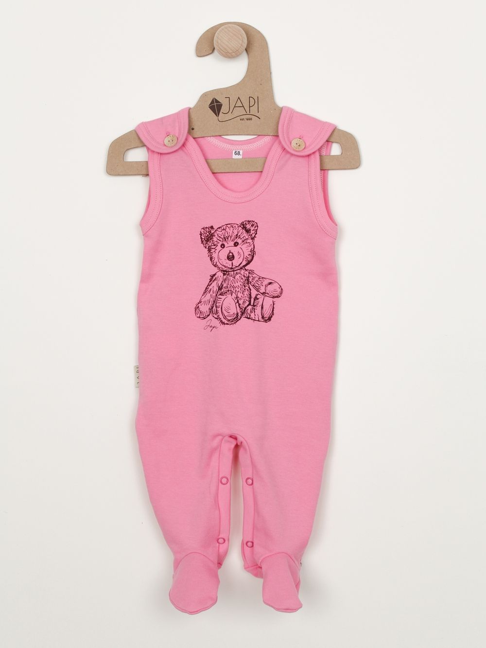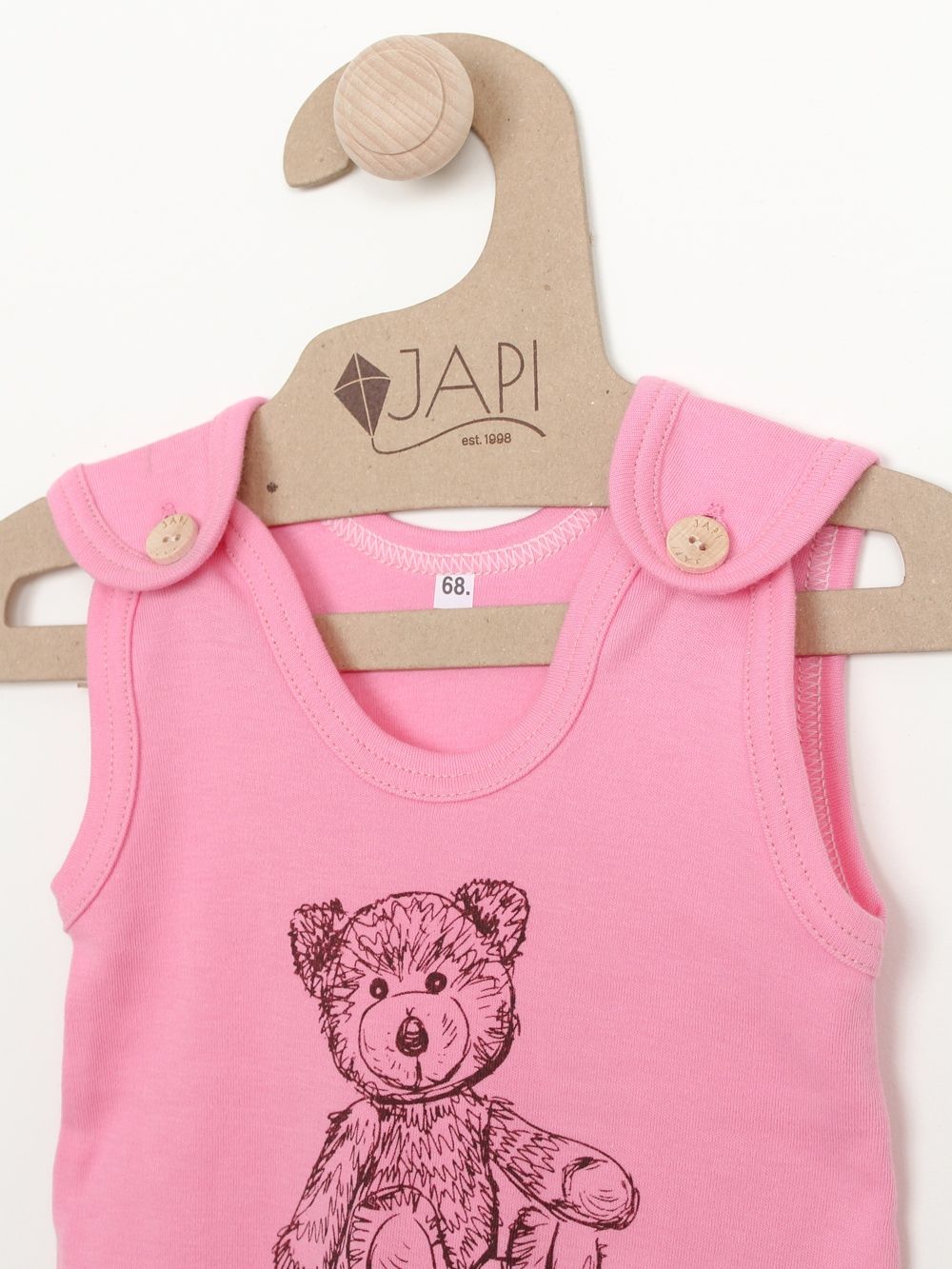 Kombinezoni bez rukava imaju print Teddy medvjediča na prednjem dijelu u smeđoj boji. Lijepo se ističe na običnoj pozadini ružičaste, plave i krem boje.