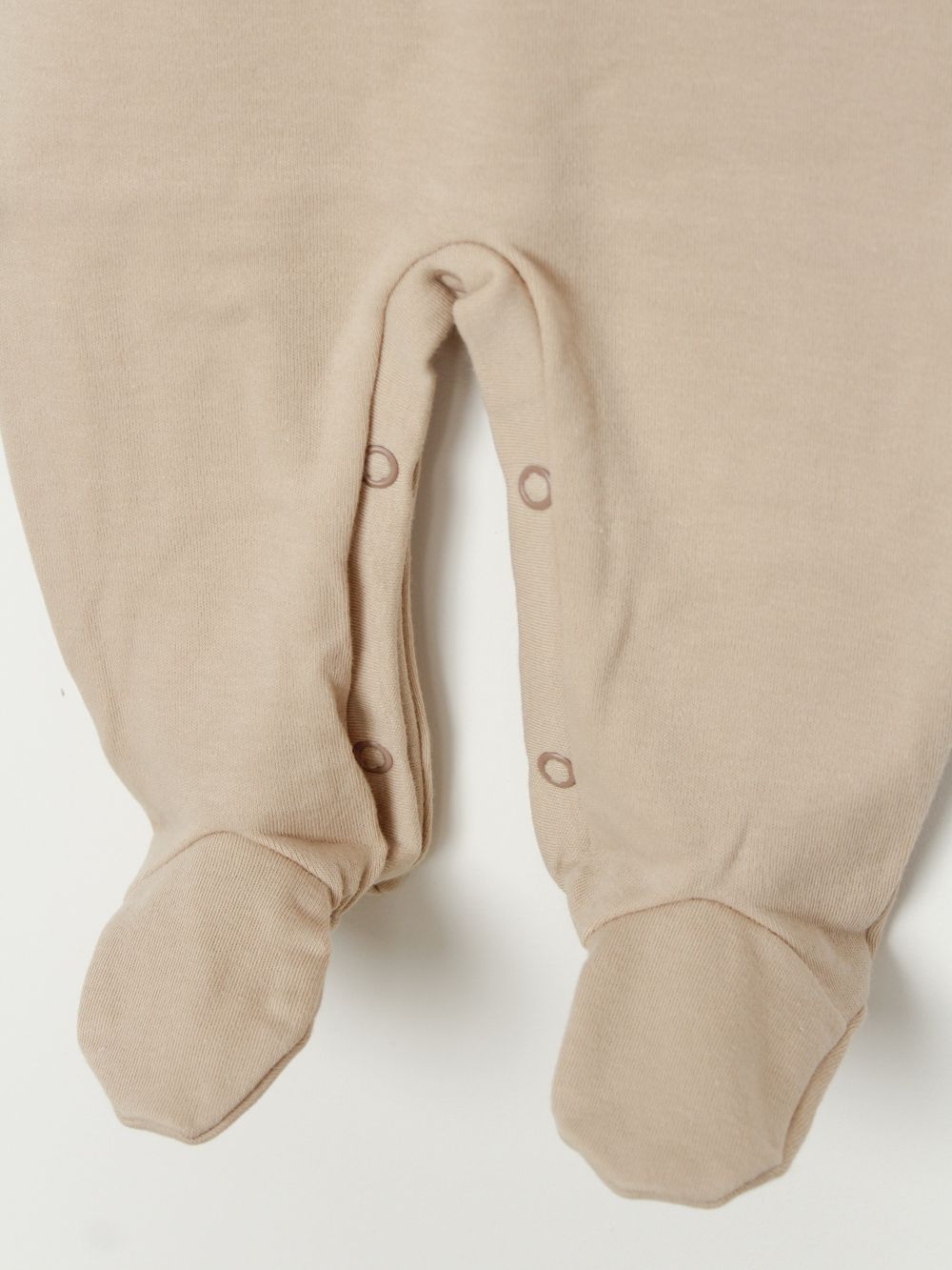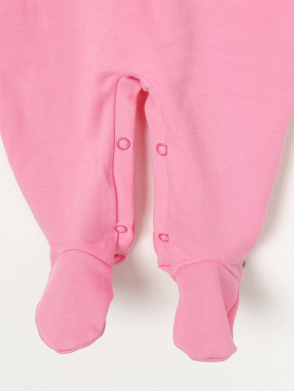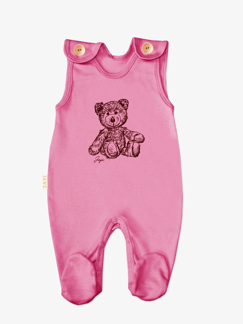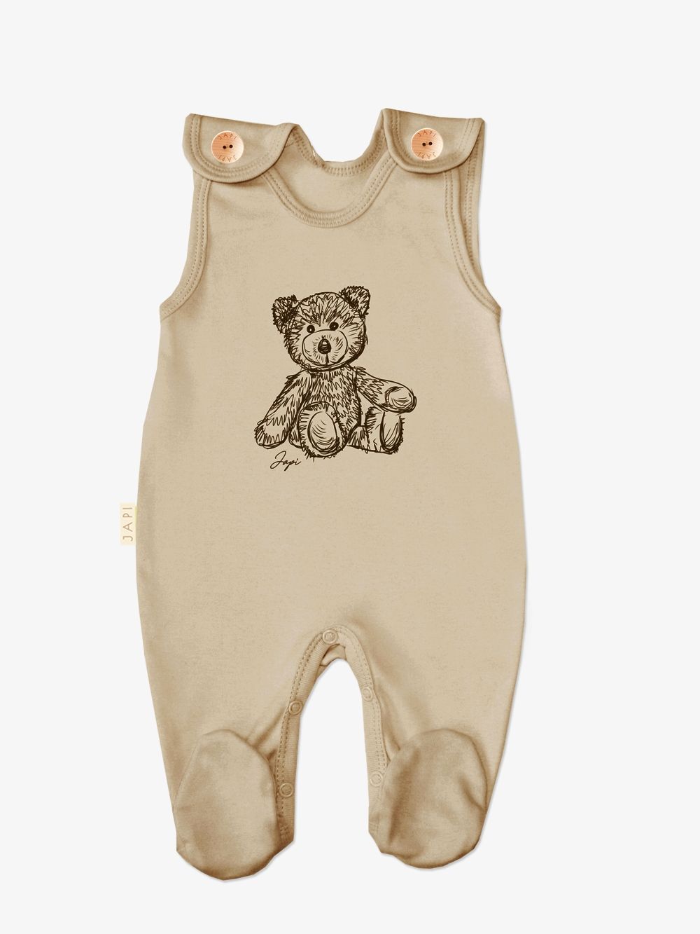 Kombinezoni bez rukava imaju print Teddy medvjediča na prednjem dijelu u smeđoj boji. Lijepo se ističe na običnoj pozadini ružičaste, plave i krem boje.