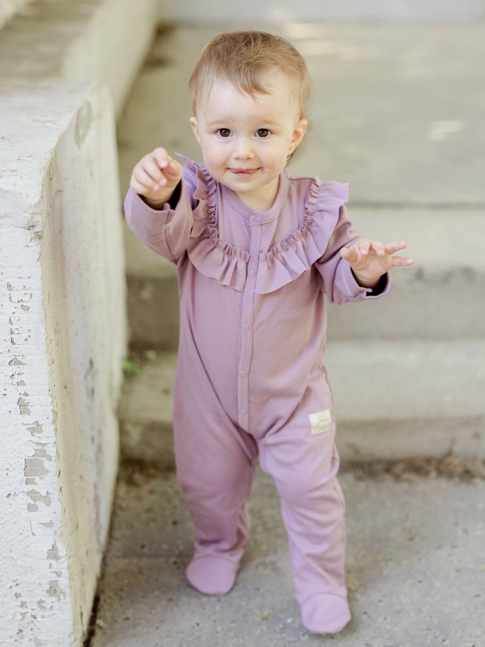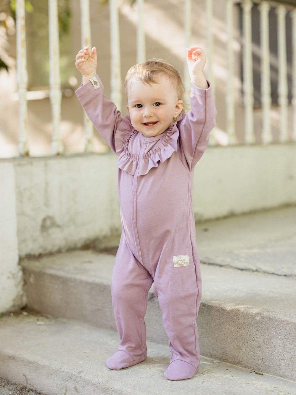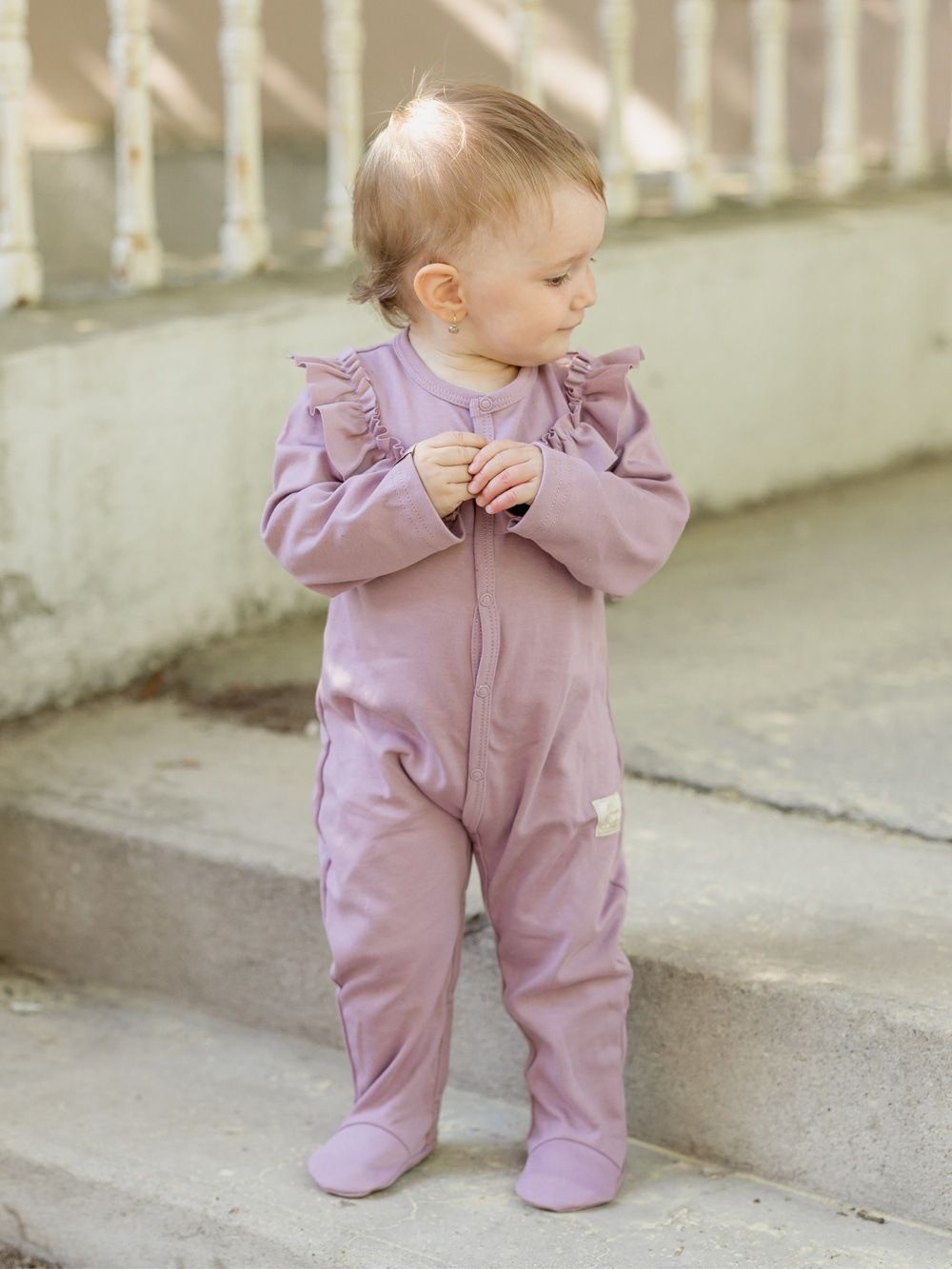 Dječji pamučni kombinezon udobnog kroja. Jednobojni kombinezon sa zakopčavanjem po cijeloj dužini za jednostavno oblačenje i mijenjanje pelena. Dopunjen volanom u gornjem dijelu. Pamučni kombinezon je praktičan komad odjeće za najmlađe, koji štiti cijelo dječje tijelo. Dostupan u dvije nijanse ružičaste boje.