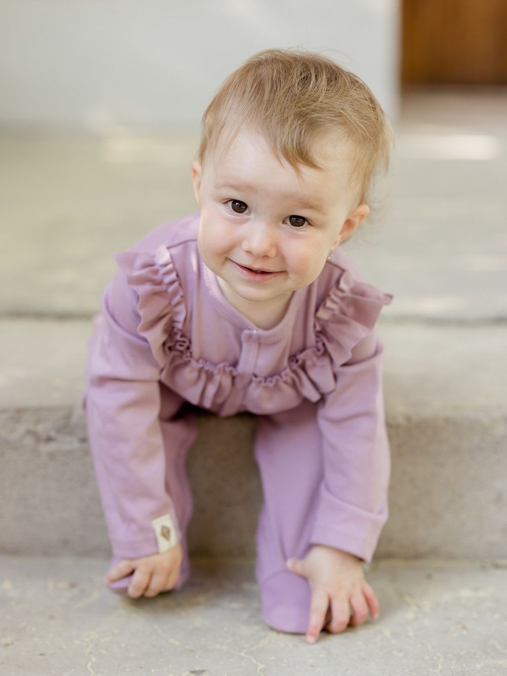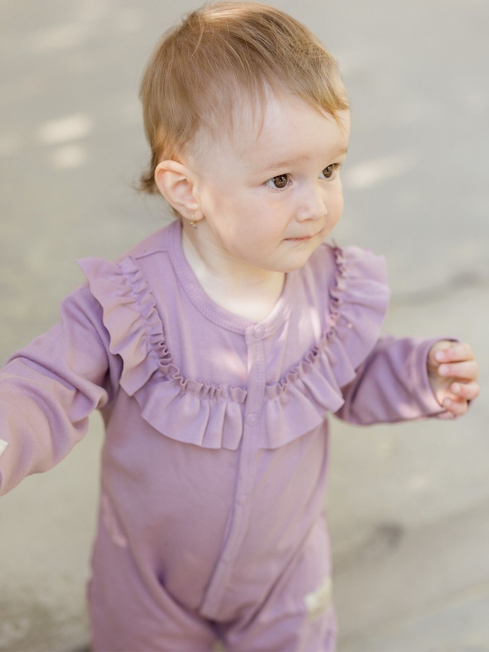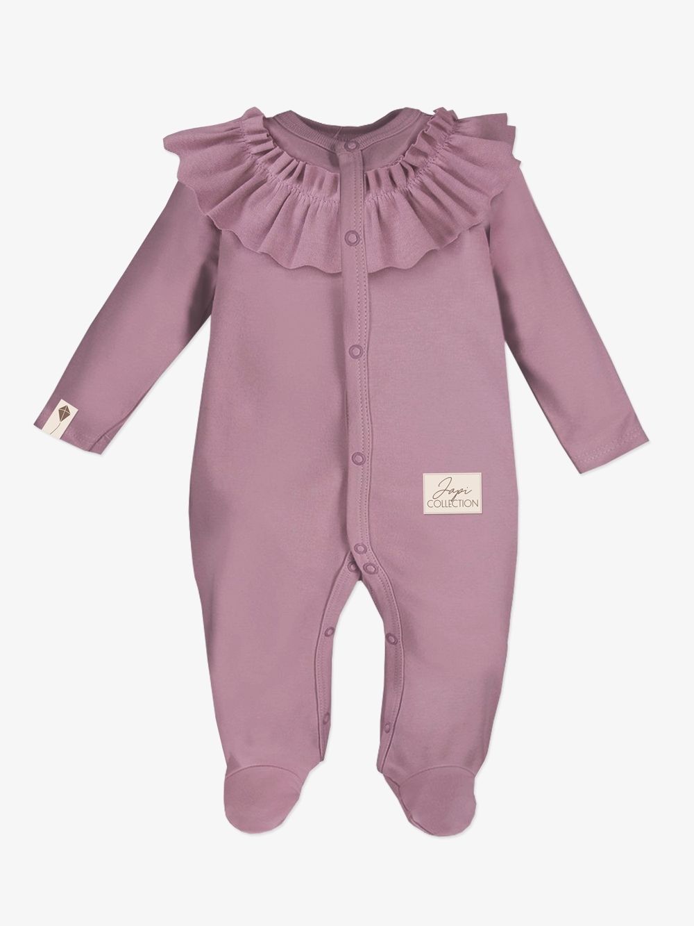 Dječji pamučni kombinezon udobnog kroja. Jednobojni kombinezon sa zakopčavanjem po cijeloj dužini za jednostavno oblačenje i mijenjanje pelena. Dopunjen volanom u gornjem dijelu. Pamučni kombinezon je praktičan komad odjeće za najmlađe, koji štiti cijelo dječje tijelo. Dostupan u dvije nijanse ružičaste boje.