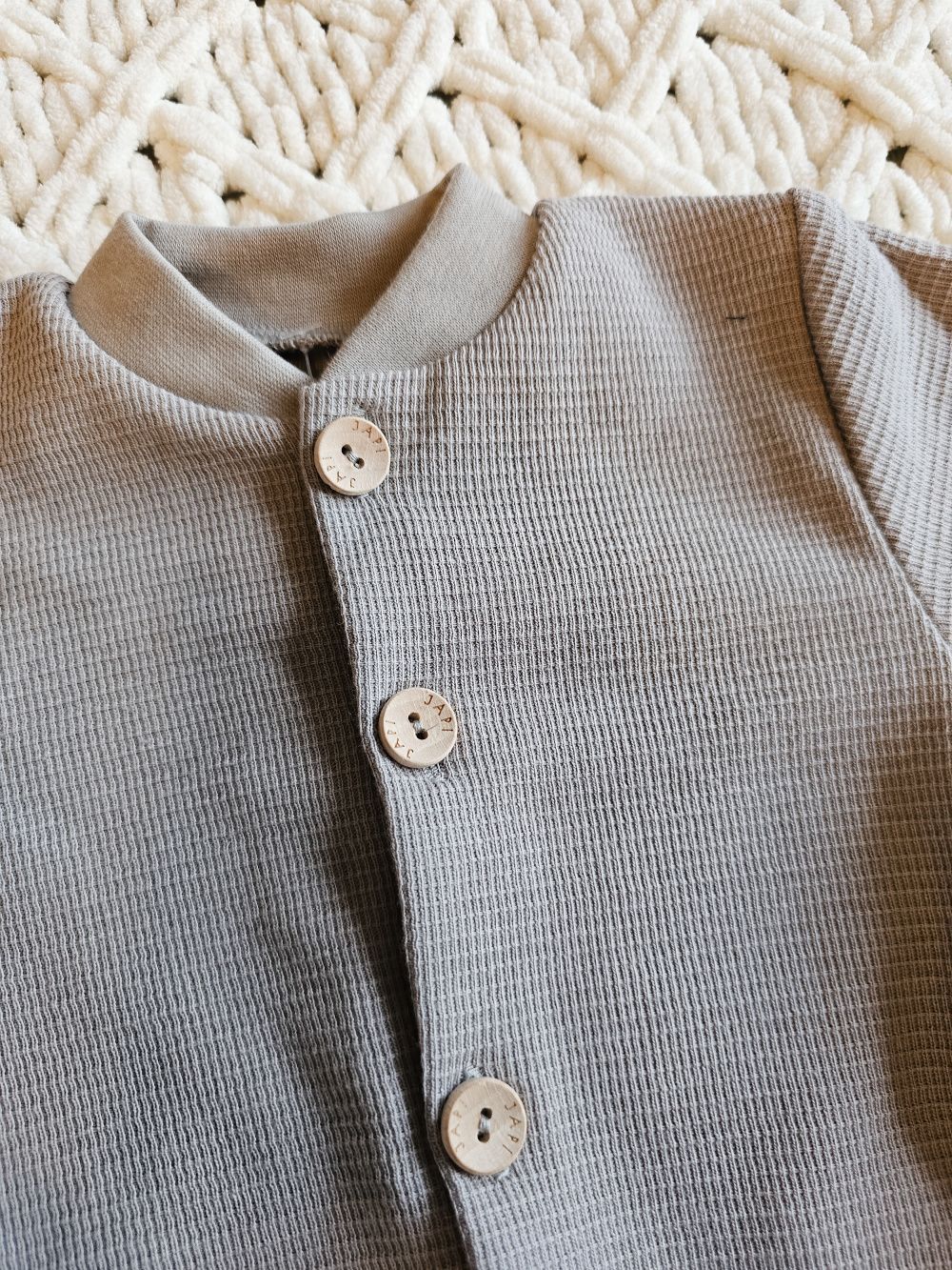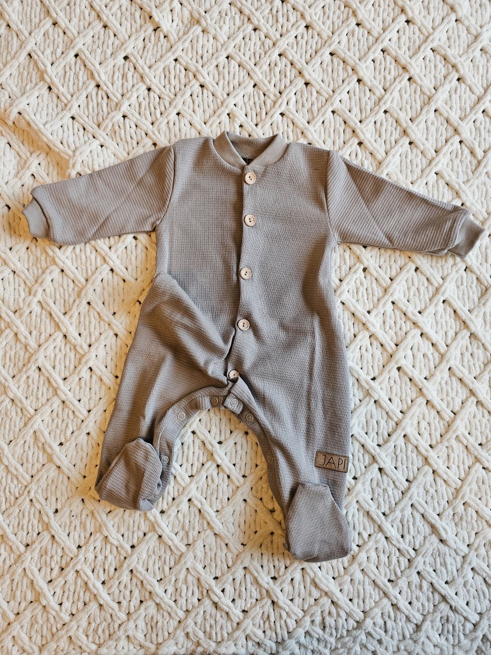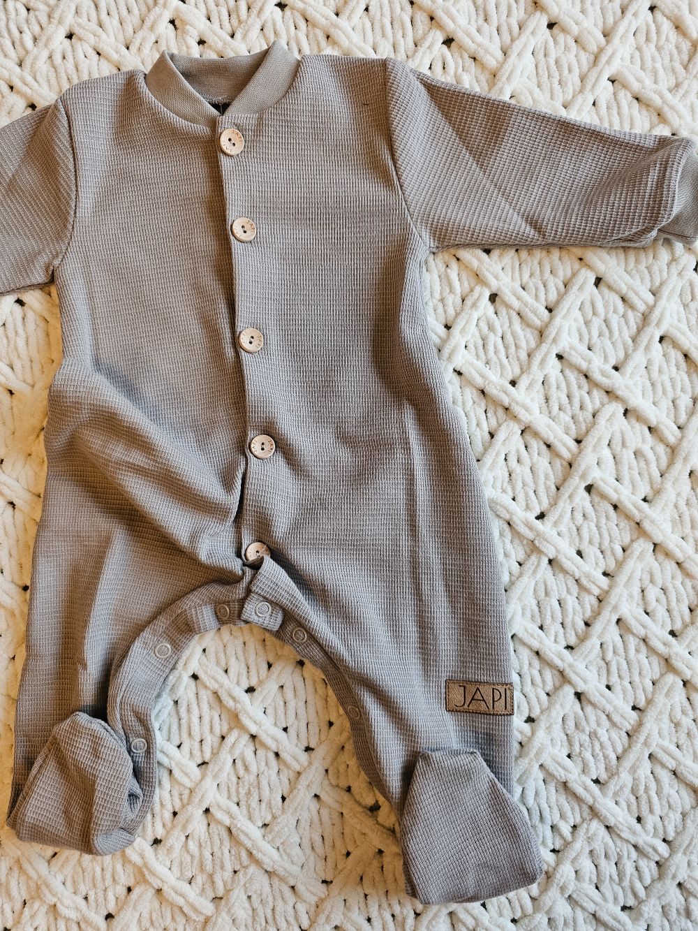 Ugodan kombinezon dugih rukava od mekane waffle tkanine, pogodan i za najmanju djecu i novorođenčad. Kombinezon dugih rukava je pogodan i za spavanje. Udoban kroj čini ga omiljenim komadom. Otvara se po cijeloj dužini drvenim gumbima, a između nogu također kopčama. Olakšava odijevanje i presvlačenje beba. Kombinezon dugih rukava će grijati bebu, to je odjeća za cijelo tijelo koju se beba neće skidati. Naravno, šivamo visokokvalitetne rubove po obodu.