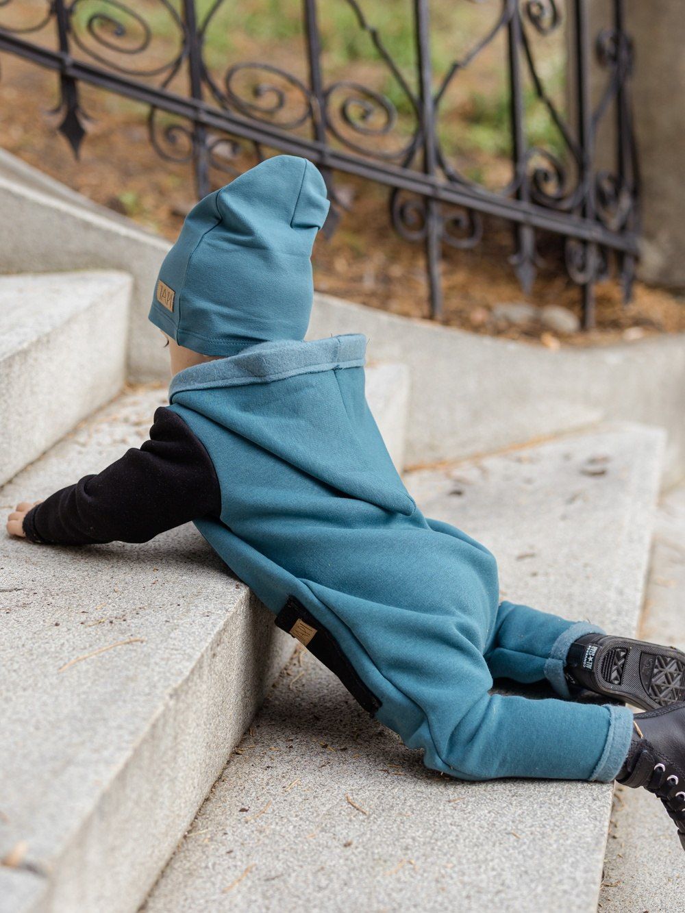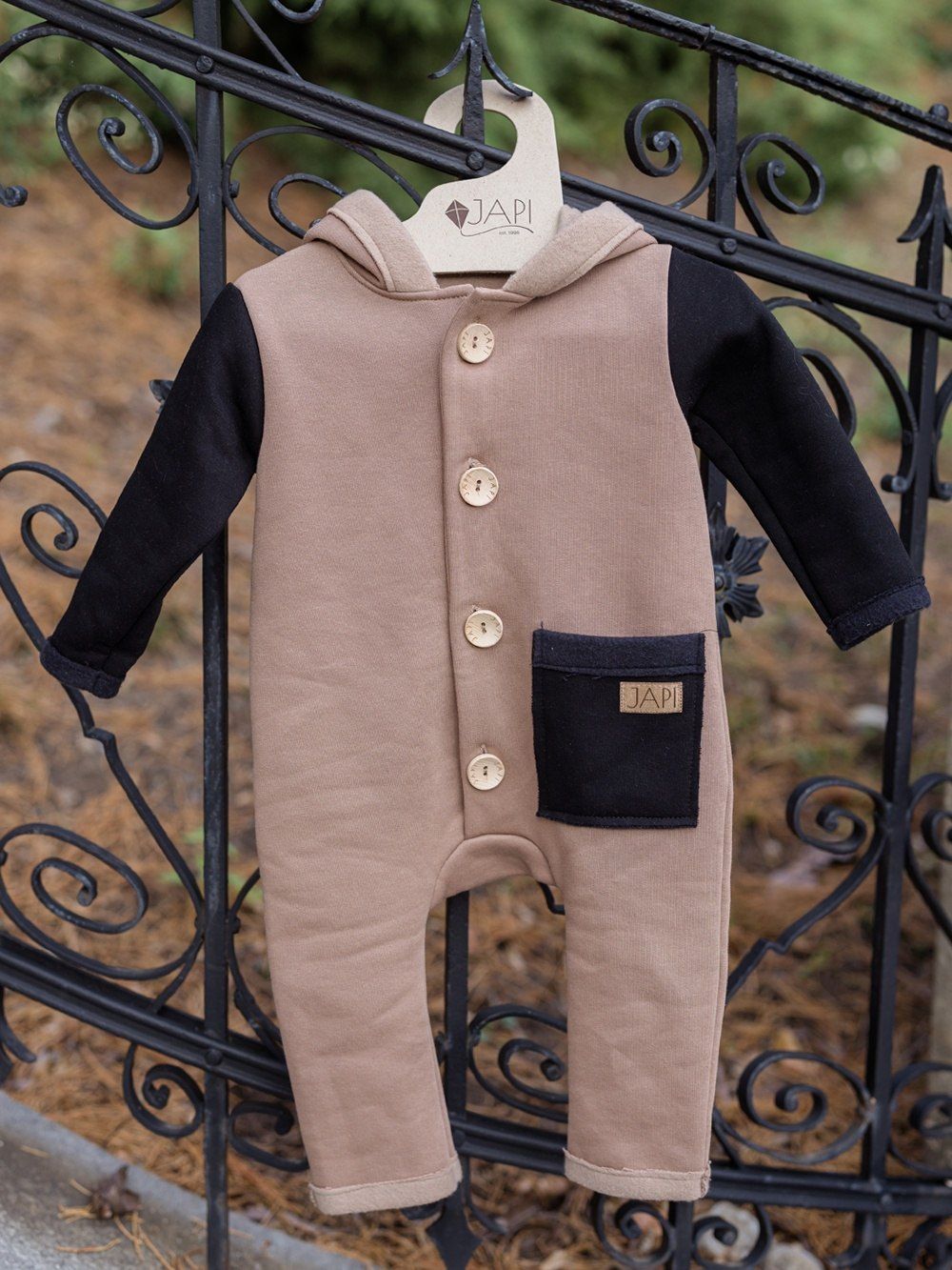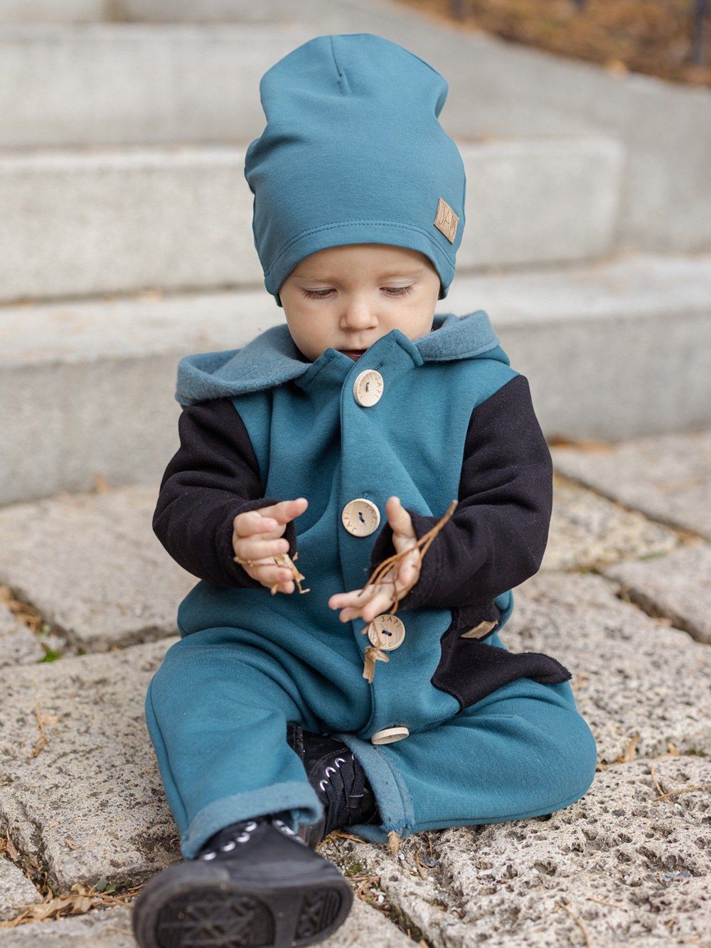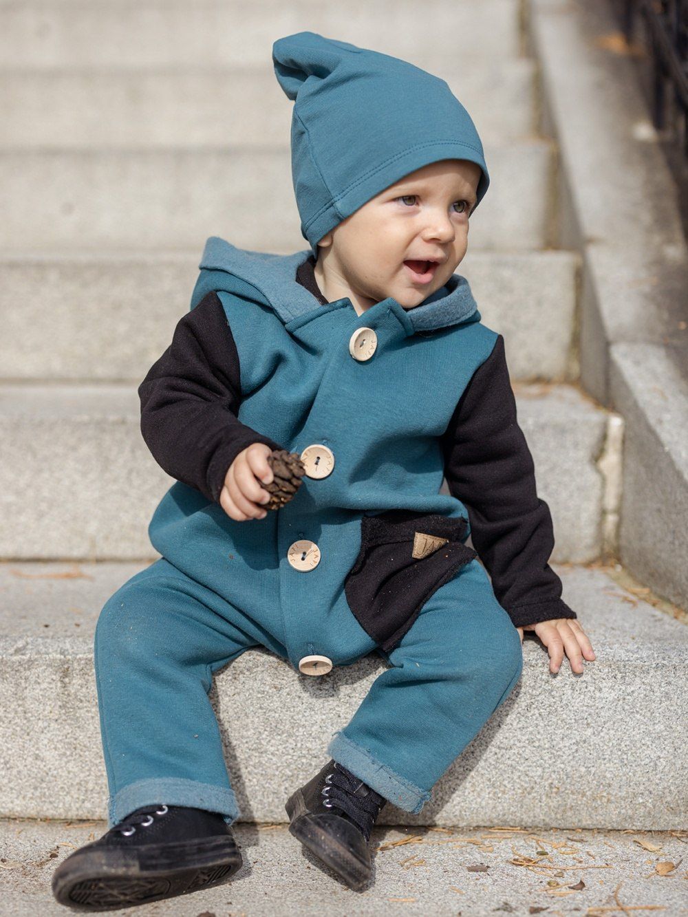 Kontrastni dodaci kao što je džep ili rukavi, ovaj kombinezon čine jedinstvenim. Kapuljača u stilu patuljka djeluje vrlo slatko. Drveni gumbovi te skladna prišivka s logom dopunjuju ukupan ugodan dojam. Ovaj kombinezon će Vam se svidjeti a koristiti ćete ga uglavom u jesen i proljeće.