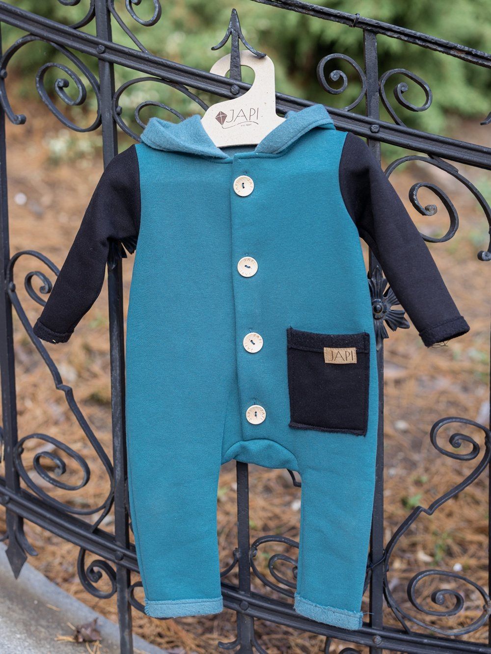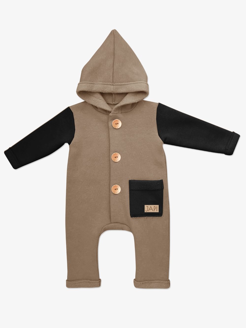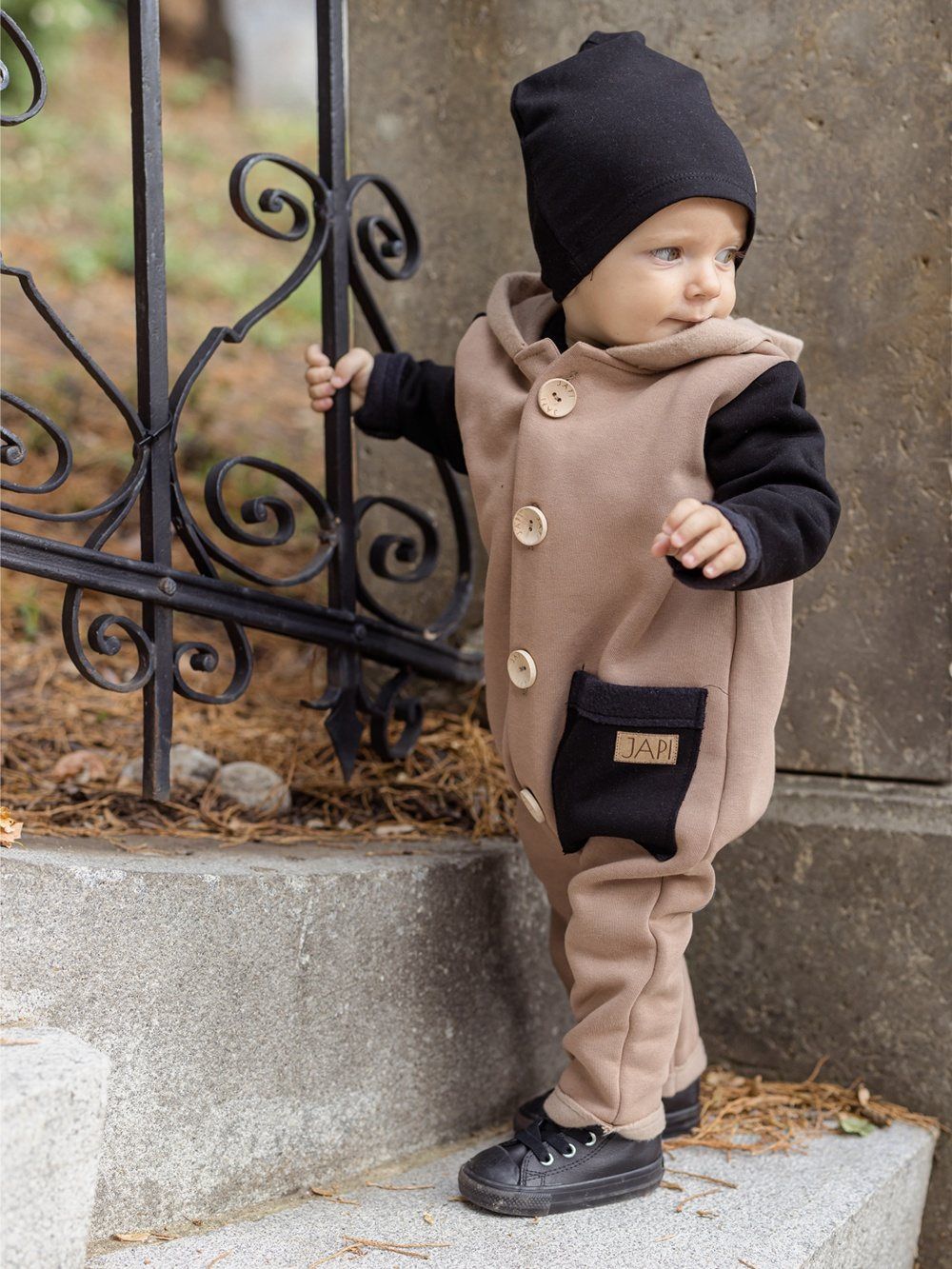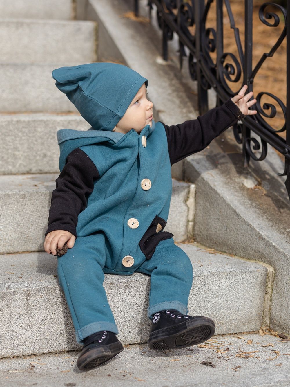 Kontrastni dodaci kao što je džep ili rukavi, ovaj kombinezon čine jedinstvenim. Kapuljača u stilu patuljka djeluje vrlo slatko. Drveni gumbovi te skladna prišivka s logom dopunjuju ukupan ugodan dojam. Ovaj kombinezon će Vam se svidjeti a koristiti ćete ga uglavom u jesen i proljeće.