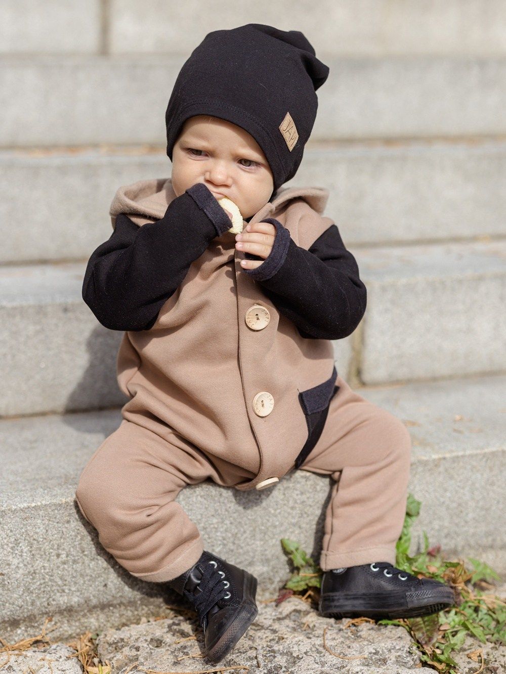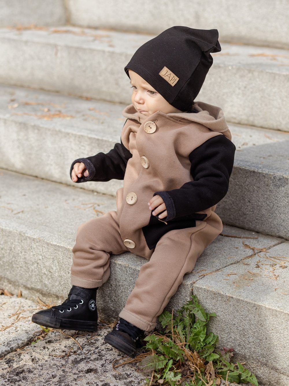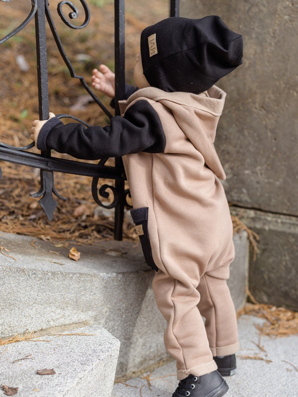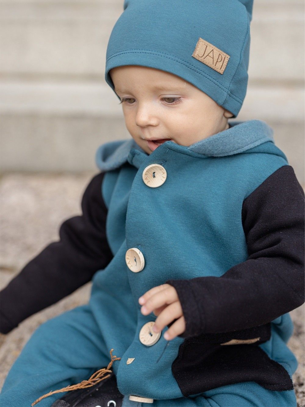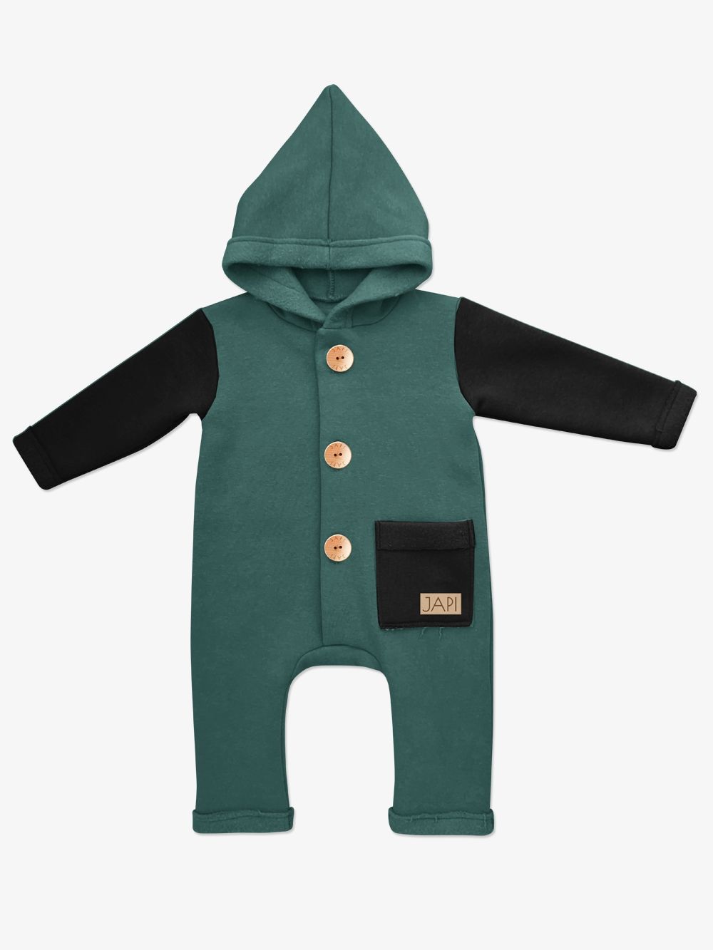 Kontrastni dodaci kao što je džep ili rukavi, ovaj kombinezon čine jedinstvenim. Kapuljača u stilu patuljka djeluje vrlo slatko. Drveni gumbovi te skladna prišivka s logom dopunjuju ukupan ugodan dojam. Ovaj kombinezon će Vam se svidjeti a koristiti ćete ga uglavom u jesen i proljeće.
