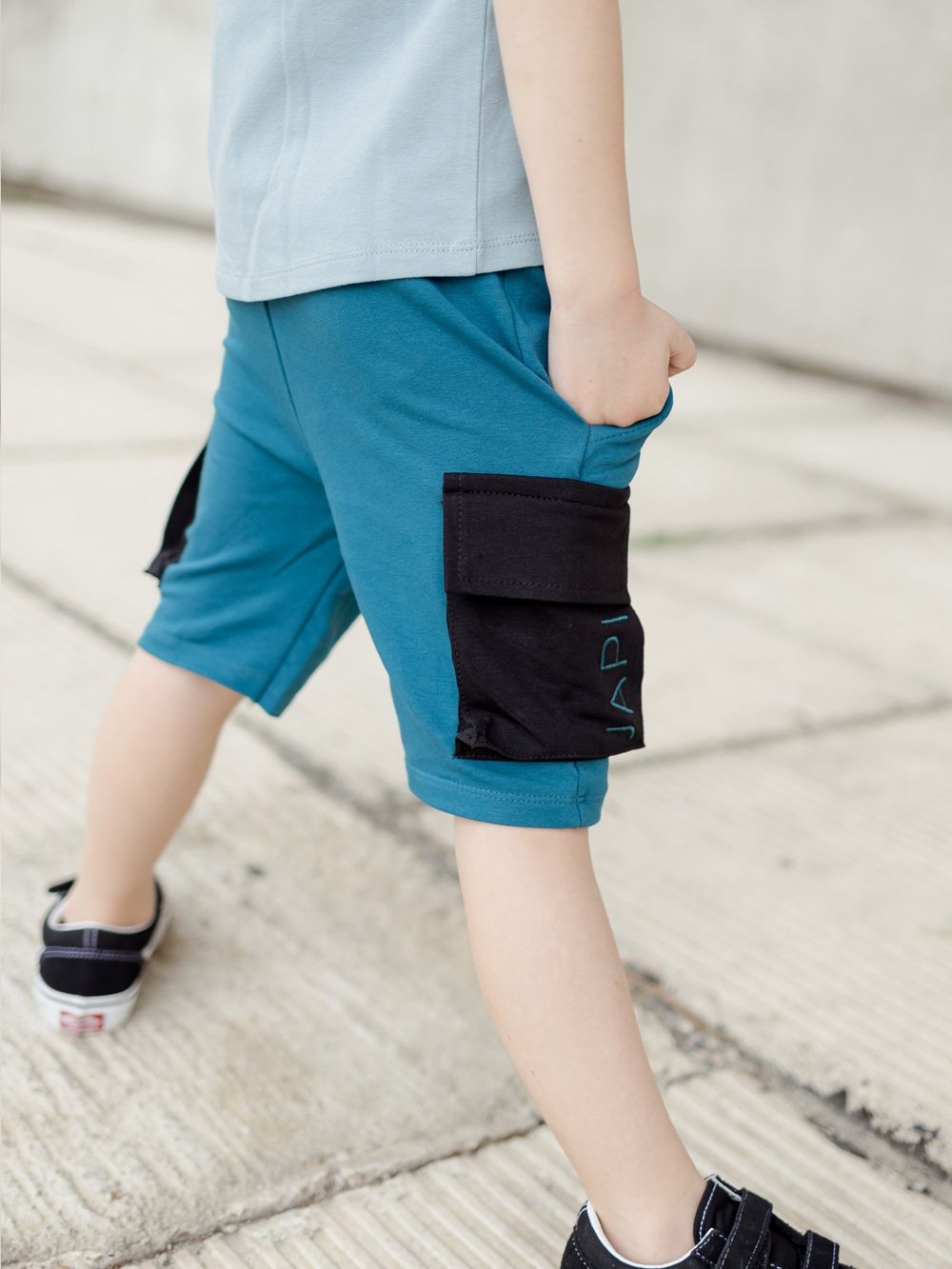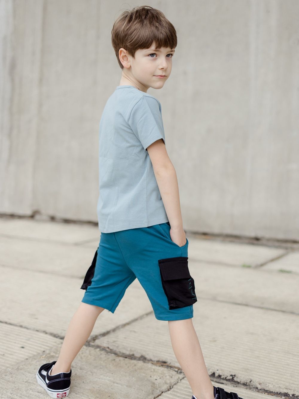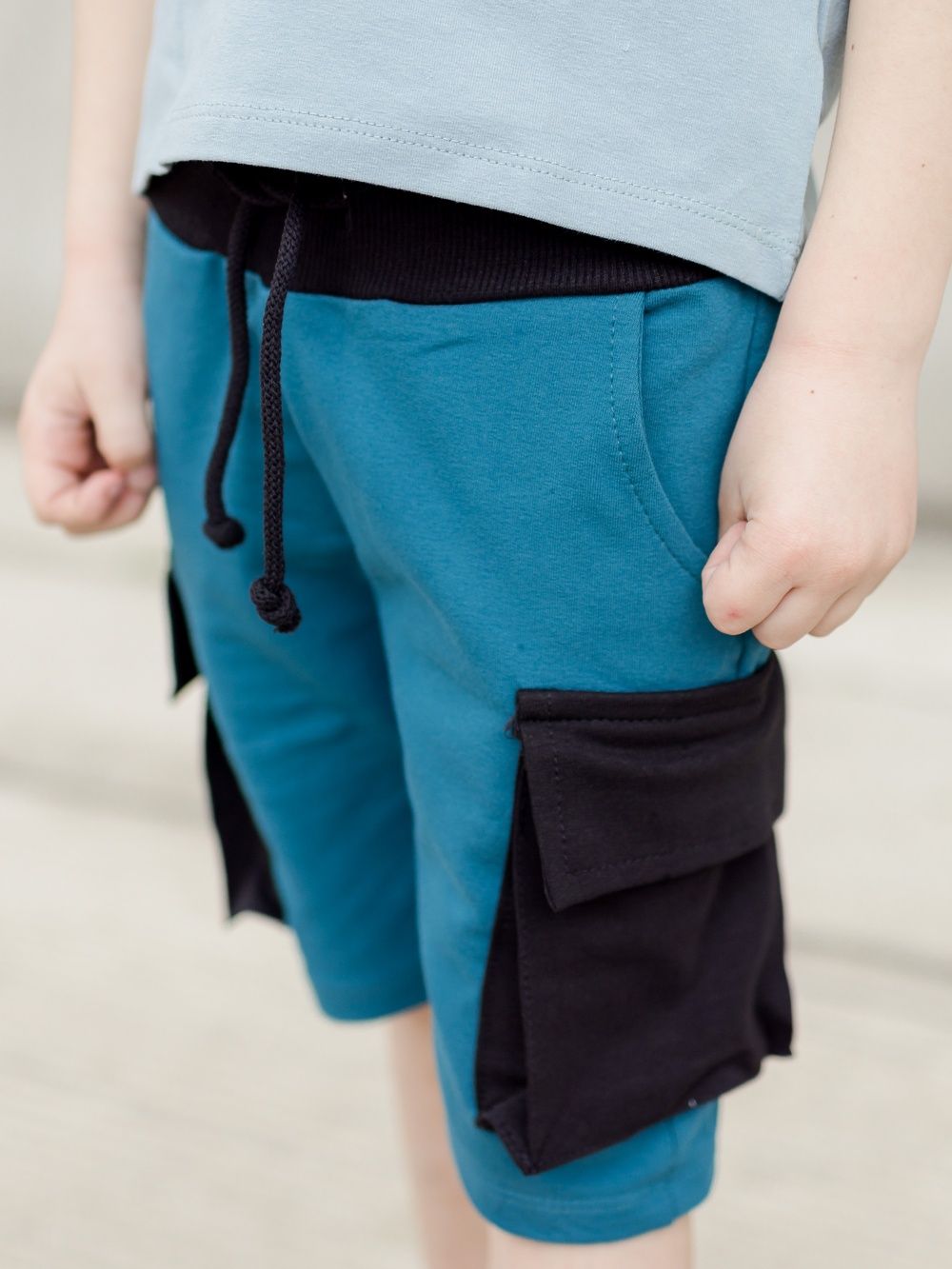 Muške kratke hlače u dvije kombinacije boja. Kratke hlače imaju udoban slobodniji kroj, širi pas za stezanje i zavezivanje. Imaju klasične džepove, te na bokovima velike stilske džepove u kontrastnoj boji s preklopom. Popularan primjerak za dječake za ljeto. Možete uskladiti tatu i sina te kupiti kratke hlače i u veličinama za odrasle. Ove kratke hlače će se dječacima svidjeti, vrlo su stilske i praktične za svakodnevno nošenje.