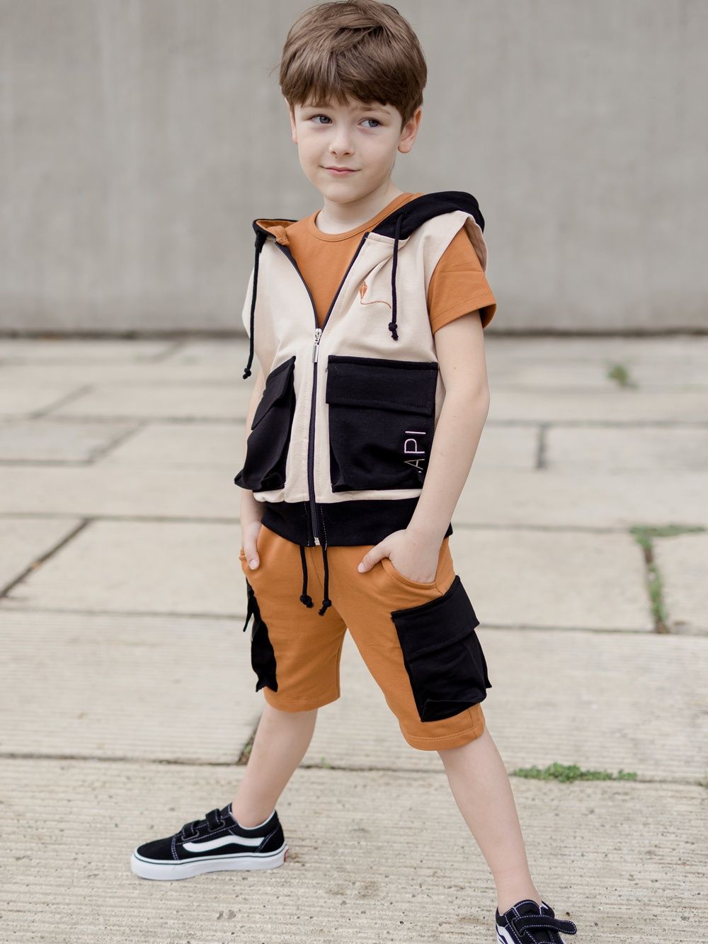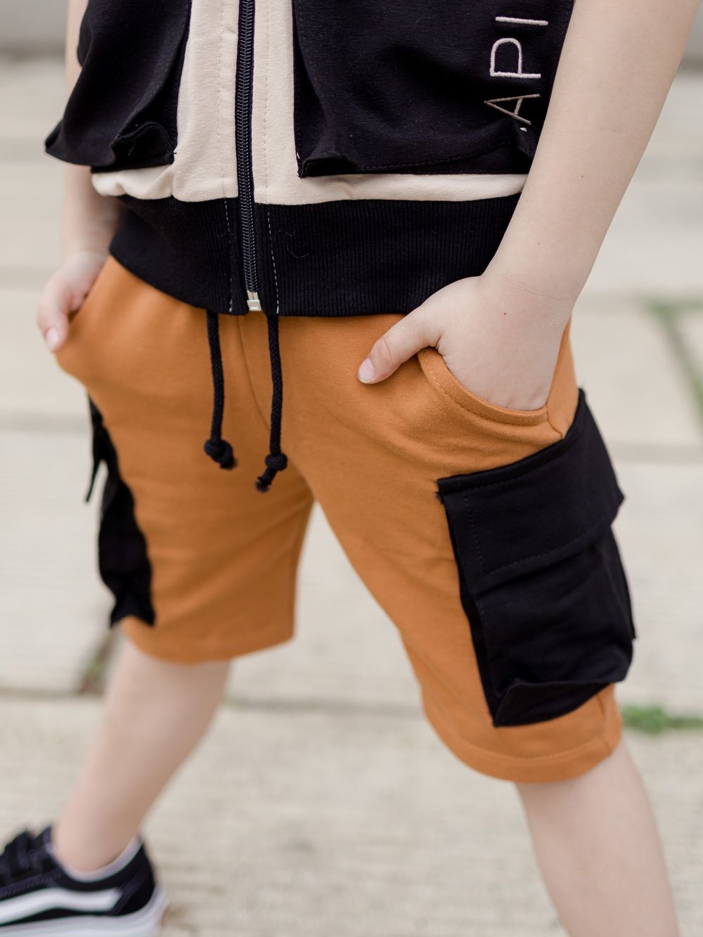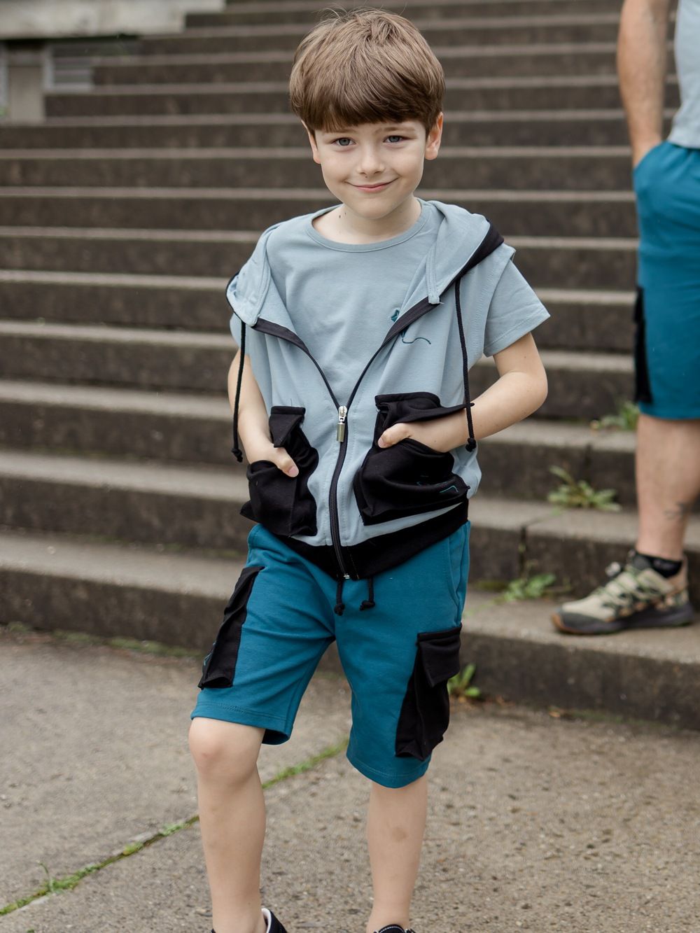 Muške kratke hlače u dvije kombinacije boja. Kratke hlače imaju udoban slobodniji kroj, širi pas za stezanje i zavezivanje. Imaju klasične džepove, te na bokovima velike stilske džepove u kontrastnoj boji s preklopom. Popularan primjerak za dječake za ljeto. Možete uskladiti tatu i sina te kupiti kratke hlače i u veličinama za odrasle. Ove kratke hlače će se dječacima svidjeti, vrlo su stilske i praktične za svakodnevno nošenje.