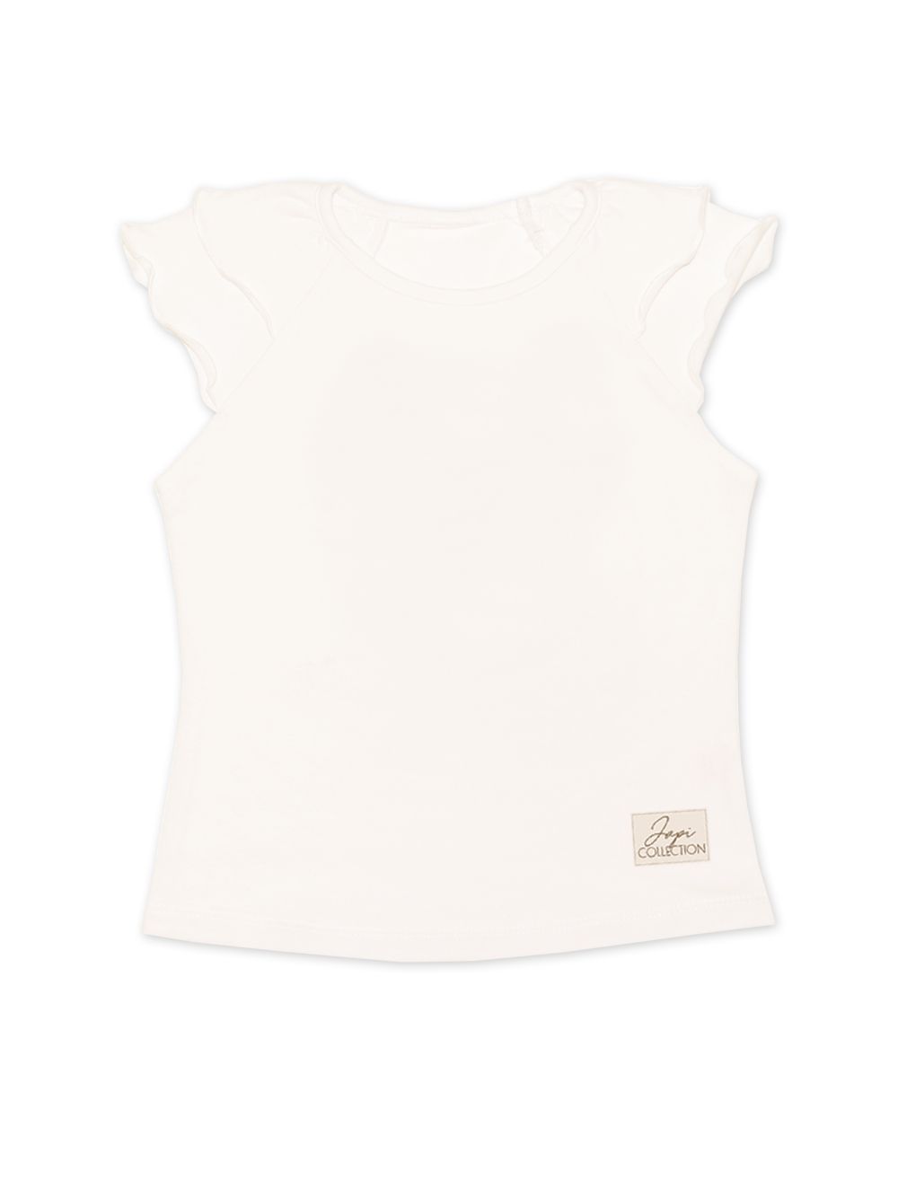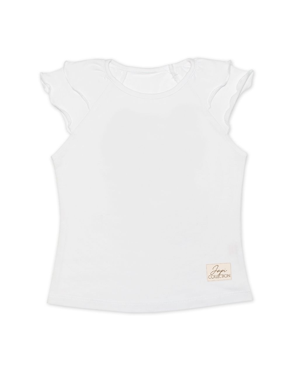 Bijela i puter djevojačka majica udobnog kroja kao osnovni komad. Pogodna za kombiniranje uz suknju, tajice ili ispod haljine i uz traperice. Majica ima lučni izrez, a rukavi su našiveni u obliku volana. Dostupne u veličinama od 92 do 140.