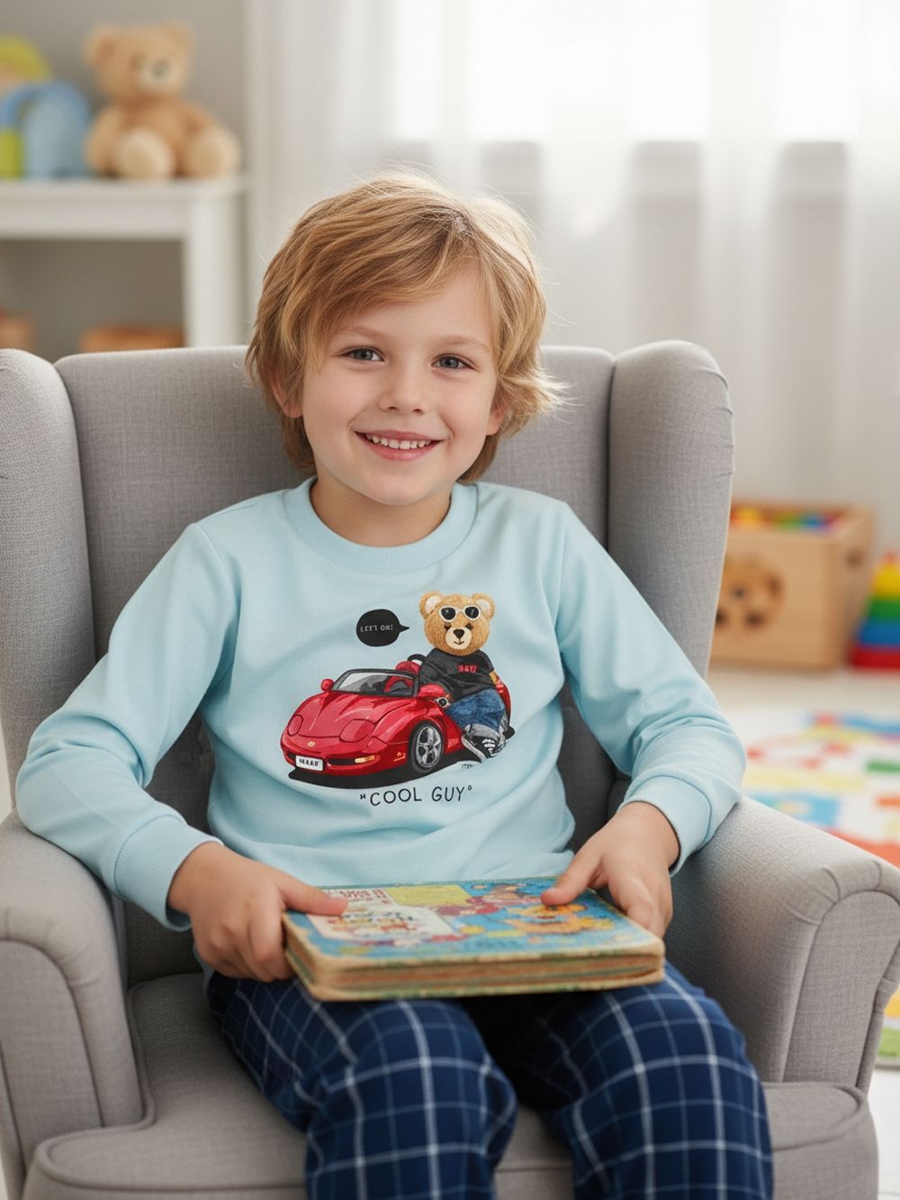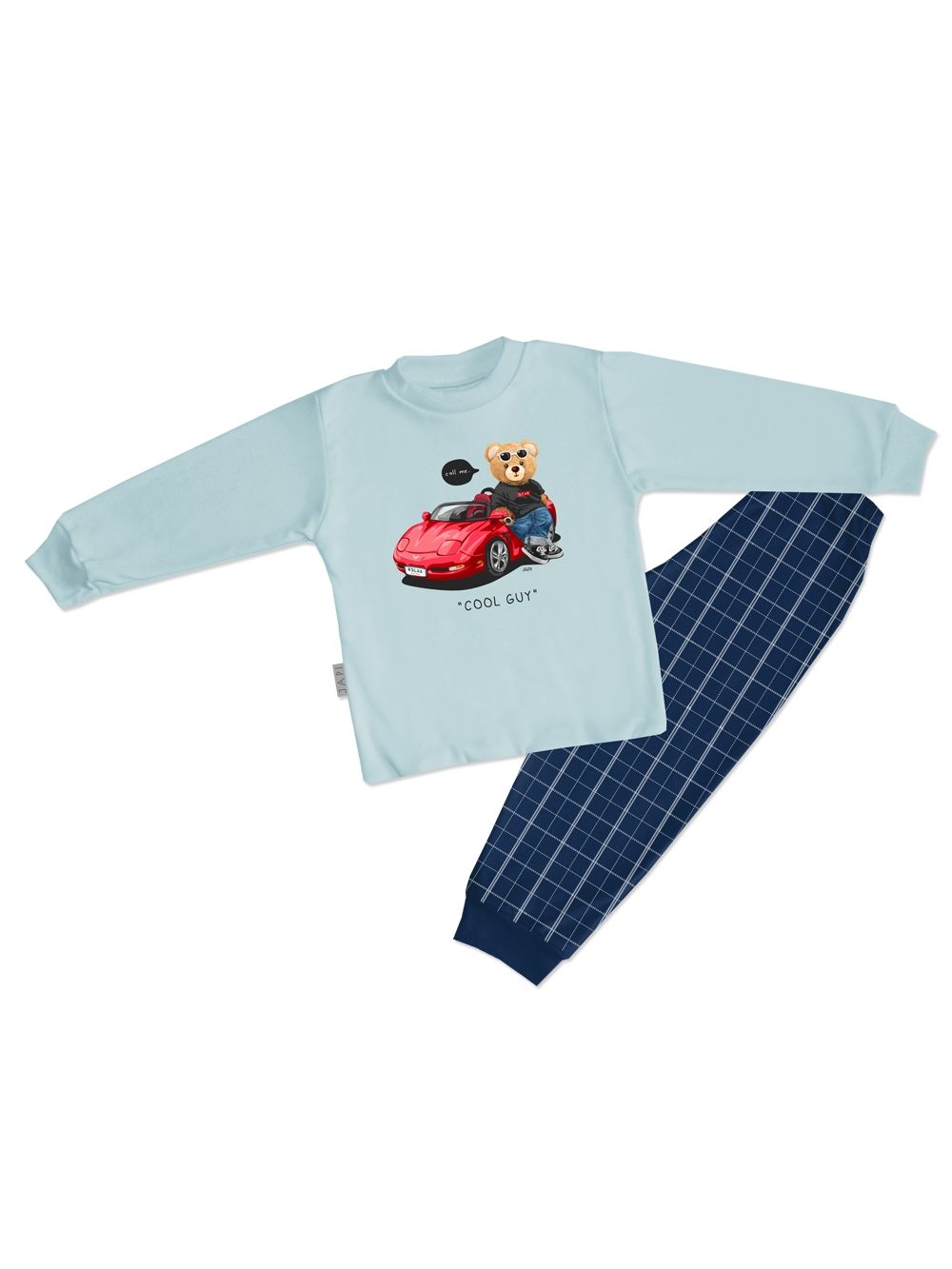 Stilska dječja pidžama za dječake s crvenim autom COOL GUY savršen je izbor za male ljubitelje automobila. Gornji dio krasi vesela ilustracija medvjedića koji sjedi na sportskom automobilu s natpisom. Izrađena od mekane pamuka, pidžama pruža udobnost cijelu noć i nježna je prema dječjoj koži. Tamnoplave hlače s bijelim kariranim uzorkom i elastičnim pojasom osiguravaju slobodu kretanja i udobno nošenje. Pidžama za dječake ima duge rukave i hlače, idealne za hladnije noći.