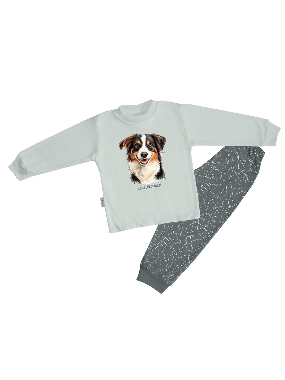 Preslatka dječja pidžama za dječake s motivom psa GUARDIAN idealna je za svakodnevno spavanje i večernje opuštanje. Gornji dio ukrašen je realističnim printom psa s natpisom „Guardian of Night“. Izrađena od visokokvalitetnog pamuka, mekana je i prozračna. Tamnosive hlače ukrašene su decentnim grafičkim uzorkom i imaju elastičan pojas za maksimalnu udobnost. Dugi rukavi i nogavice pružaju toplinu u hladnijim noćima. Pidžama za dječake ima udoban kroj koji ne ograničava kretanje. Savršen izbor za svakog mališana koji voli životinje.