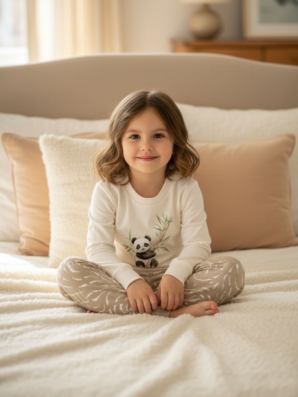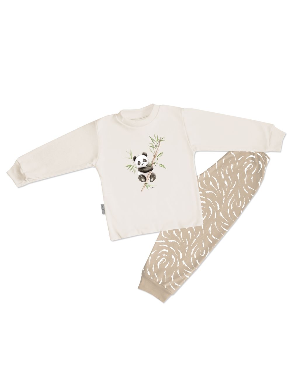 Preslatka dječja pidžama za djevojčice s motivom pande. Gornji dio krasi detaljna ilustracija pande koja sjedi na bambusu. Pidžama je izrađena od mekane i prozračne pamuka koja osigurava udobnost i nježna je prema dječjoj koži. Bež hlače s apstraktnim uzorkom i elastičnim pojasom omogućuju slobodu kretanja tijekom sna i igre. Dugi rukavi i nogavice pružaju toplinu tijekom hladnijih noći. Zahvaljujući razigranom dizajnu, ova pidžama nije samo udobna, već i moderna.