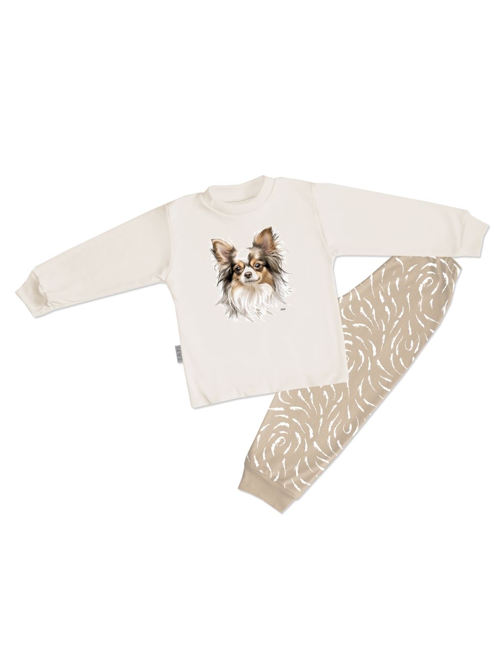 Preslatka djevojačka pidžama s motivom psića PAPPILON. Gornji dio krasi realistična ilustracija dugodlakog psa papillon, što cijeloj pidžami daje nježan i simpatičan izgled. Pidžama je izrađena od mekane i prozračne pamuka, koja pruža udobnost tijekom cijele noći i nježna je prema osjetljivoj dječjoj koži. Bež hlače s apstraktnim uzorkom i elastičnim pojasom omogućuju slobodu kretanja tijekom spavanja i igre. Dugi rukavi i hlače pružaju toplinu tijekom hladnijih večeri.